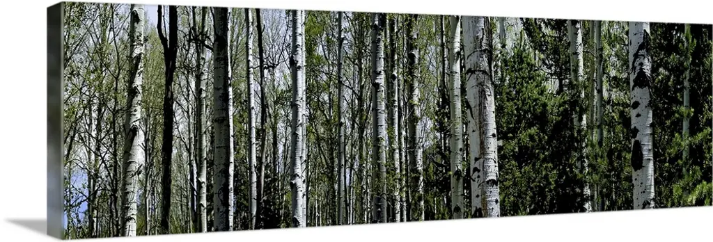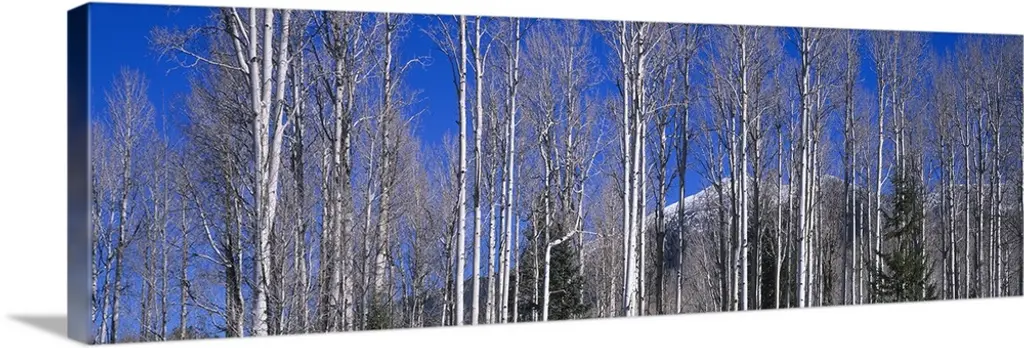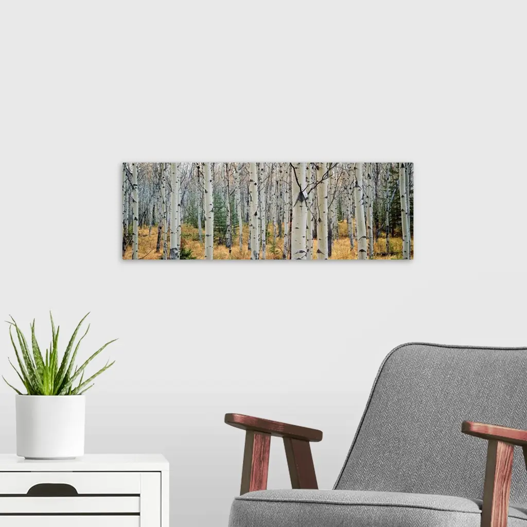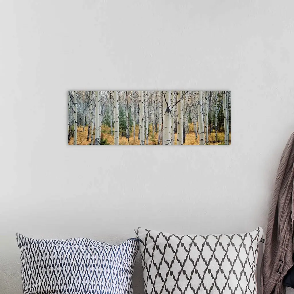 This wall art is a panoramic photograph of a forest of white barked trees growing in the Canadian Rockieso wilderness.