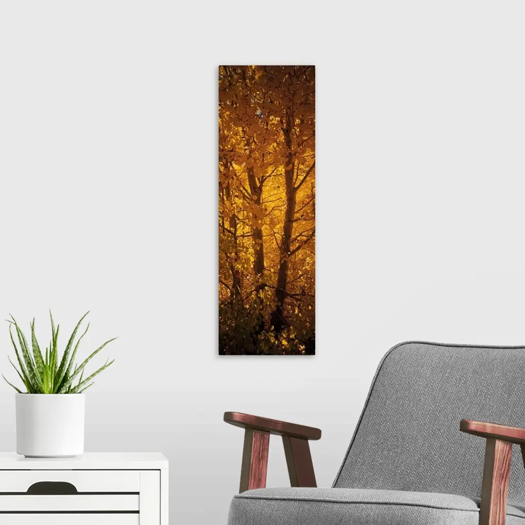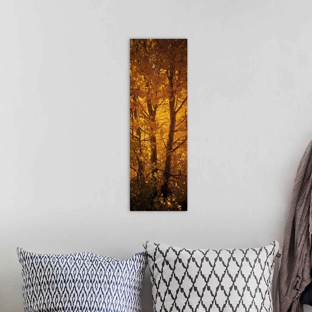 This is a vertical photograph of a single tree trunk filling the entirety of this autumn wall art.