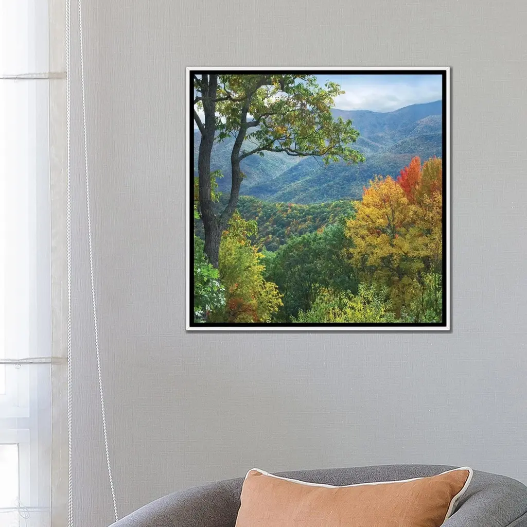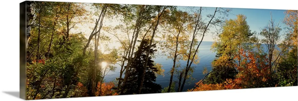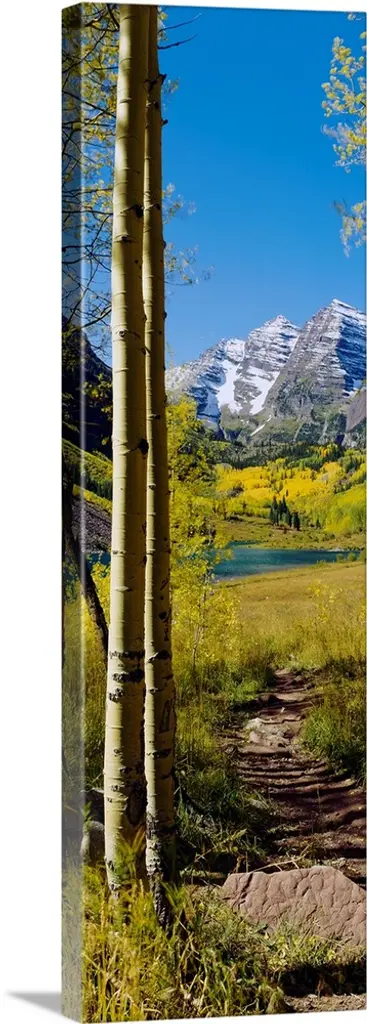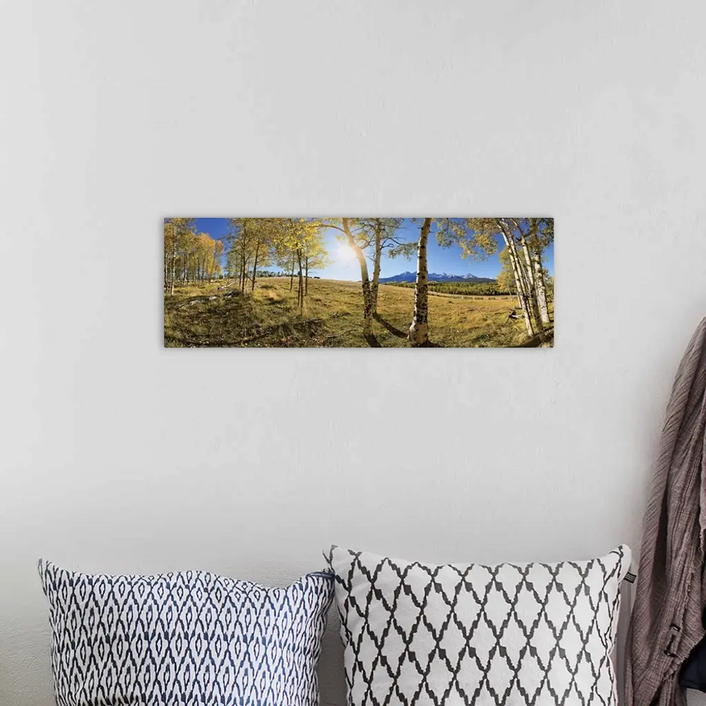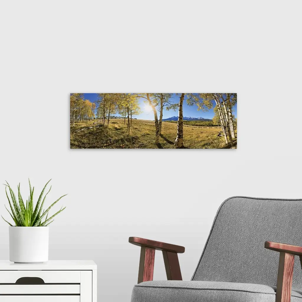 Panoramic photograph on a giant canvas of aspen trees with golden foliage, at the edge of a forest. Through the trees is a large clearing, beneath the setting sun in Colorado.