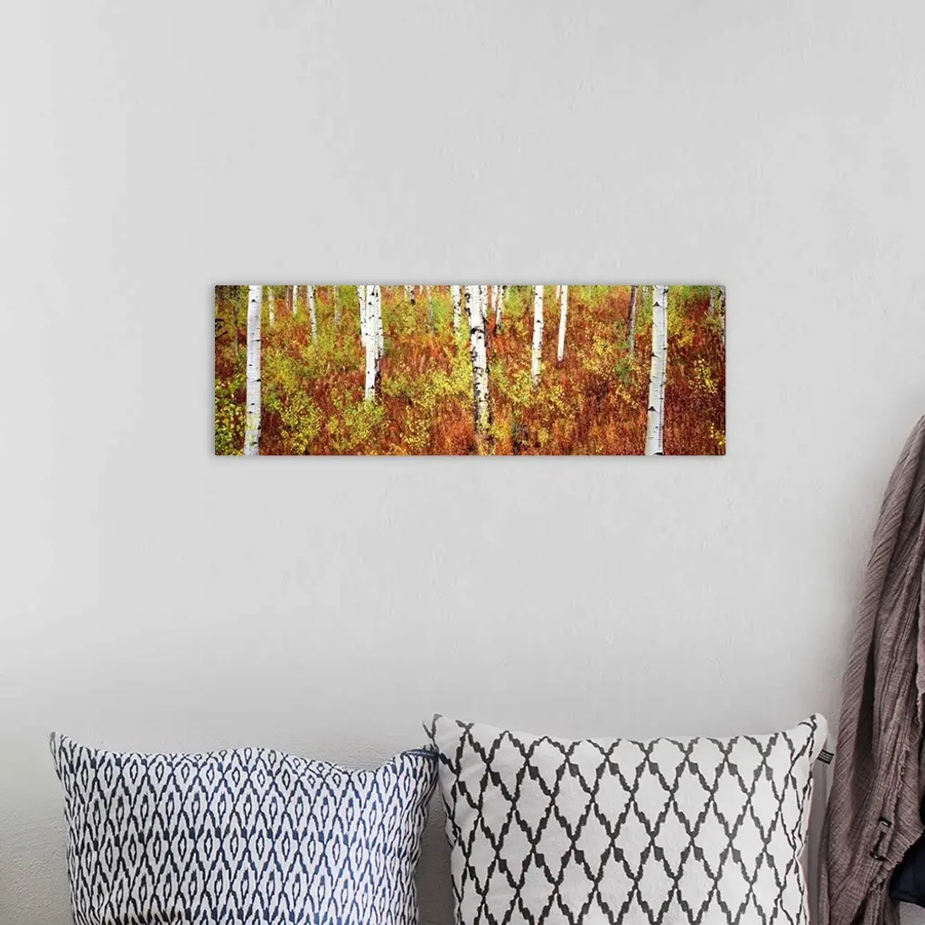Panoramic photograph of birch trees in forest surrounded by autumn foliage.