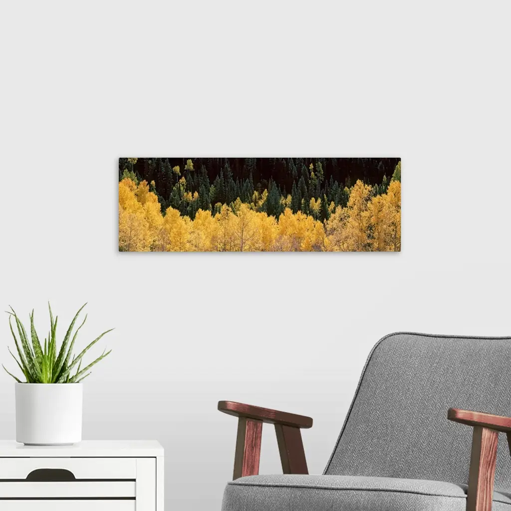 Panoramic photograph of golden tree tops with forest in the background.