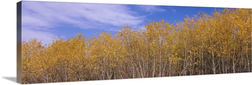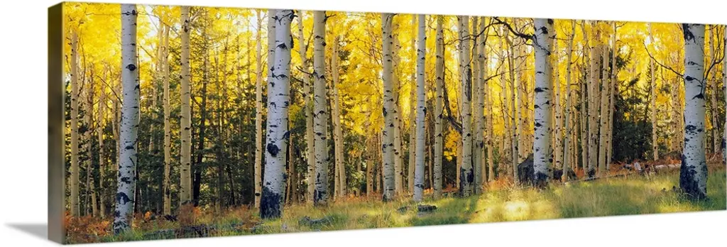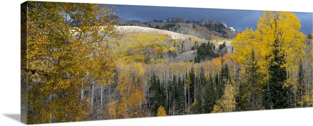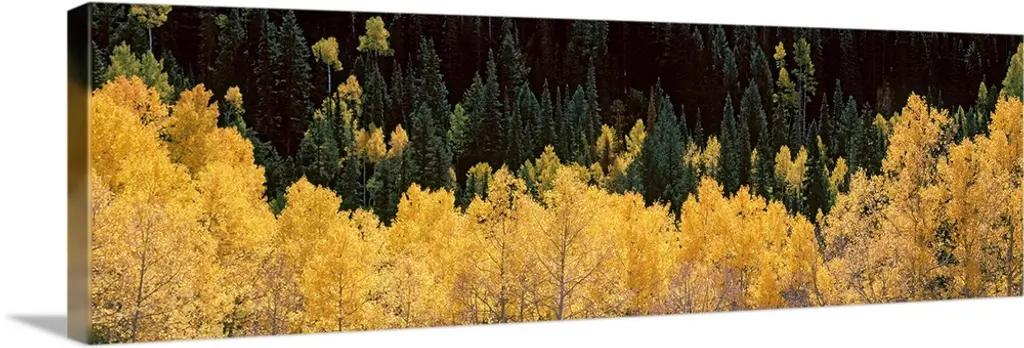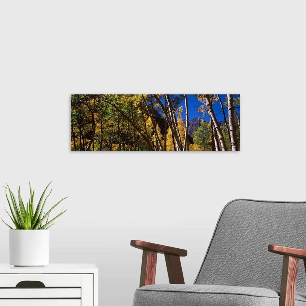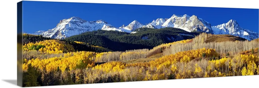 Panoramic photograph on a large canvas of fall colored aspen trees in Pitkin County, Colorado. The Maroon Bells can be seen in the background against a deep blue sky.