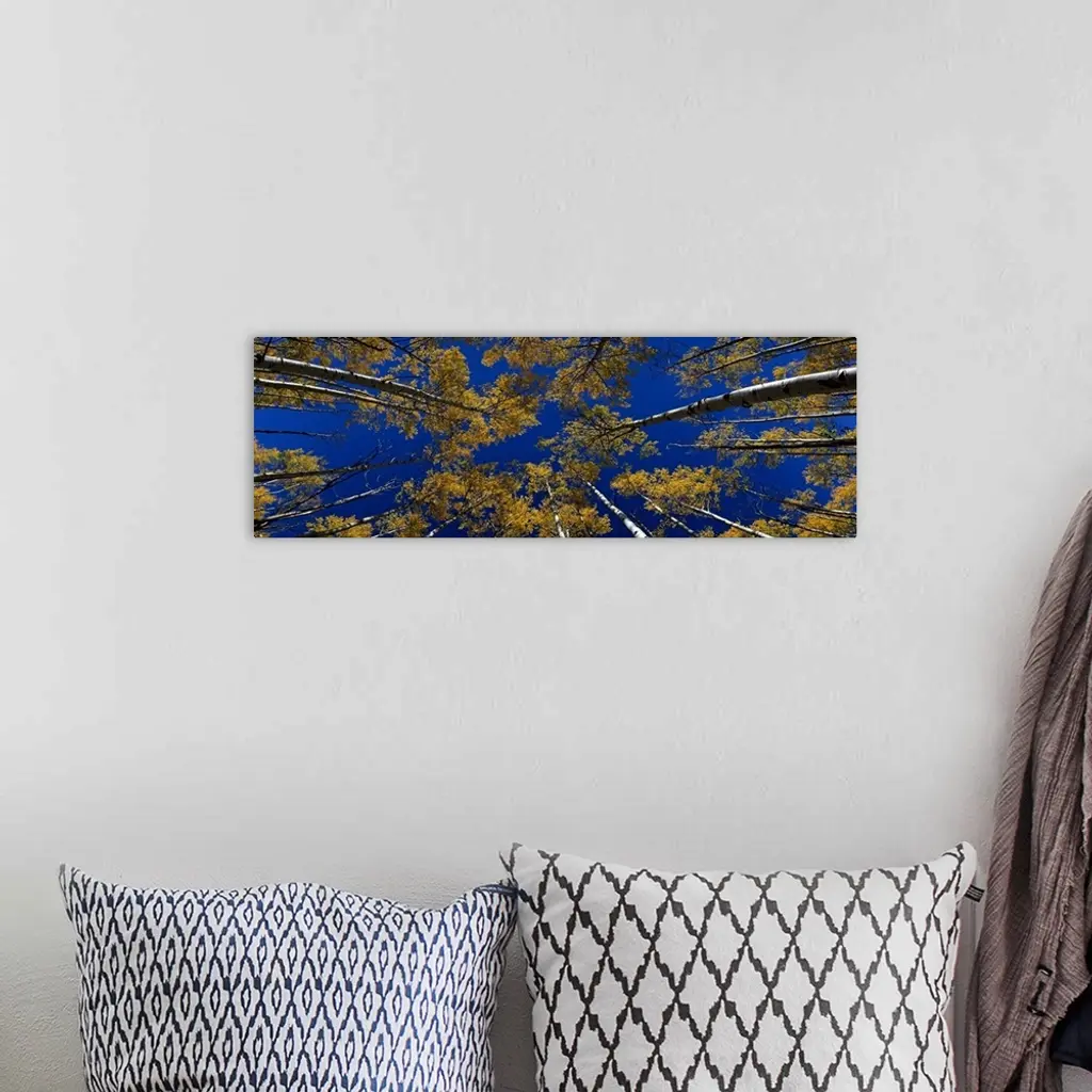 The tall slender branches of trees stretch into the sky above in this panoramic photograph taken from below looking up into a canopy.