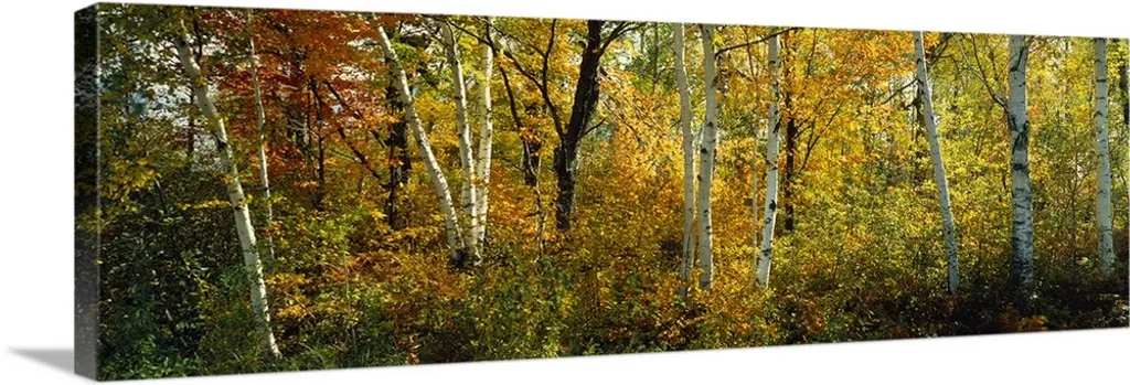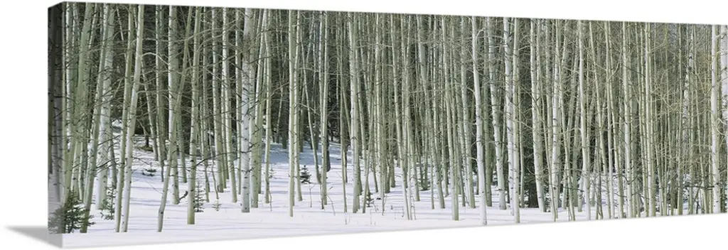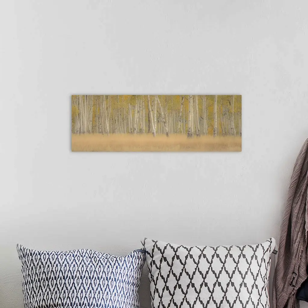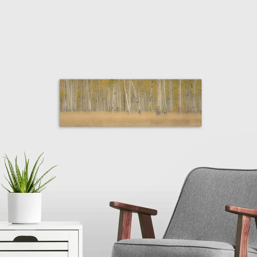 A photograph of a straight on view of a forest of Aspens in fall foliage.