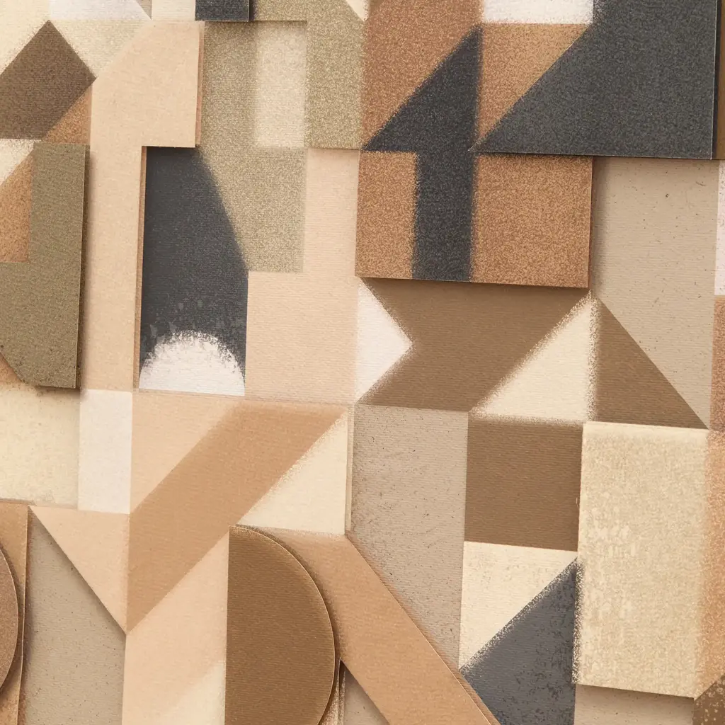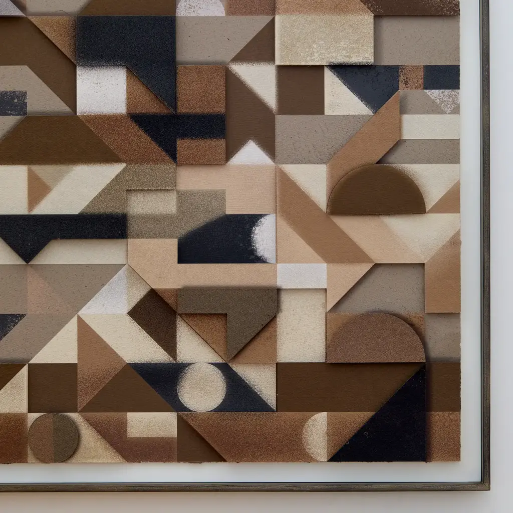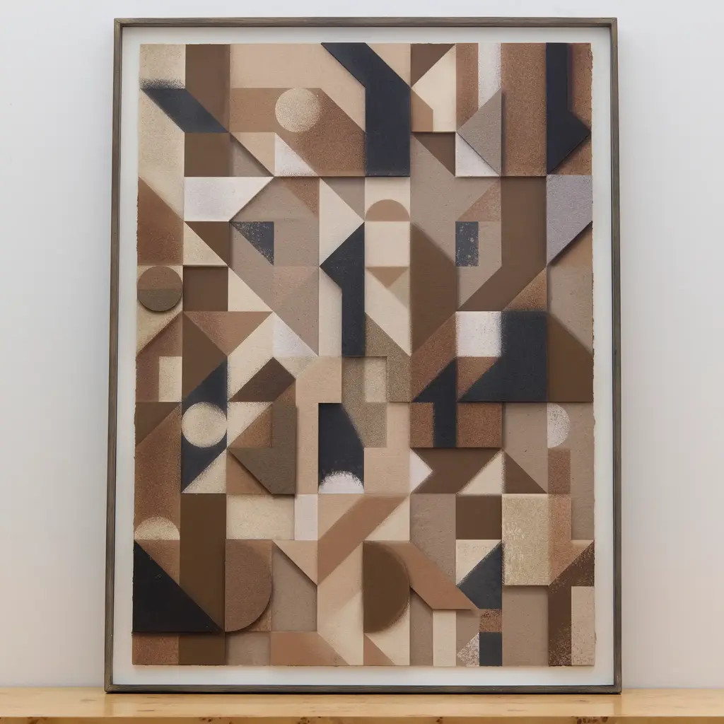 Assemblage Géométrique No. 7 is a bold exploration of geometry, layering, and tonal harmony. Hand-cut and colored paper forms - triangles, circles, and rectangles - interlock across a cream substrate, their overlapping planes creating a sense of rhythm and architectural order. The palette of warm sienna, umber, sand, and black is both timeless and modern, recalling the earthy restraint of early 20th-century European abstraction.This work pays homage to the Bauhaus and Cubist traditions, where geometry was stripped of ornament to reveal its essential beauty. Echoes of Sonia Delaunay’s color fields and the Constructivist use of form can be felt here, yet the dimensional layering gives it a contemporary sculptural presence. Float-mounted within a shadow box frame without acrylic, the piece allows each surface to catch light and shadow naturally, deepening its spatial effect.At 30” x 40”, it is a commanding statement - ideal for a gallery wall or as a standalone focal piece.