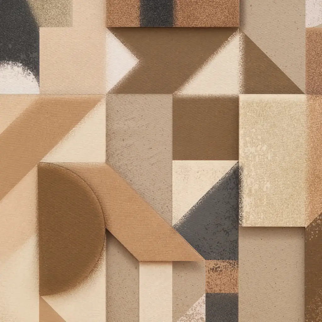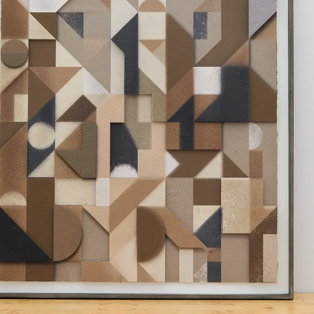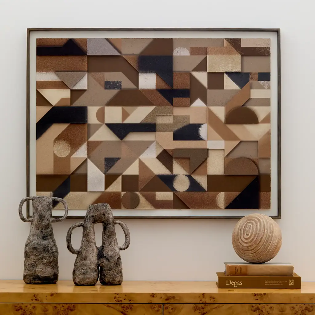 Assemblage Géométrique No. 7 is a bold exploration of geometry, layering, and tonal harmony. Hand-cut and colored paper forms - triangles, circles, and rectangles - interlock across a cream substrate, their overlapping planes creating a sense of rhythm and architectural order. The palette of warm sienna, umber, sand, and black is both timeless and modern, recalling the earthy restraint of early 20th-century European abstraction.This work pays homage to the Bauhaus and Cubist traditions, where geometry was stripped of ornament to reveal its essential beauty. Echoes of Sonia Delaunay’s color fields and the Constructivist use of form can be felt here, yet the dimensional layering gives it a contemporary sculptural presence. Float-mounted within a shadow box frame without acrylic, the piece allows each surface to catch light and shadow naturally, deepening its spatial effect.At 30” x 40”, it is a commanding statement - ideal for a gallery wall or as a standalone focal piece.