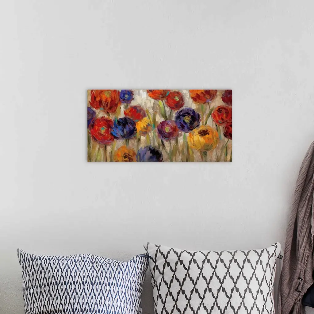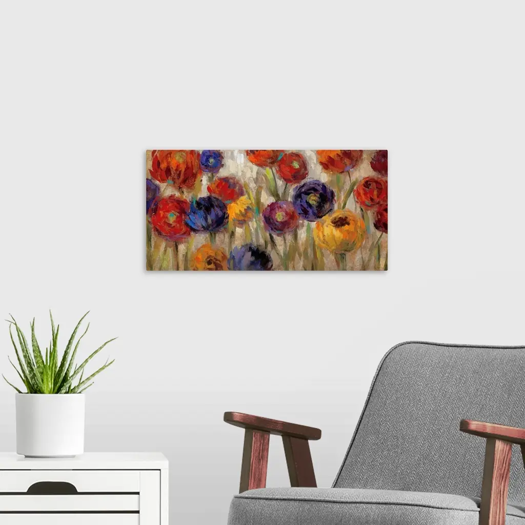 Huge contemporary art displays a group of earth toned flowers scattered throughout the canvas art. Artist uses a lot of circular brush strokes to represent the tops of the flowers, while a lot of vertical lines were used to construct the stems.