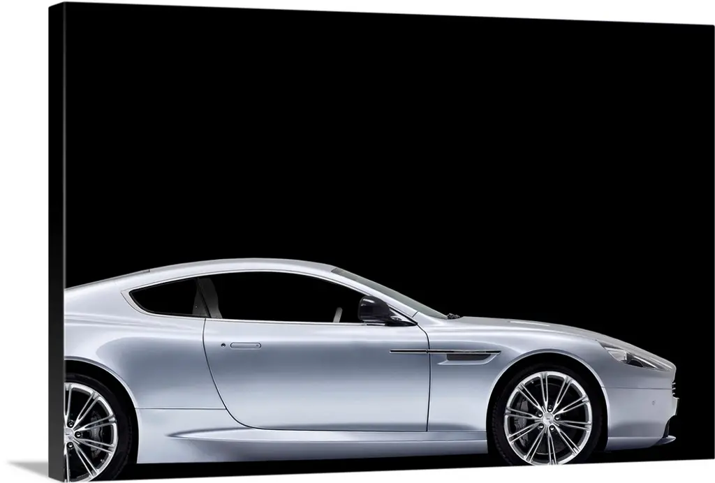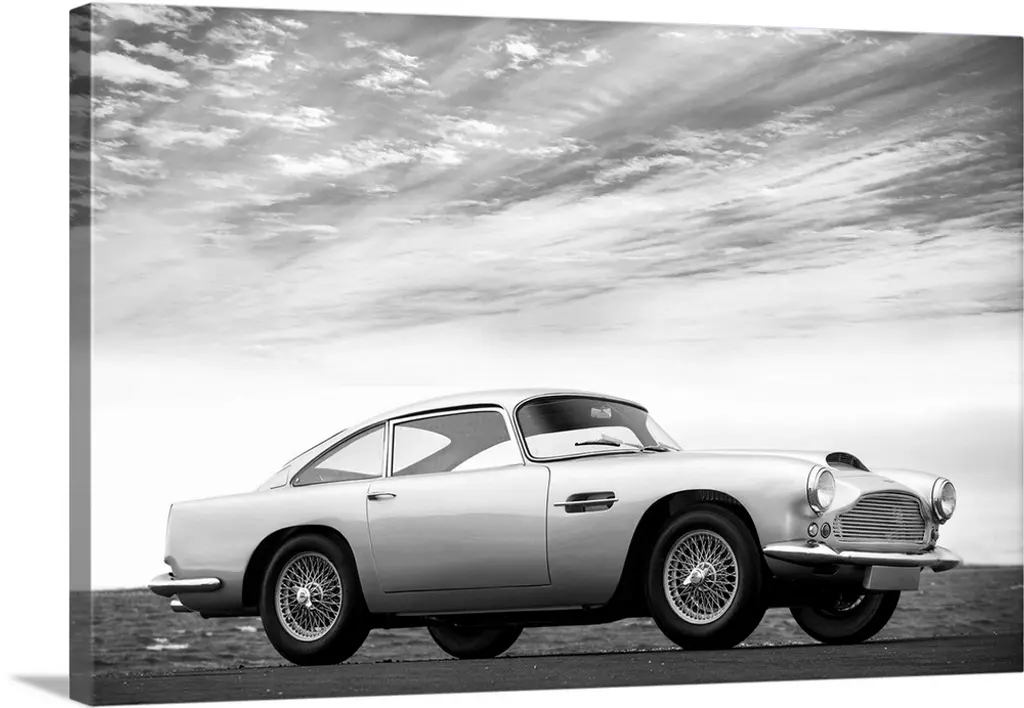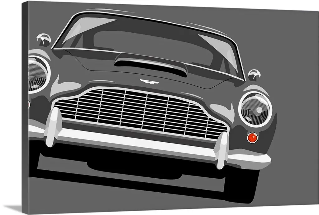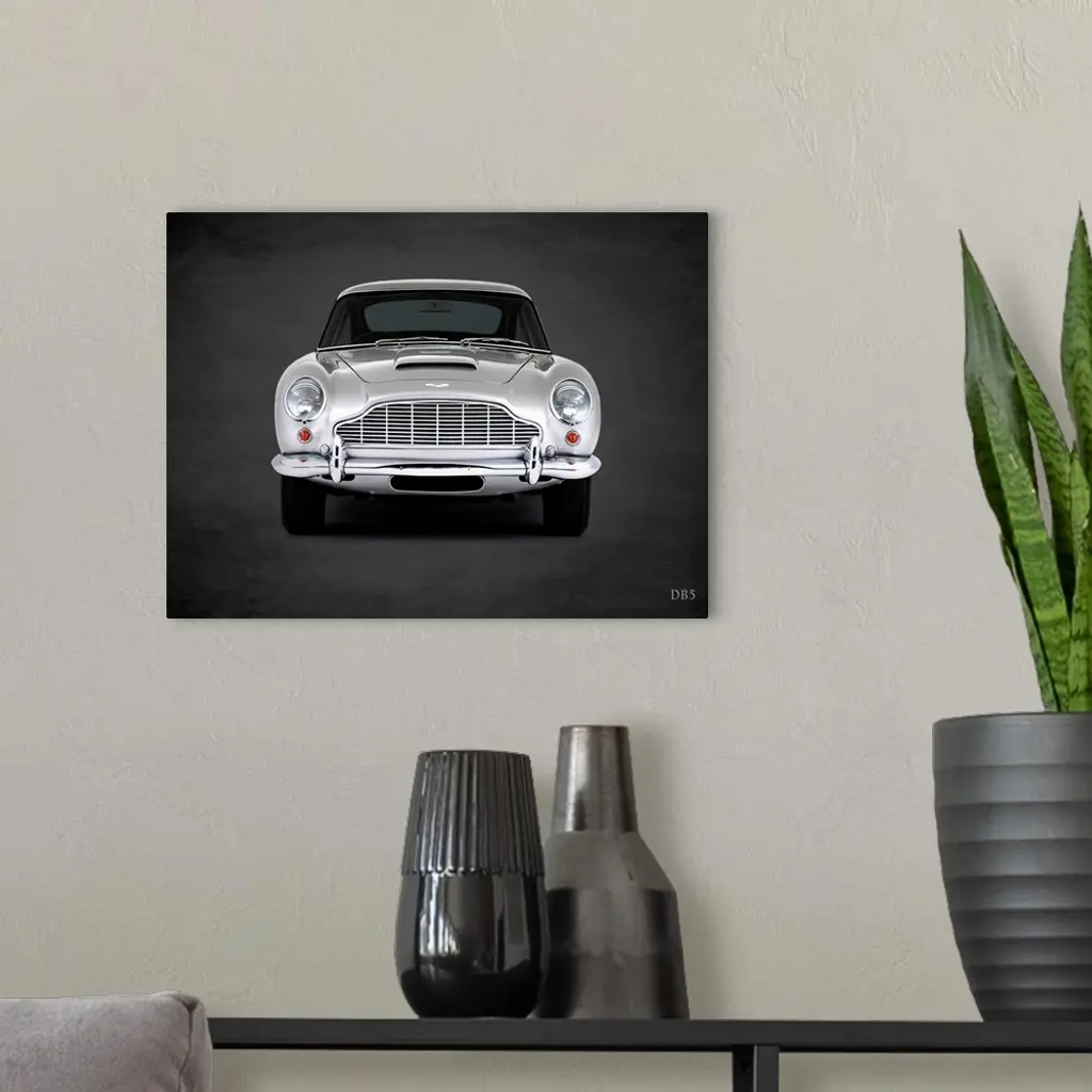 Photograph of a silver 1965 Aston Martin DB5 printed on a black background with a dark vignette.
