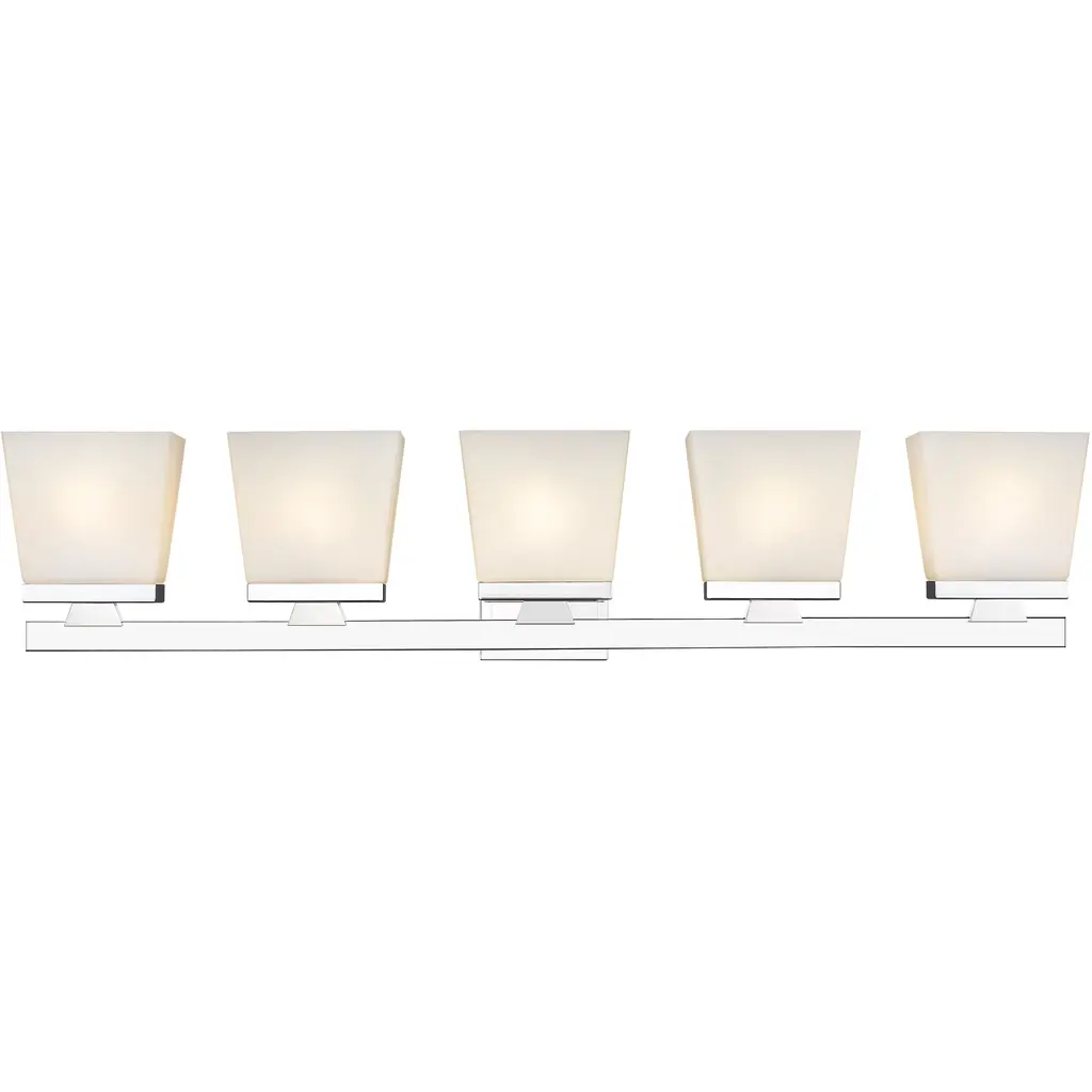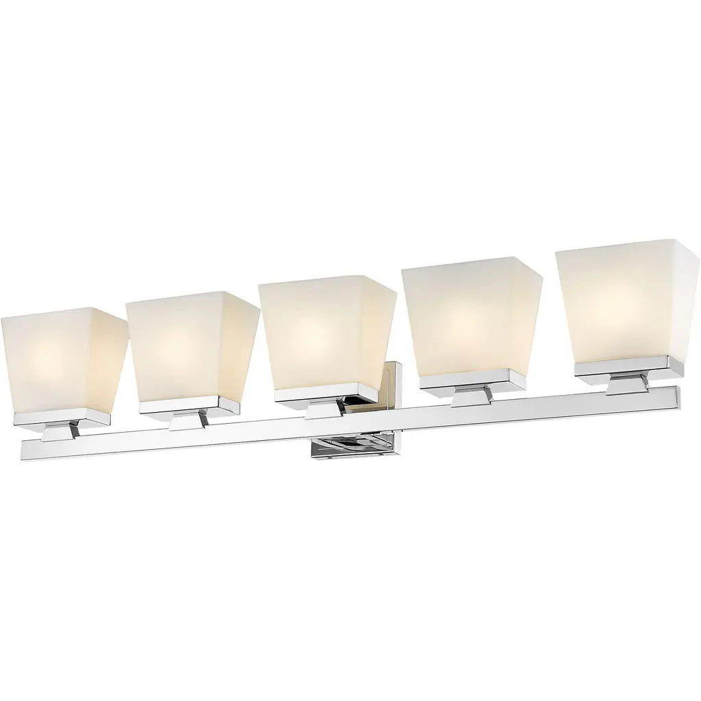 With its smooth steel construction and chrome finish, this modern farmhouse five-light vanity adds a shine to any bathroom or hallway. The glass shade in an etched opal finish adds an alluring essence to the fixture.