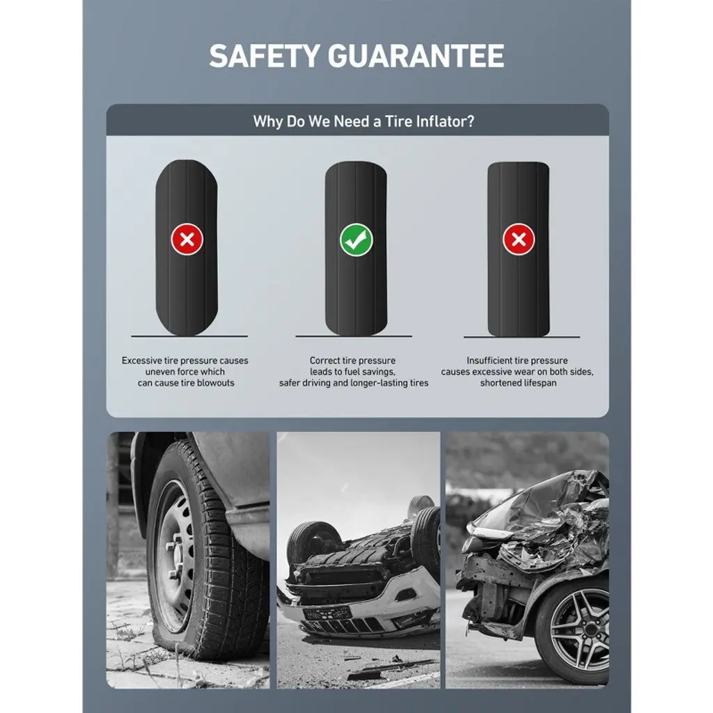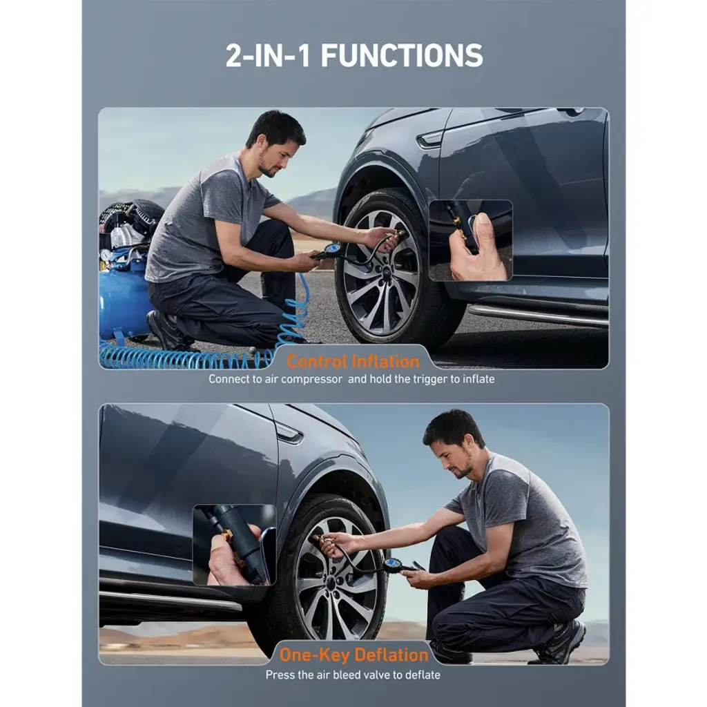 ADVANCED ACCURACY: Professionally calibrated to always return an accurate reading within 1% of the exact pressure of your tire. Accurately measures FOUR DIFFERENT UNITS in a range from 3-250 PSI (0.2-17.2 Bar; 0.21-1724 Kpa; 0.2-17.5 kg/cm^2). Stocking Stuffers for MenALL-IN-ONE FEATURES: The LED backlit screen features measurements in PSI, KPA, Bar, and Kg/cm^2; Includes an inflator, straight locking chuck, gauge, hose, bleed valve, all in one unit, ideal for cars, bicycles, motorcycles, balloons, air cushion, sports balls and so on; Compatible with ¼” NPT air compressors output and ¼" NPT Quick- Connect Fitting.INCREASED SAFETY: Properly inflated tires provide better performance in all weather conditions, decreasing the likelihood of flats, explosions, and crashes; Increase your MPG and save money on fuel costs and tire wearSUPERIOR CONSTRUCTION: Built of high quality, heavy duty stainless steel and brass components that provide lasting performance; Use for all vehicles, such as Cars, SUVs, Trucks, Motorcycles, Bicycles (with Schrader valve), RVs, and more!SAVES BATTERY LIFE AND MORE: Automatically turns on and will also turn off after 20 seconds of inactivity to preserve battery life; built-in air bleeder valve to quickly decrease pressure in overinflated tires