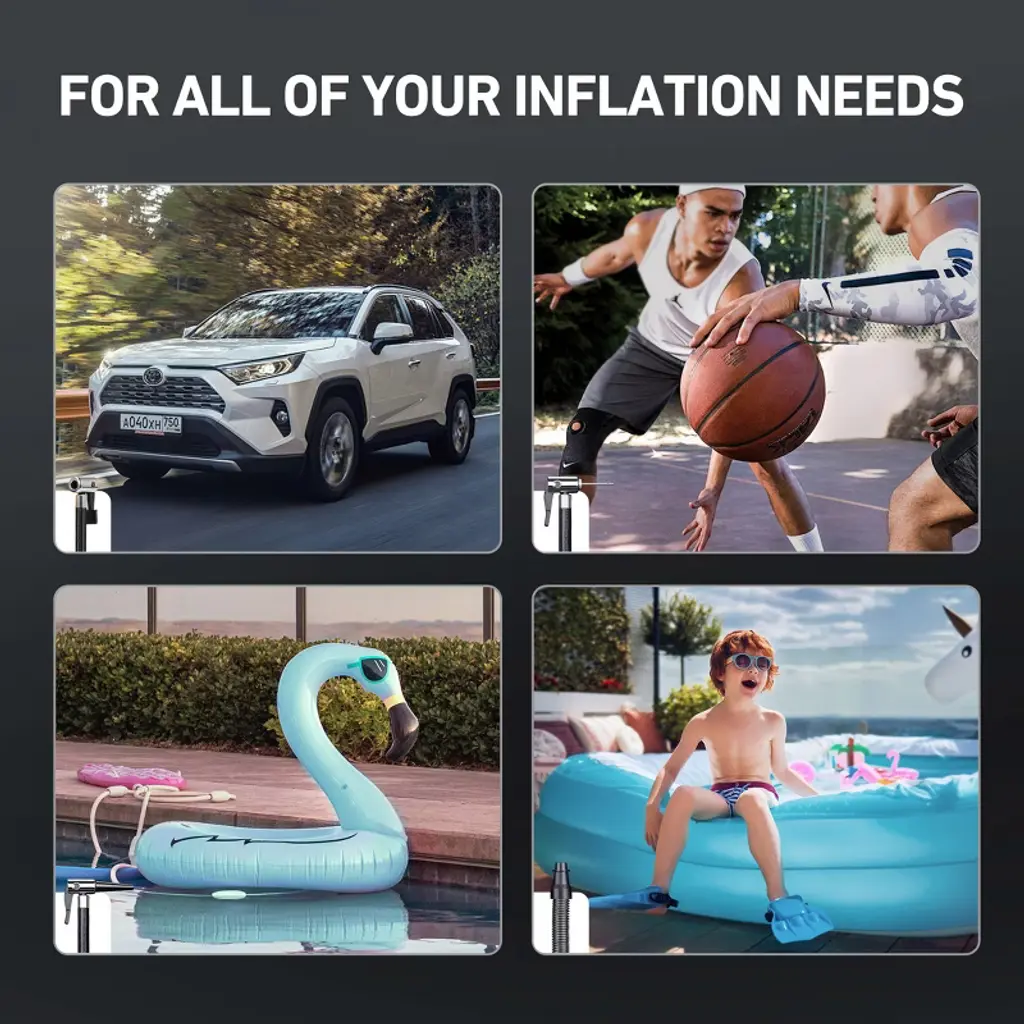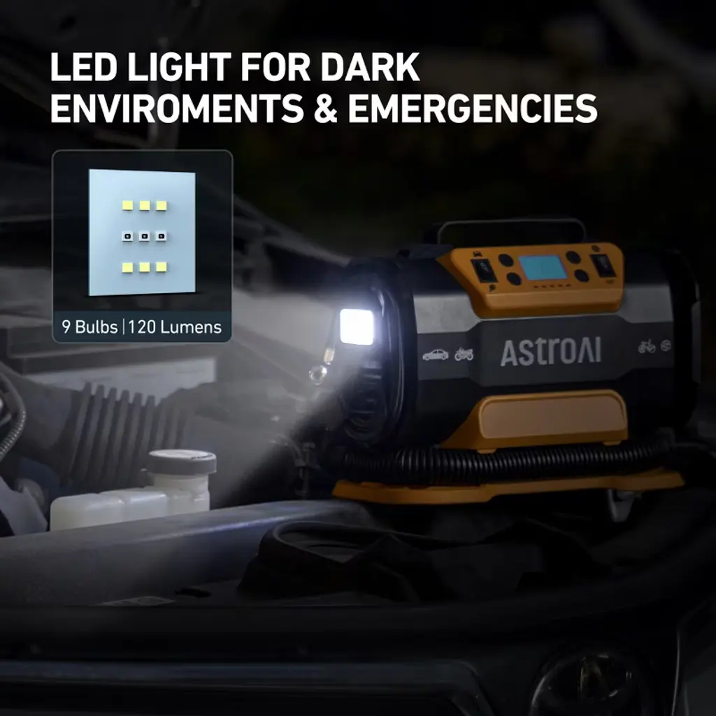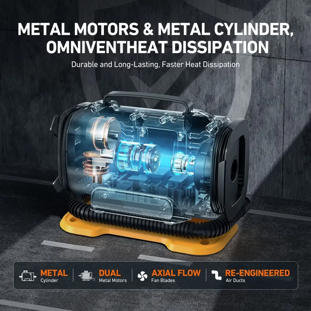 The AstroAI Tire Inflator offers versatile dual power, working from both 12V car cigarette lighters and 120V household outlets for home or travel convenience. It features dual inflation modes: high-pressure for car, bike, motorcycle tires, and small sports equipment (up to 150 PSI), and large-volume mode for bigger low-pressure items like air mattresses (max 350 L/min). Equipped with dual metal motors and a metal cylinder, it provides fast inflation (e.g., 0 to 36 PSI in 6 minutes) and can run continuously for up to 15 minutes per cycle (cooling for 10 minutes recommended afterward; incompatible with heavy-duty trucks). Revolutionary OmniVent Technology, featuring axial flow fan blades and redesigned air ducts, ensures superior heat dissipation, extending working time and lifespan. Operation is simplified with an LED light for night use, a clear screen showing preset and current pressure, automatic shut-off at the target pressure, a memory function recalling the last setting, individual silicone buttons, and four selectable pressure units. It includes convenient storage for the air hose and power cord, and comes with the inflator, AC/DC power cord, 2 air nozzles, a needle valve adapter, replacement fuse, Presta to Schrader adapter, and user manual.