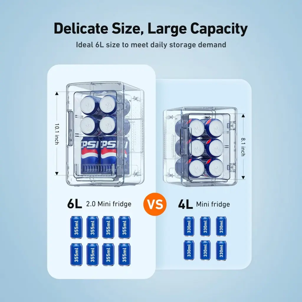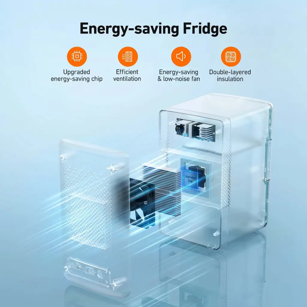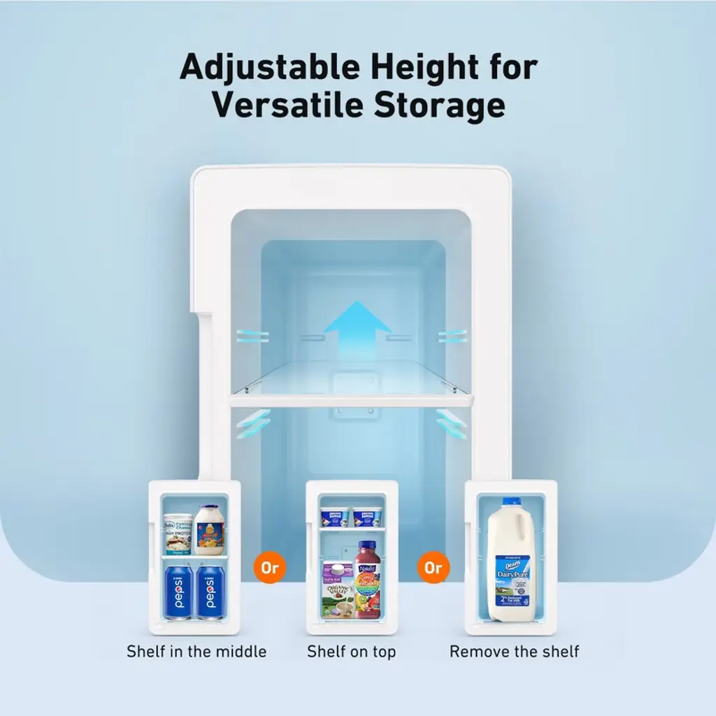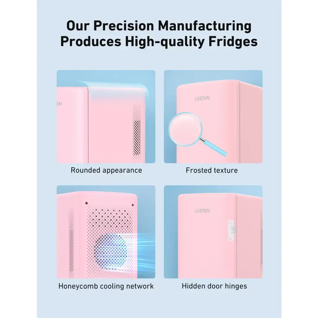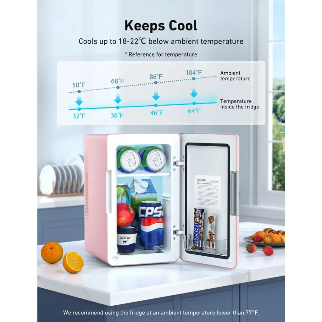 Practical and stylish, AstroAI mini fridge features a futuristic aesthetic with a low-noise system—ideal for bedrooms, offices, dorm rooms, or travel. Its 6L capacity stores up to eight 355ml cans or four 20oz water bottles, while the detachable shelf adapts to varying heights for beverages, cosmetics, or snacks (interior: 5.67” x 5.28” x 10.08”). Advanced cooling technology maintains temperatures 32-40°F (18-22°C) below ambient levels; the warming function reaches up to 150°F (66°C). Optimize performance by minimizing door openings during active cooling. Power options include 110V AC for home outlets and 12V DC for car cigarette lighters (note: 110V voltage required for safety). Nonslip silicone pads stabilize the base, and hidden hinges protect surfaces—press the handle firmly to ensure the door seals completely.