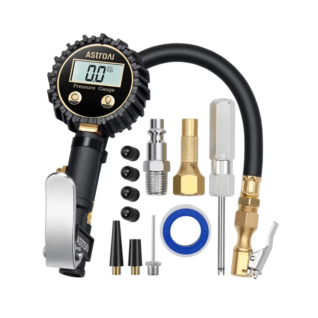Check out our VIDEO on the left side and take a quick tour of AstroAI tire gauge! Backlit LCD display and Lighted nozzle for visibility in dimly light areas, stocking stuffers for men and womenDesigned to maintain correct tire pressure, reduce tire wear and extend tire life; Digital display reading instantly and clearly being shown, no longer do the guesswork of analog gaugesNozzle easily forms a seal with the valve stem on Schrader valves and Presta stems with valve adaptor if you need, giving quick and accurate readings in 0.1 increments; 4 settings with range: 0-150PSI / 0-10Bar / 0-10Kgf/cm or 0-1000KPASimply press "ON/UNIT/OFF" button to turn on the tool, select the range, and automatically shut off in 30-40 seconds to save the power; Non-slip texture makes it easy to hold onto and the ergonomic design is both suitable for men and women's hands. Gauge automatically resets when taking pressure, no need to calibrate or reset the deviceBattery included; Versatile use for cars, trucks, motocycles, bicycles etcAstroAI tire gauge is made in high quality, if there is any broken during the shipping, or error in function, simply return it. We always wants to provide our customers with excellent products and customer service