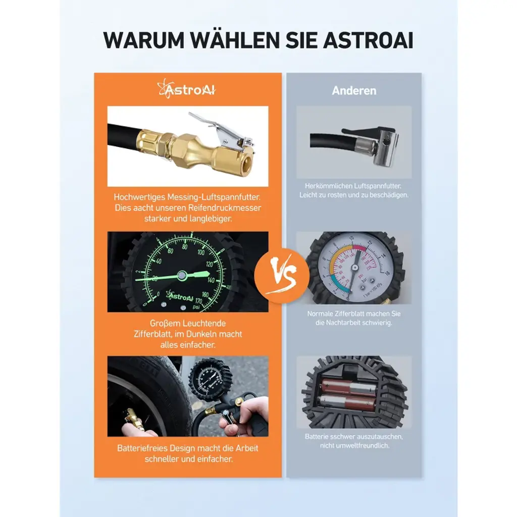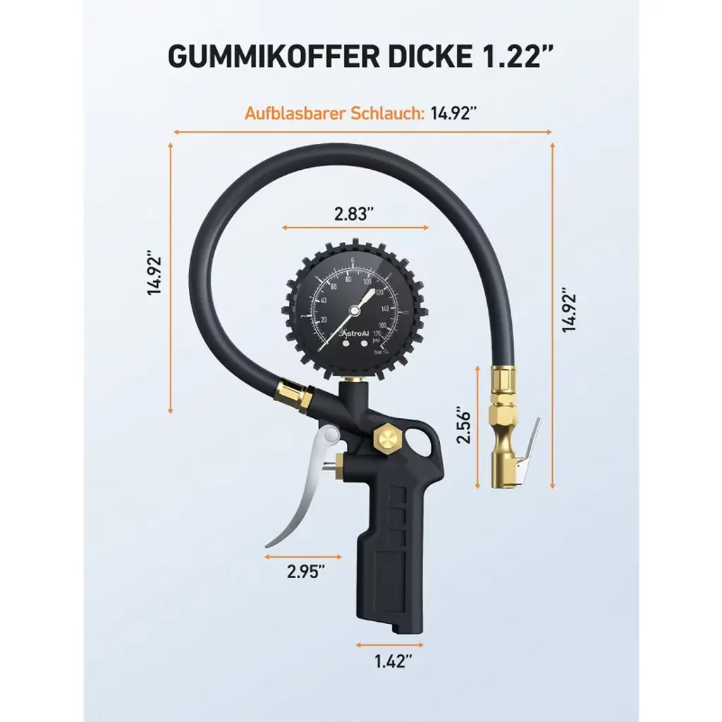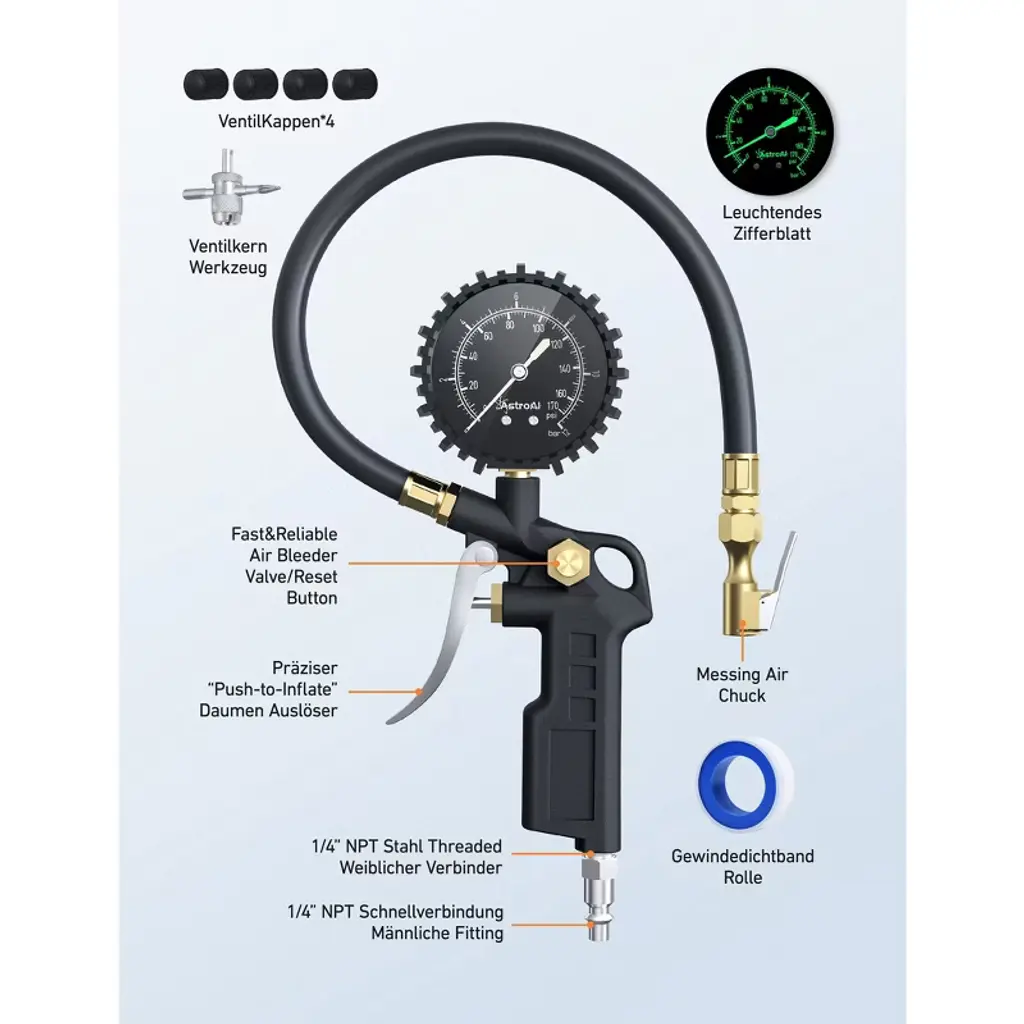 Advanced accuracy: Professionally calibrated tire pressure gauges for cars. Accurately measures from 0-100 PSI with a resolution of +/-1 PSI.3-IN-1 Multifunction: Our air pressure gauge has 3 functions of deflation, inflation, tire pressure check. Press trigger to inflate tire, press reset button to deflate tire.Universal compatibility: Our portable tire inflator for anything else that utilizes a schrader valve; also compatible with all quick connect 1/4" NPT air compressors and ¼" NPT Quick- Connect Fitting.Superior construction: AstroAI car tire inflator with pressure gauge is built of high quality, heavy duty stainless steel and brass components that provide lasting performance.Increased safety: Properly inflated tires provide better performance in all weather conditions, decreasing the likelihood of flats, explosions, and crashes.