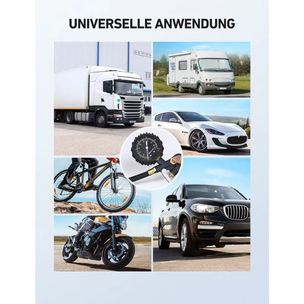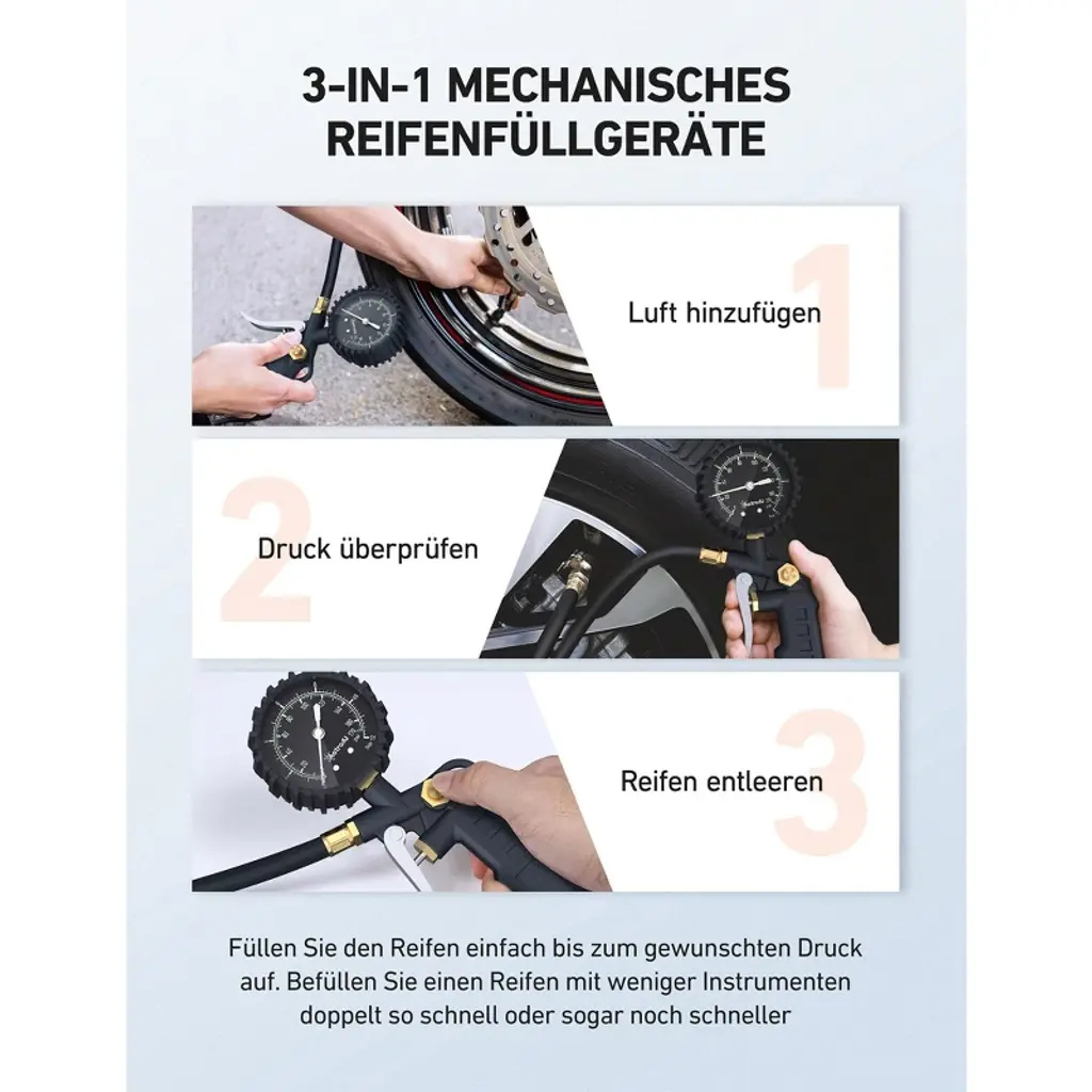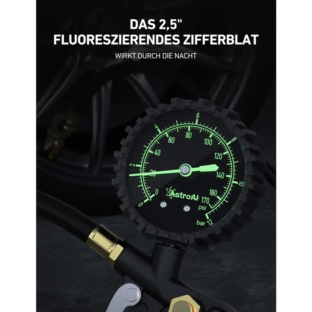 Advanced accuracy: Professionally calibrated tire pressure gauges for cars. Accurately measures from 0-100 PSI with a resolution of +/-1 PSI.3-IN-1 Multifunction: Our air pressure gauge has 3 functions of deflation, inflation, tire pressure check. Press trigger to inflate tire, press reset button to deflate tire.Universal compatibility: Our portable tire inflator for anything else that utilizes a schrader valve; also compatible with all quick connect 1/4" NPT air compressors and ¼" NPT Quick- Connect Fitting.Superior construction: AstroAI car tire inflator with pressure gauge is built of high quality, heavy duty stainless steel and brass components that provide lasting performance.Increased safety: Properly inflated tires provide better performance in all weather conditions, decreasing the likelihood of flats, explosions, and crashes.