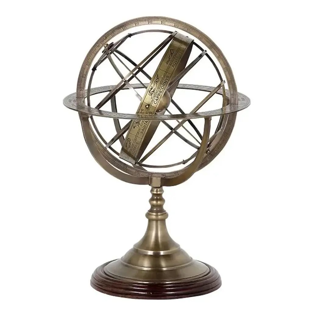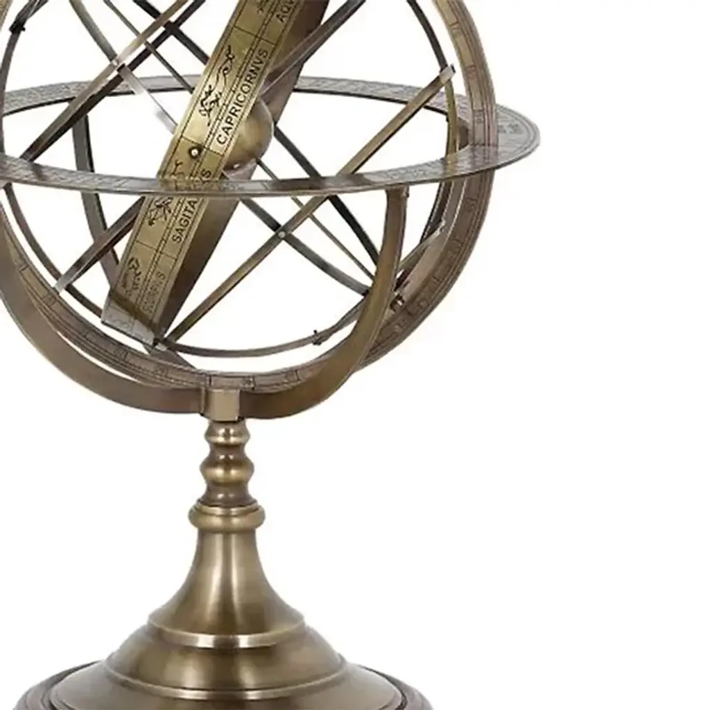 Antique brass finish Globe, with detail etched zodiac, axis and pedestal with brown plinth.