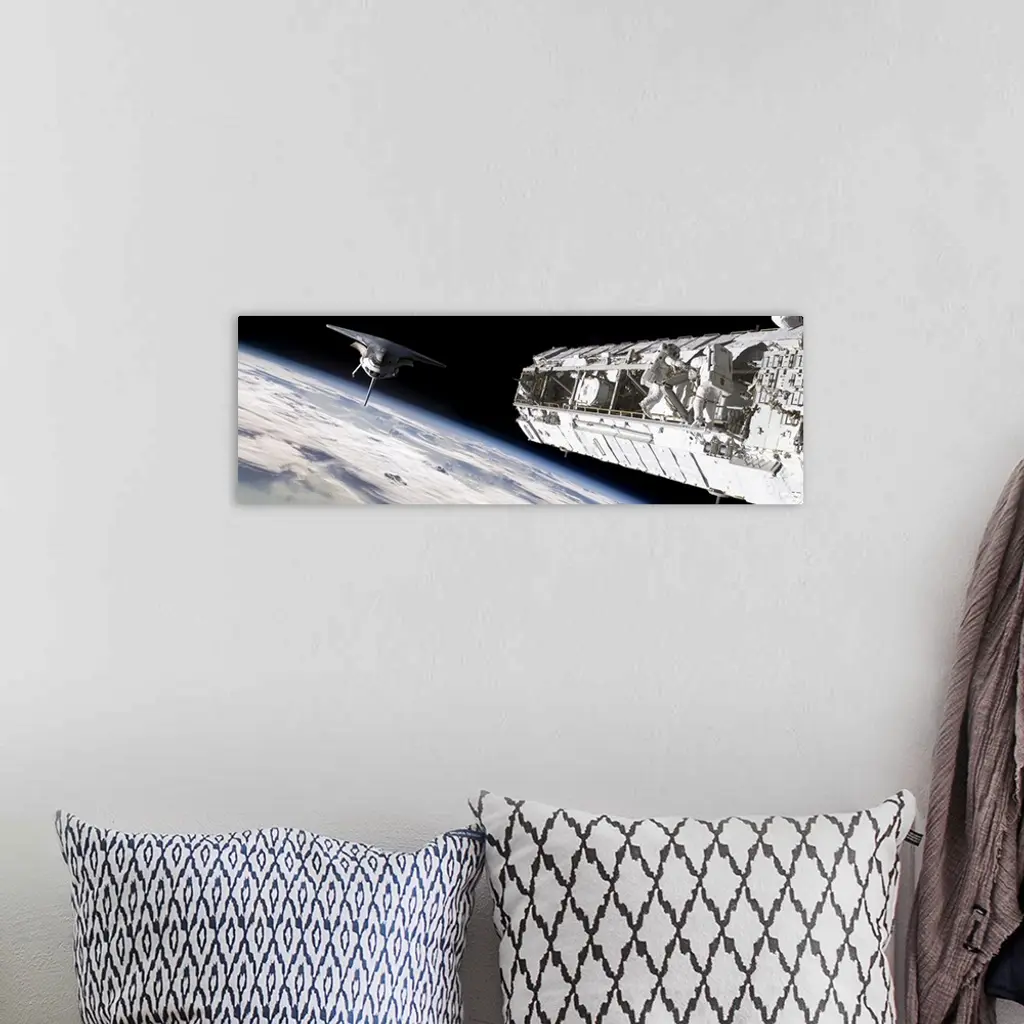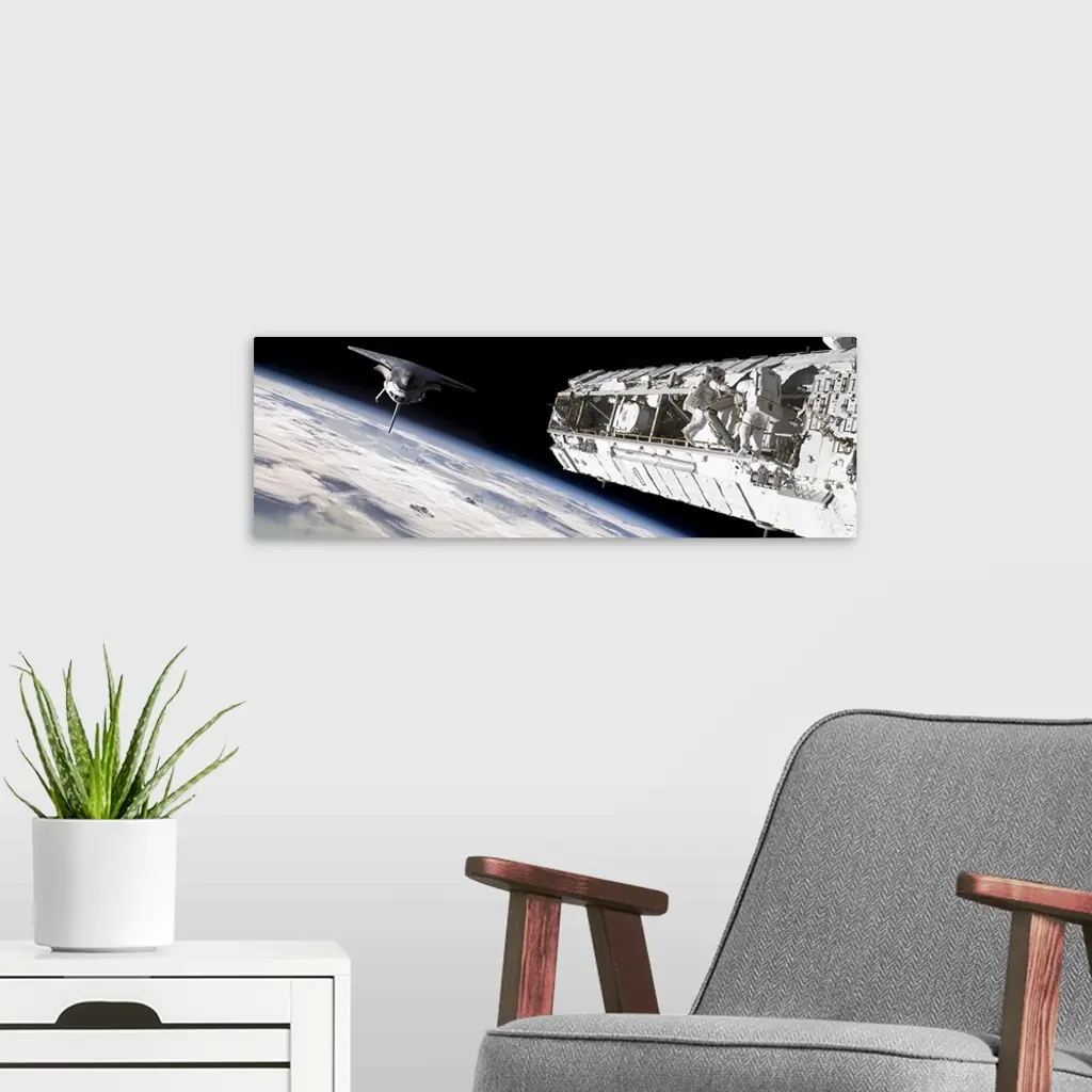 Astronauts Work On A Space Station While A Space Shuttle Approaches