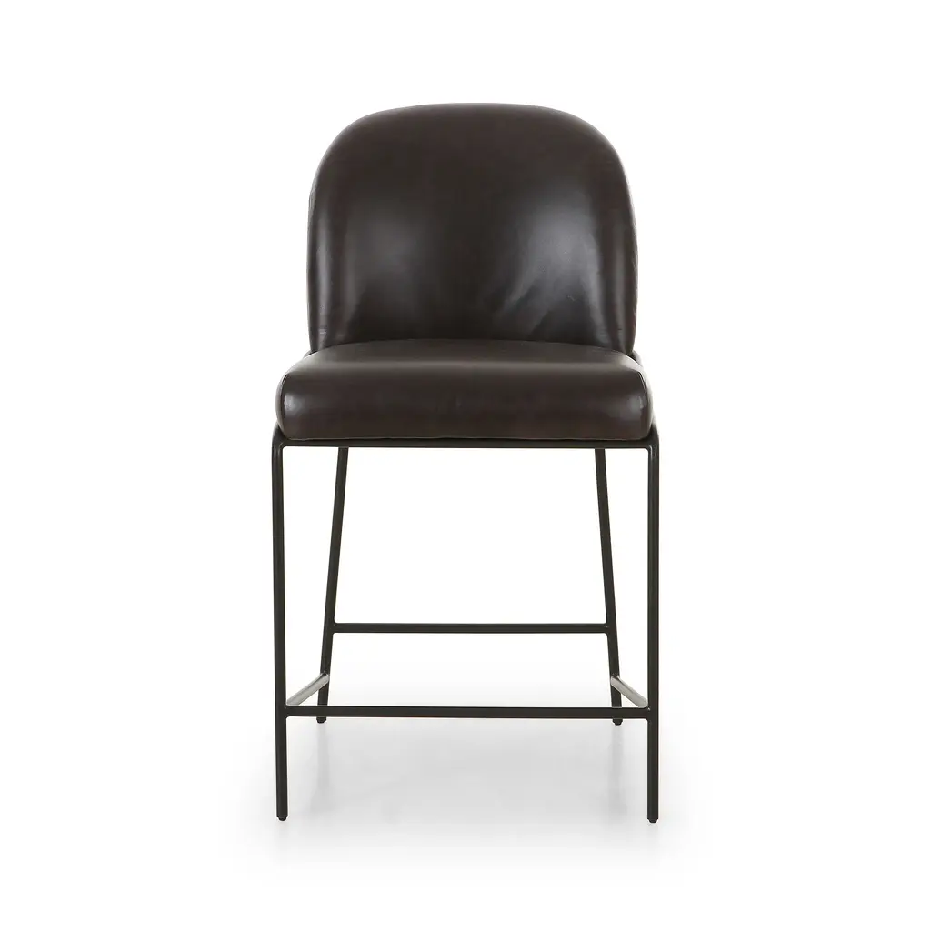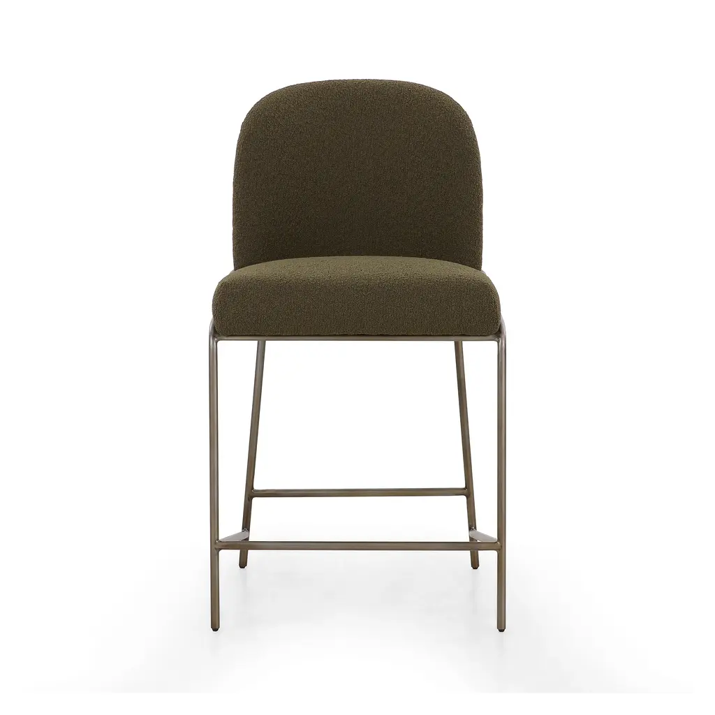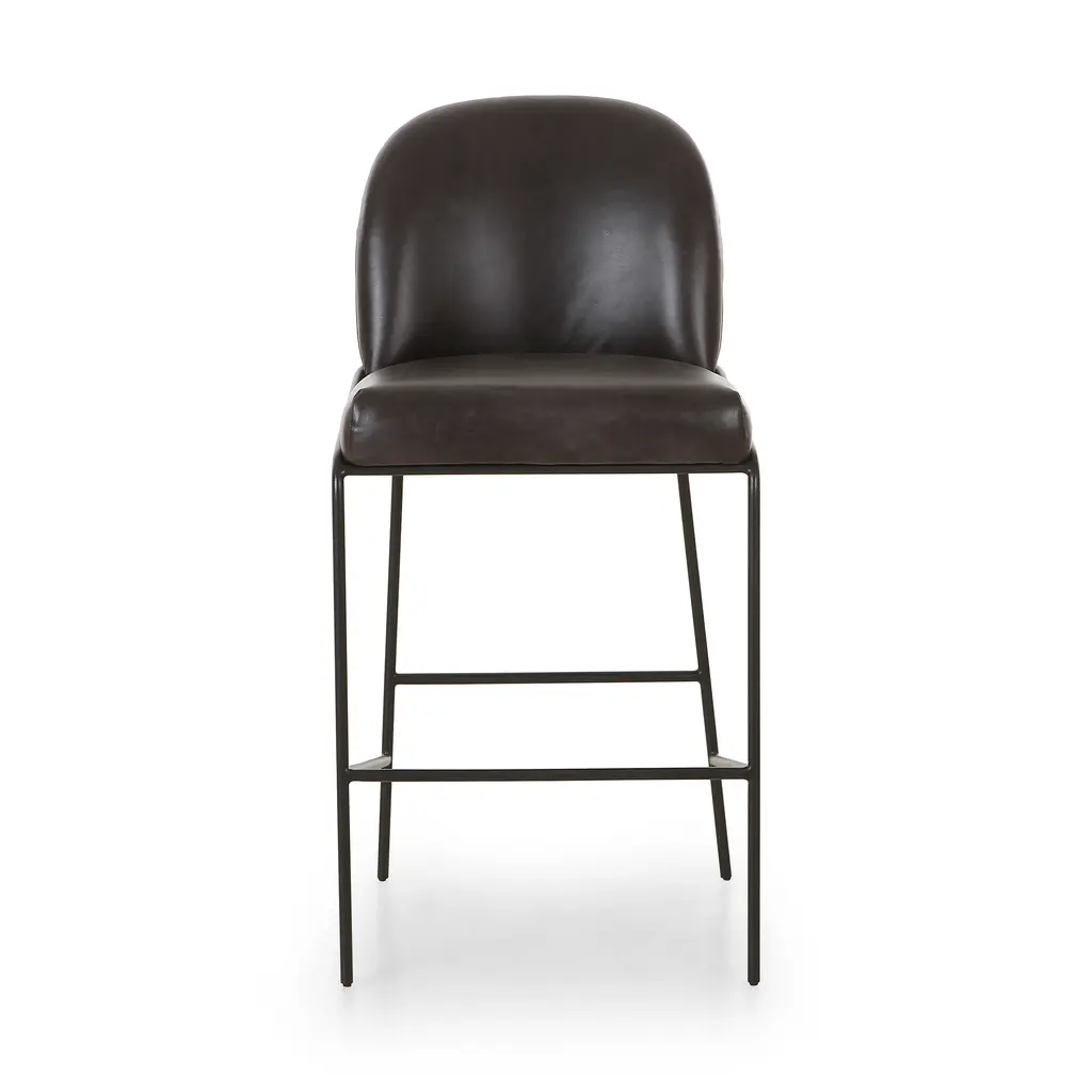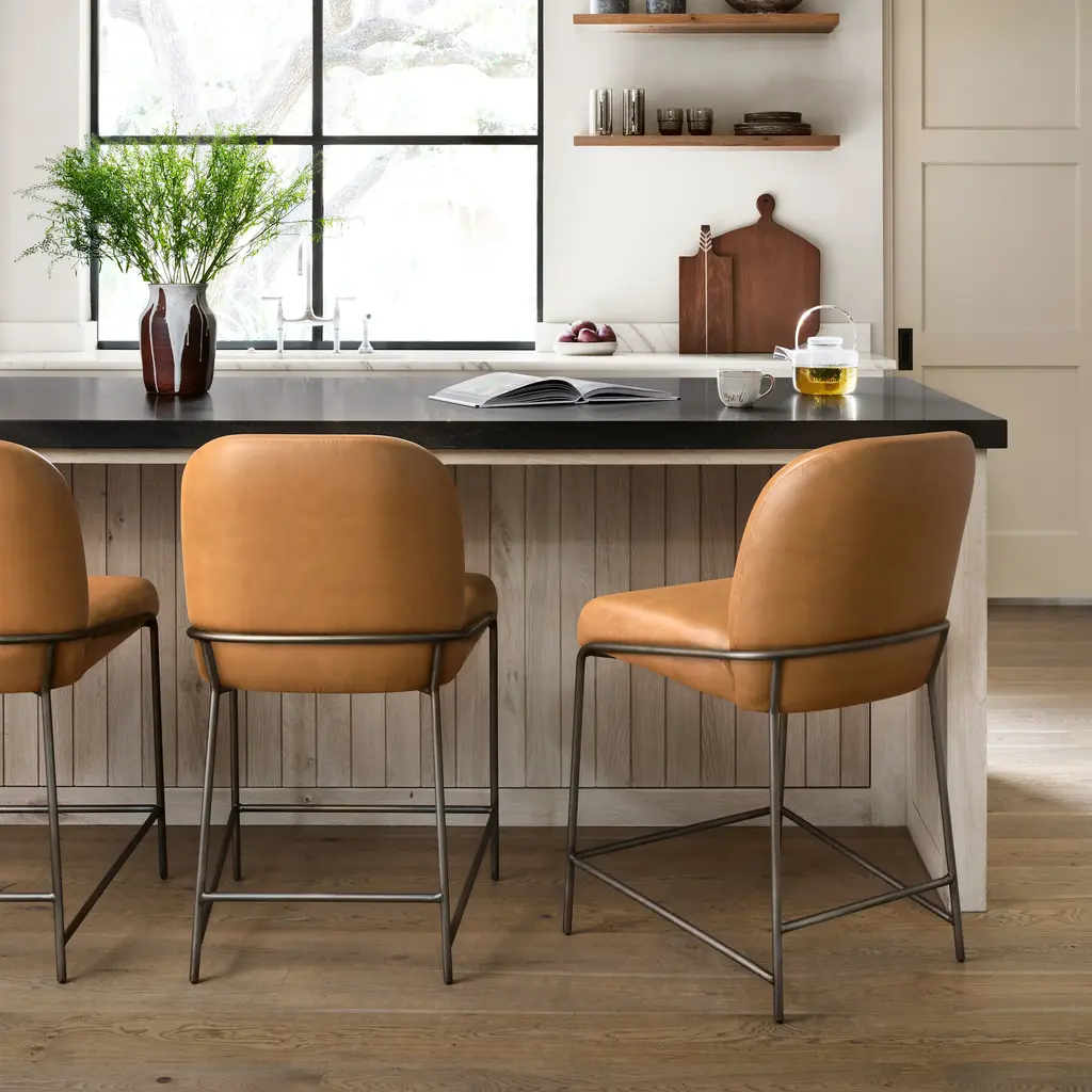 A unique statement piece, the Astrud Bar & Counter Stool from Four Hands is designed to bring dreamy Art Deco flair to any home. Its finely crafted, scalloped back is upholstered with luxurious performance fabric or faux leather atop slim, iron tube framing. The Fiqa fabrics are designed for maximum comfort and durability, and are stain-resistant, water-repellent, and antimicrobial. Add sophistication and timeless style to any room with this exquisite seating design. Highlights