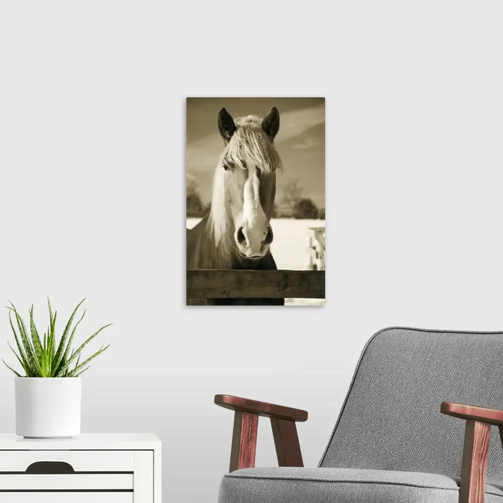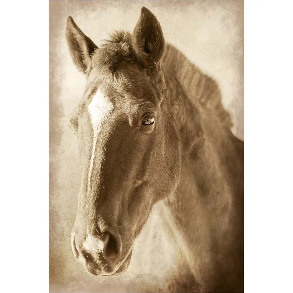 Sepia toned photograph of a horse behind a fence.