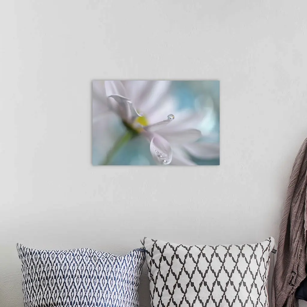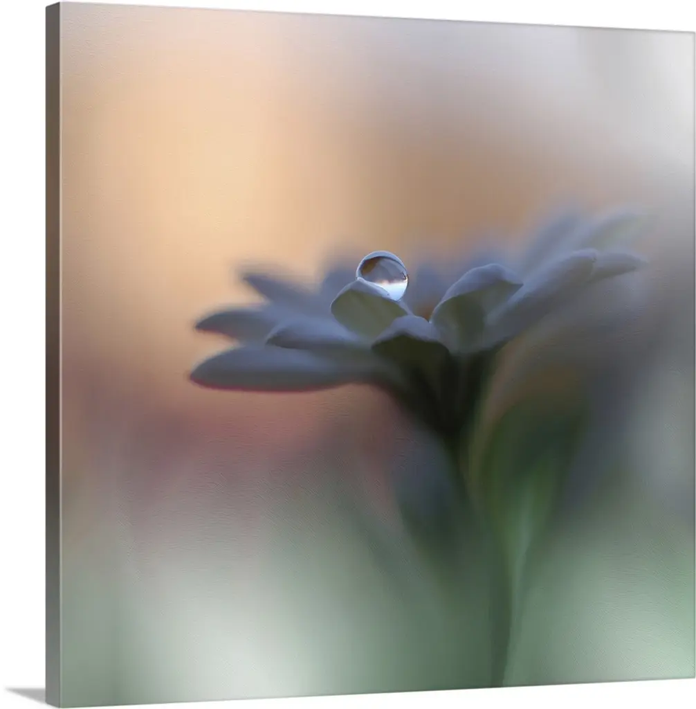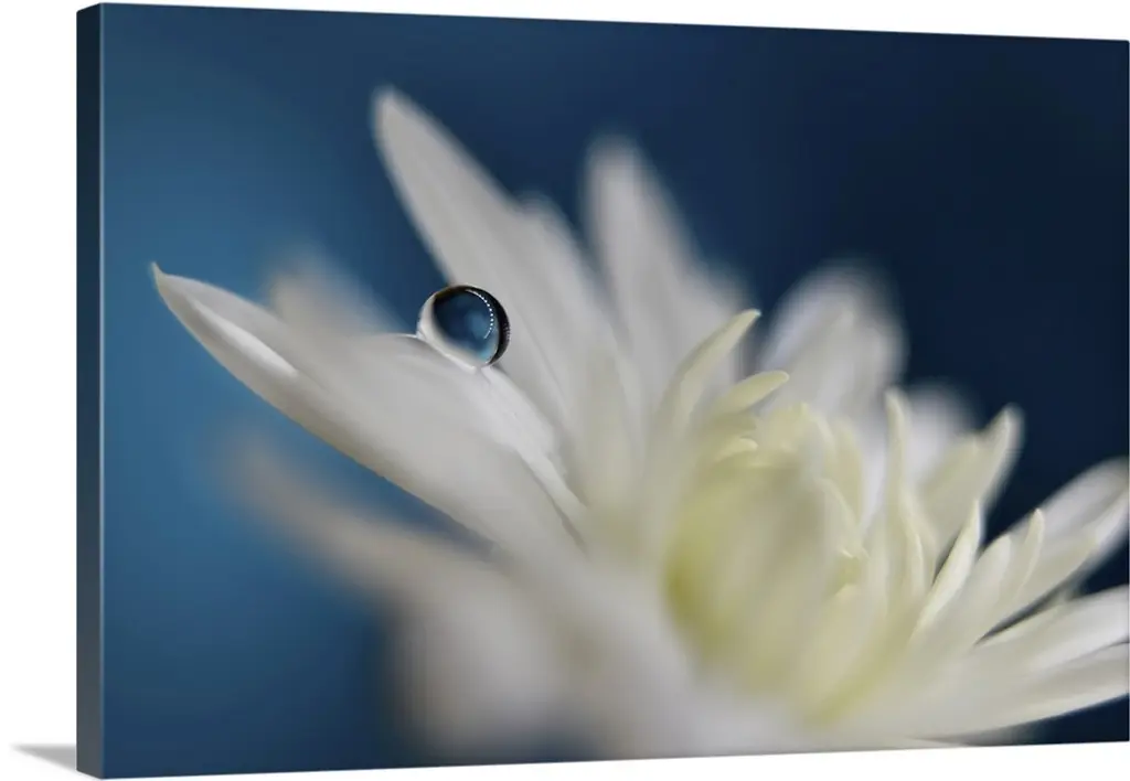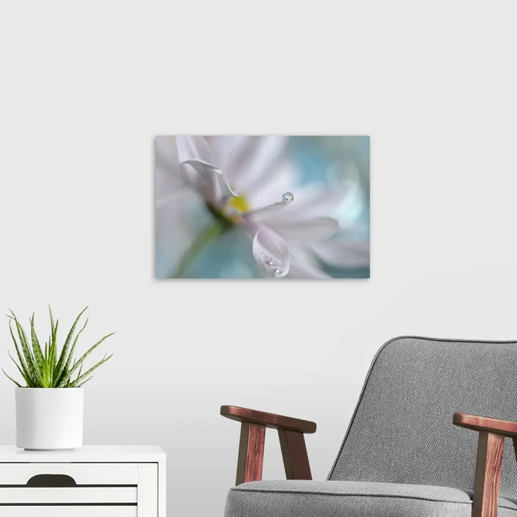 Soft focus macro image of a dew drop on the petals on a daisy.