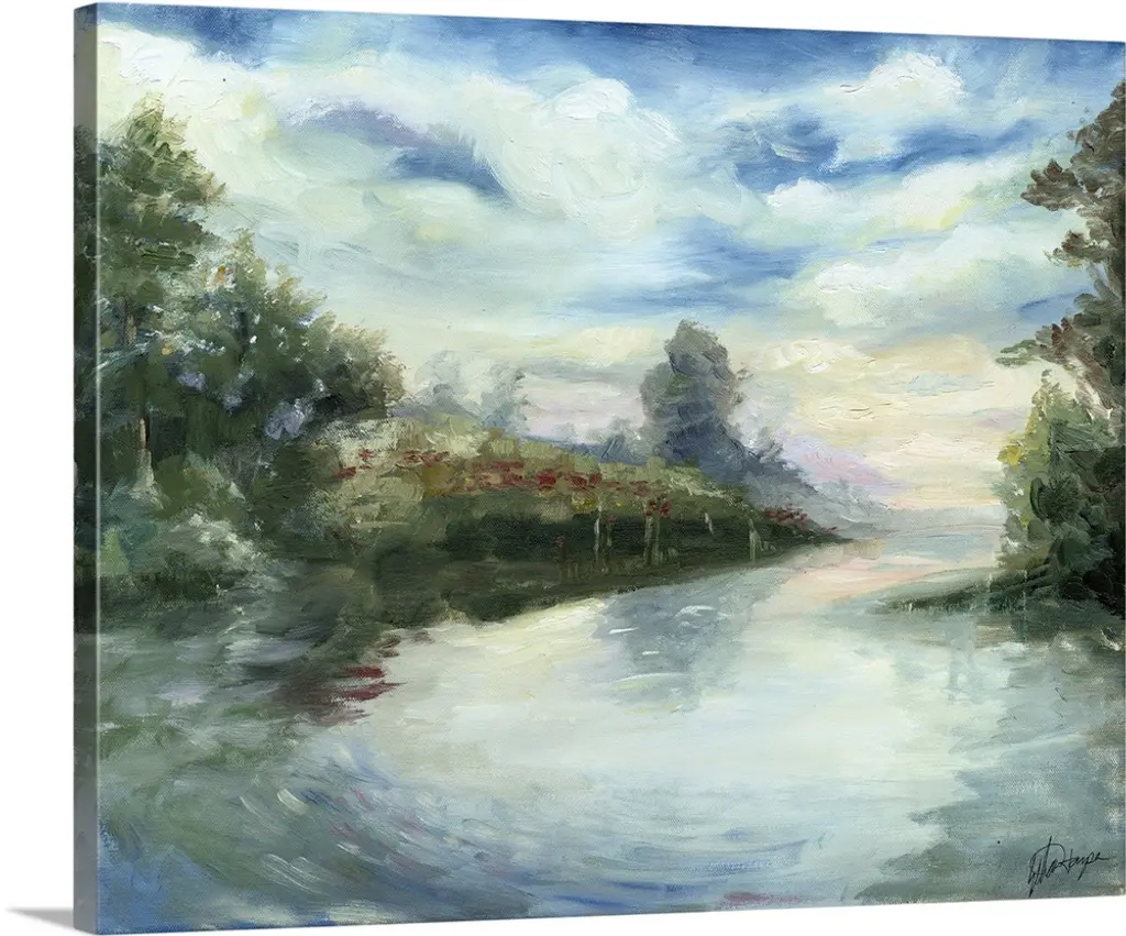 Abstract painted landscape with vivid structures. Wide horizon, clouds, bright light, a river with coastlines that are reflected in the water. Intense blue, orange and red