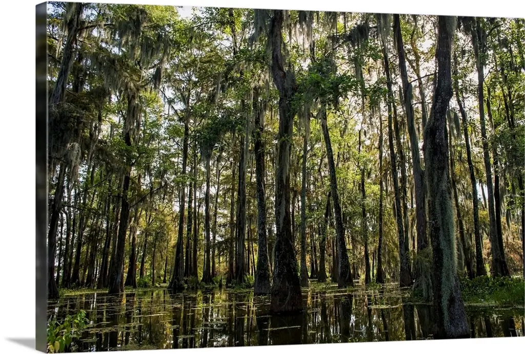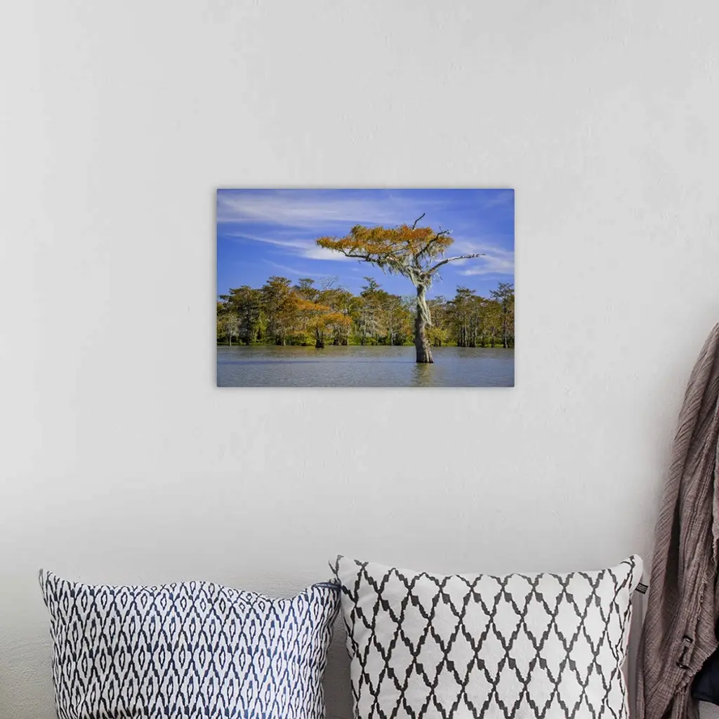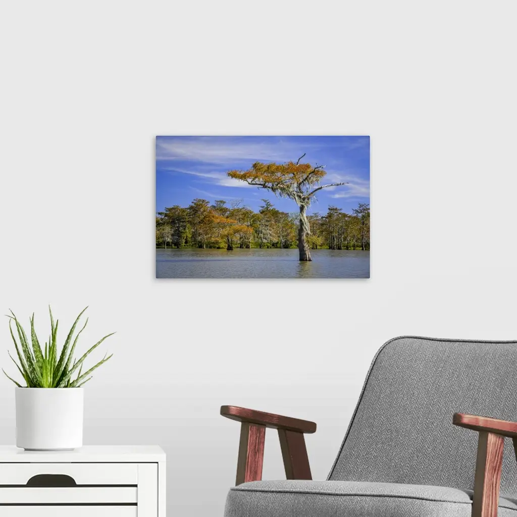 A Spanish moss-draped cypress tree stands alone in the Atchafalaya Basin's Grand Lake. The tree, which has begun turning autumn gold, is an iconic symbol of South Louisiana's extensive swamps.
