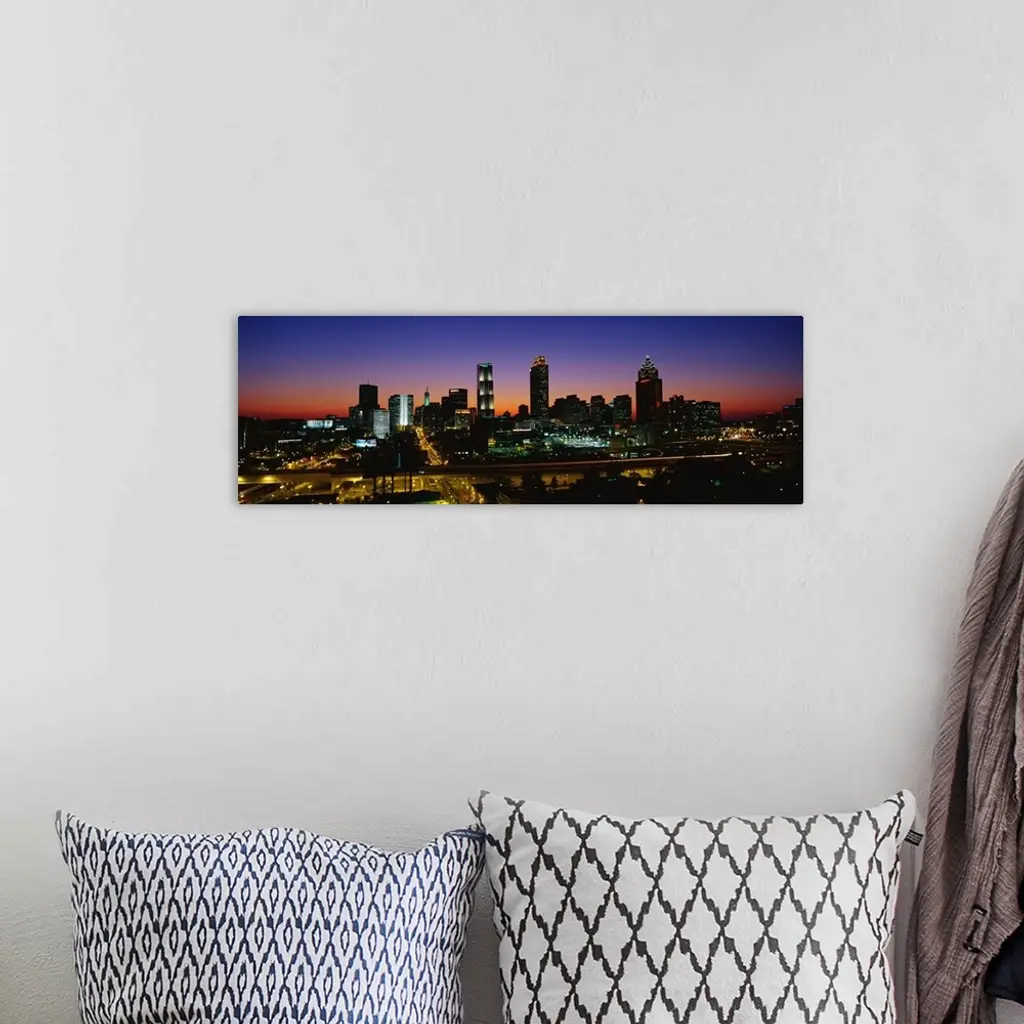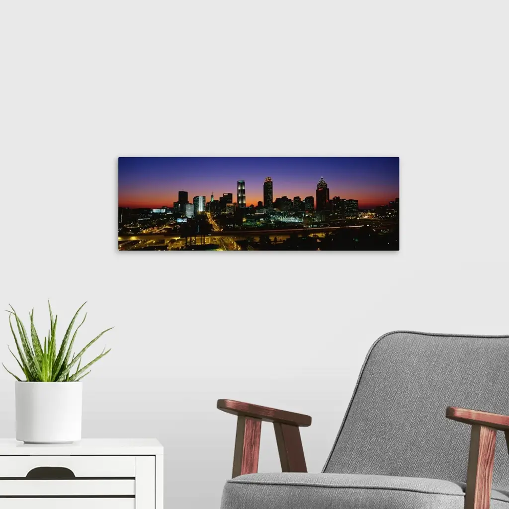 Panoramic photograph at nighttime shows an aerial view overlooking the illuminated skyline and busy streets within the capital city of Georgia. Photographer uses a slow shutter speed to get the fast-moving effect of the lights on the cars traveling through the streets below.
