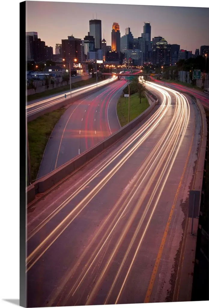 Light trails on the street from passing vehicles leading towards the city skyline of Atlanta, Georgia, at twilight.