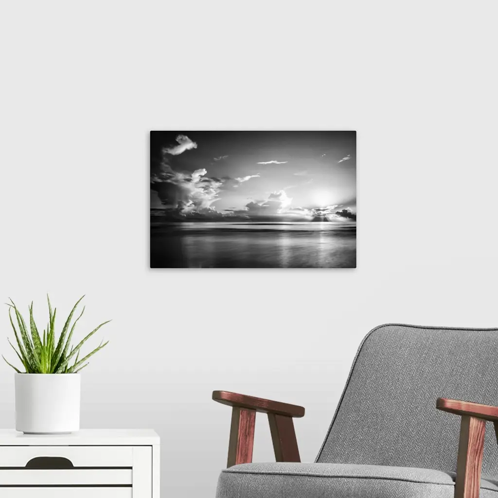 A black and white photograph of a sunrise sky with clouds obscuring the view.