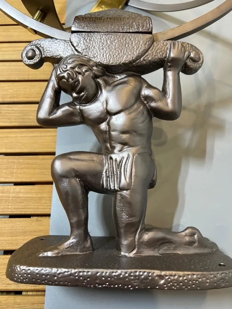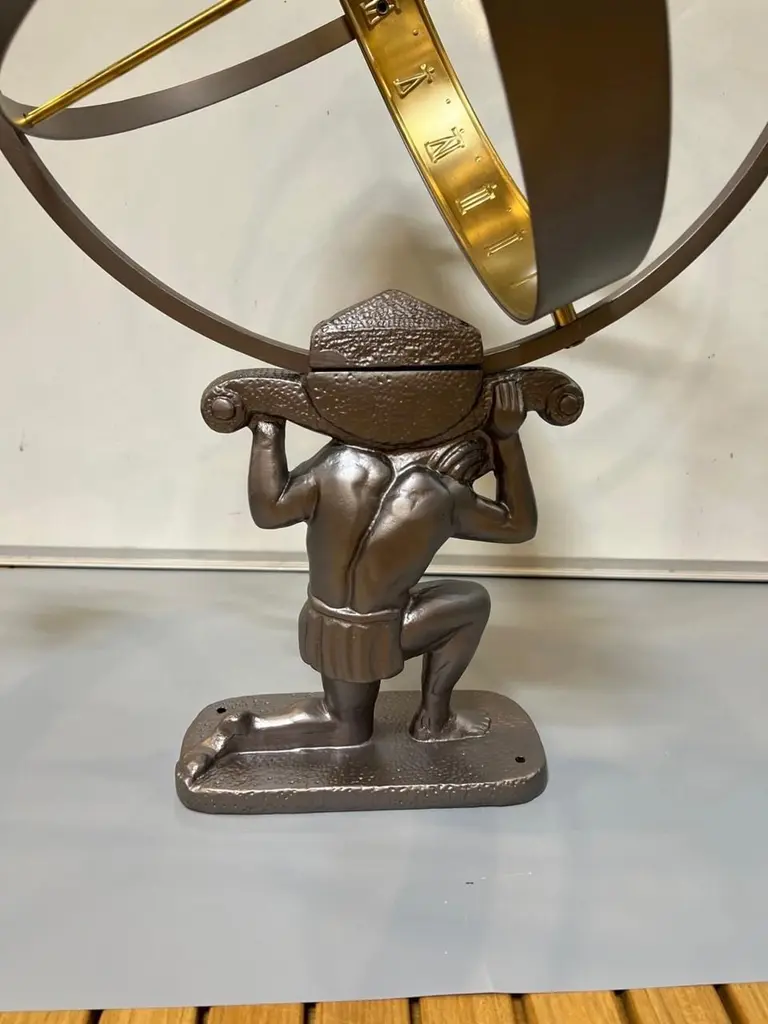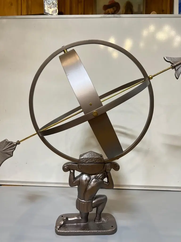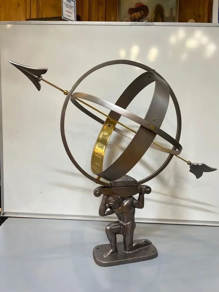 The Greeks have used sundials to measure time since 100 B.C. Reminiscent of classic Greek mythology, this Atlas Armillary Sundial will demand attention, whether placed in your home or garden.An exquisite and functional work of art, the sphere is imprinted with Roman numerals to measure time as the sun casts its shadow throughout the day, just as it did in ancient Greece. Cast aluminum atlas base figure and forged steel sphere with inner brass gnomon. Ships in a box unassembled but is very easy to assemble its a great piece.