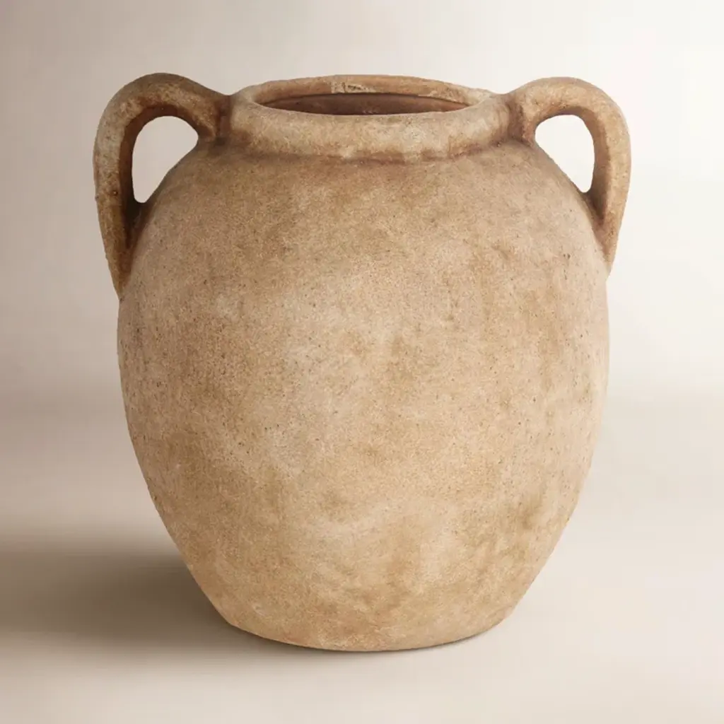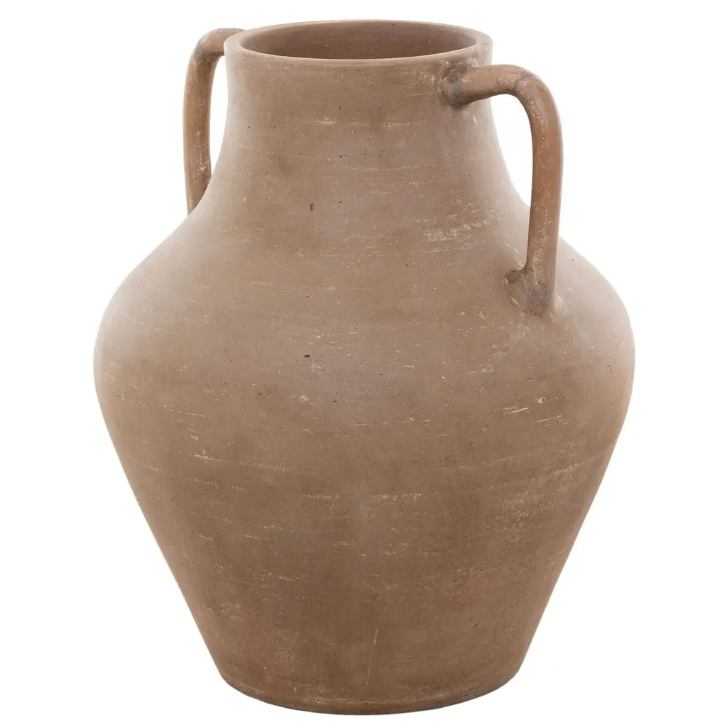 Hand-thrown clay ensures each piece of this Grecian-style vase with slim arch handles has unique character. Not water-tight; for decorative use only.