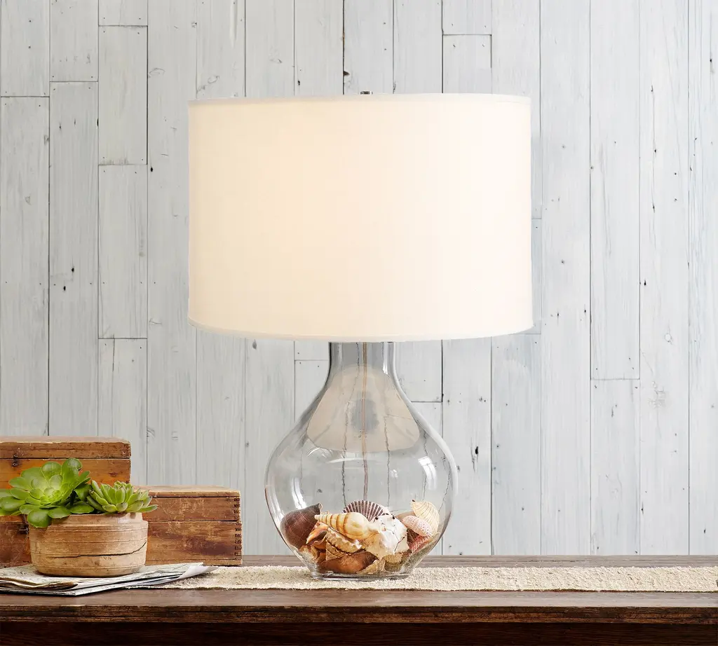 The clear blown-glass base of the Atrium Table Lamp offers countless possibilities for personal decorating. Fill it with favorite objects, faux botanicals or vase fillers to create a look that’s all your own. This lighting is crafted by artisans in a Fair Trade certified factory.