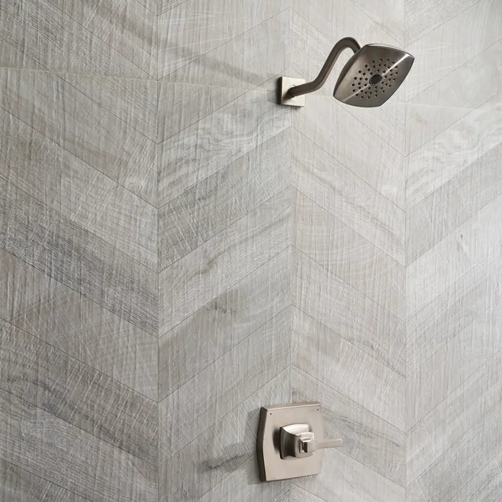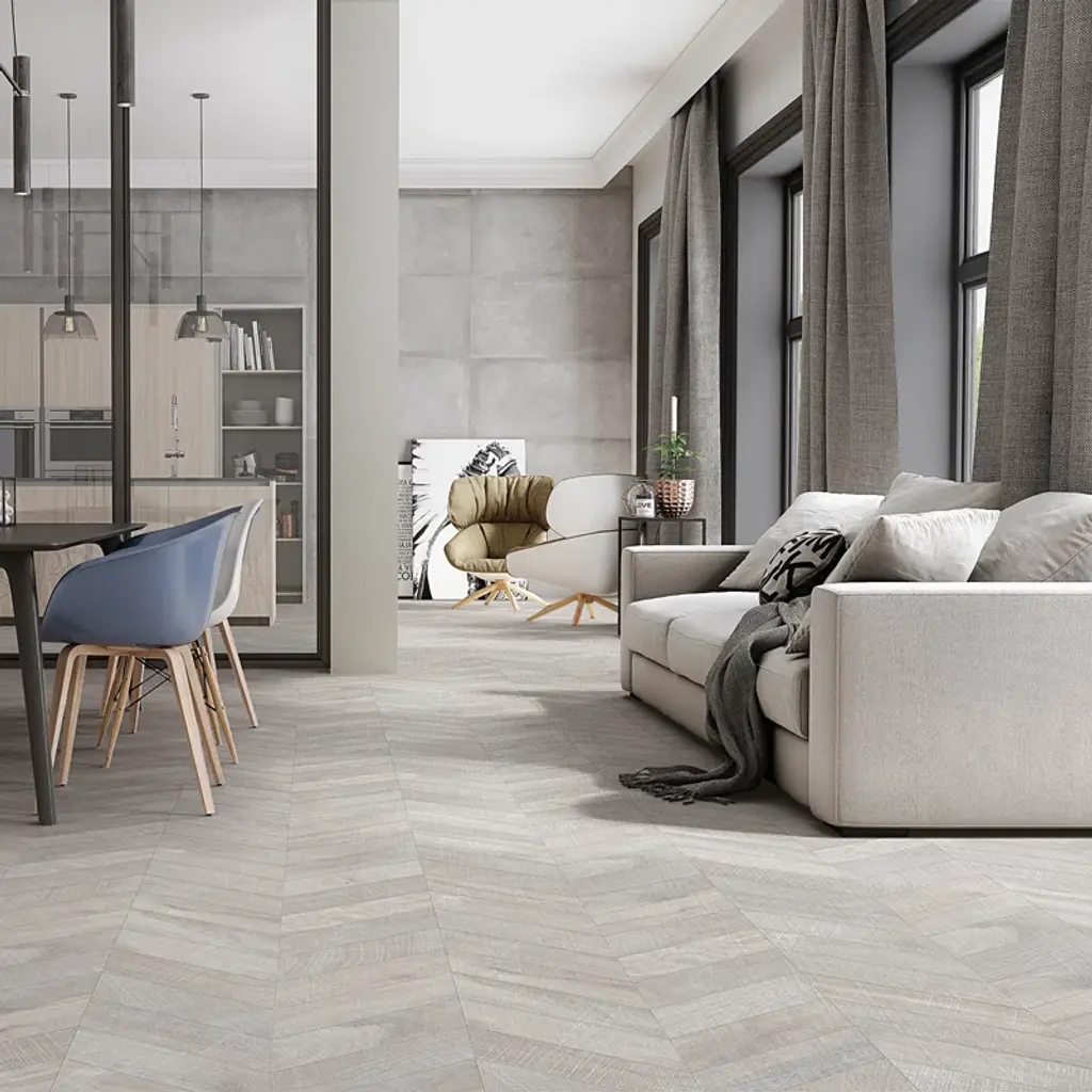 The Auburn Chevron porcelain tile is a twist on traditional wood flooring at an affordable price point. This matte, tile mimics real brown wood with the appearance of a slight, grainy texture and pale color. Plus, its chevron lay pattern creates fluid movement. Use on walls or floors, indoors or out.