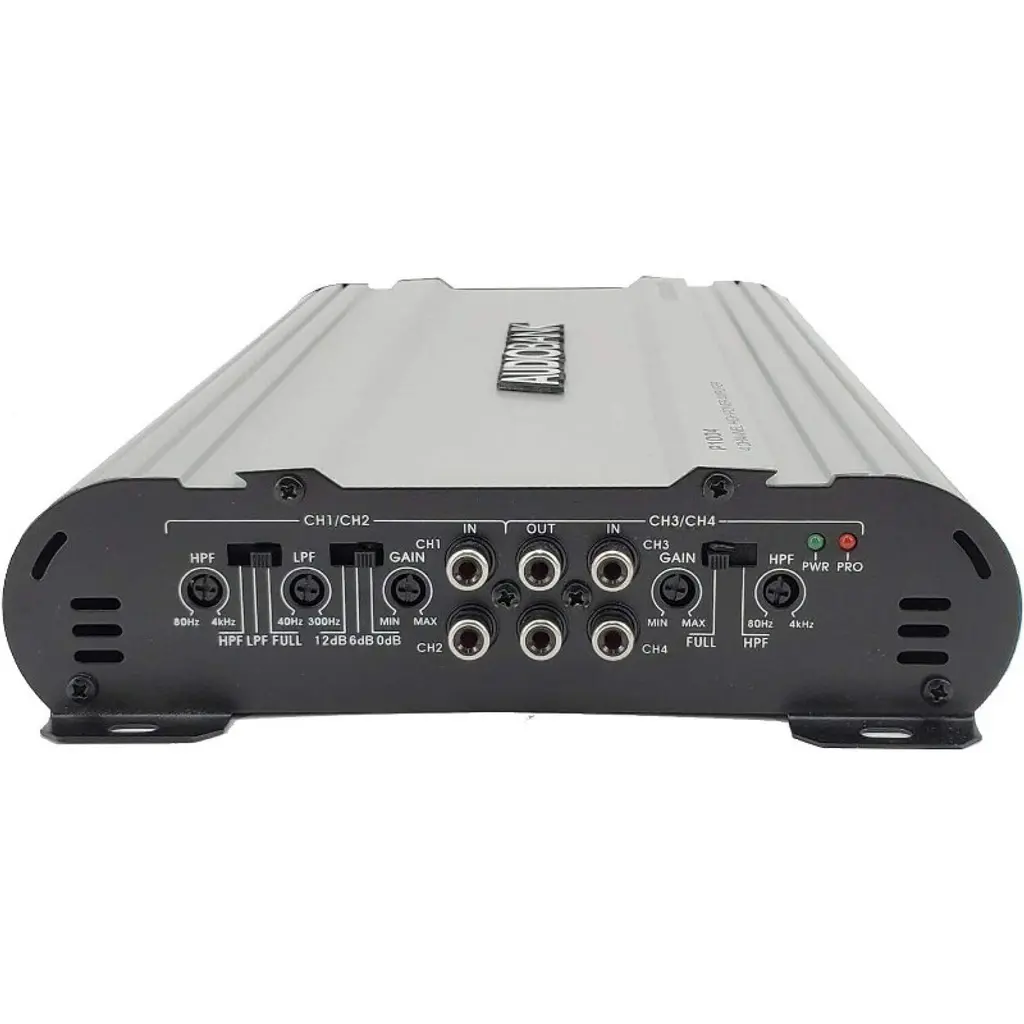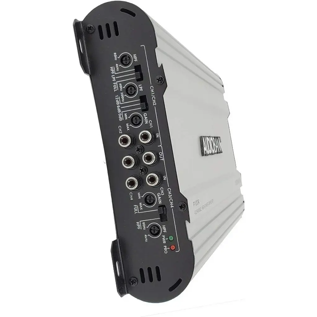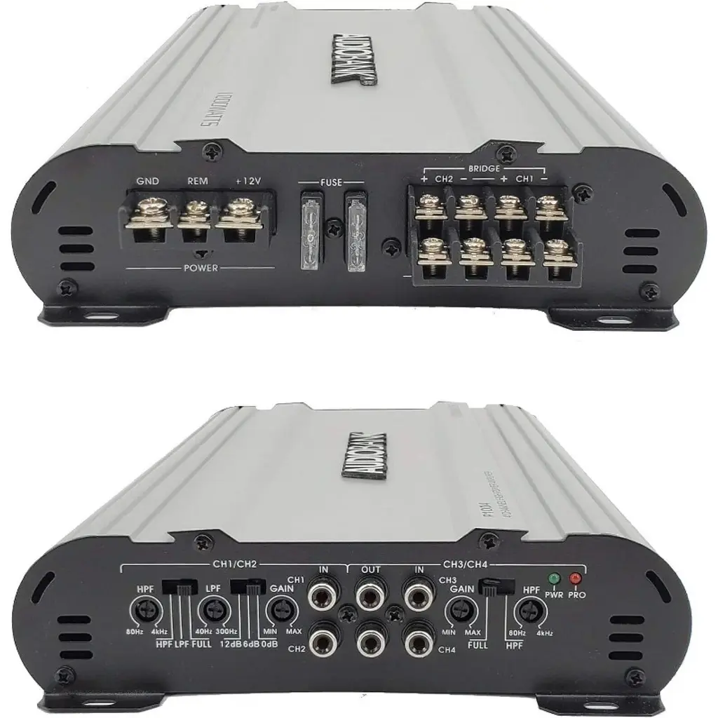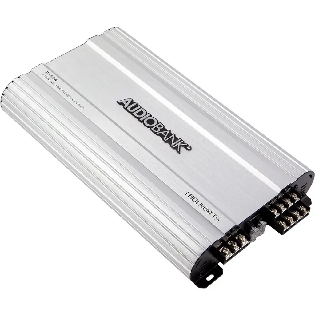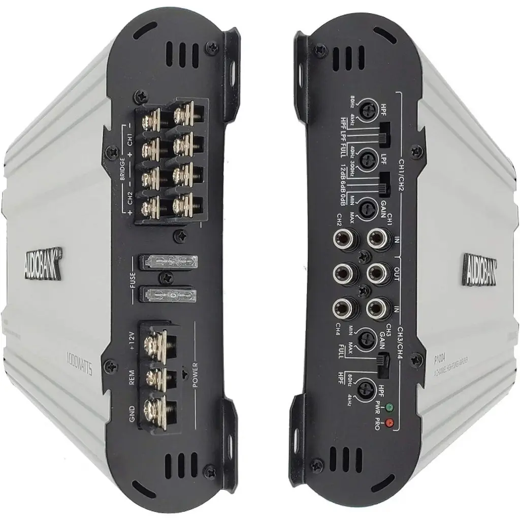 Audiobank amplifiers Audiobank 4 Channels 1000 WATTS Bridgedable Car Audio Stereo Amplifier P1004 Heavy-Duty Aluminum Alloy Heatsink | Class A-B Operation Remote On /Off Circuit The Audiobank amplifiers are considered to the best car audio amplifiers in the world. They are famous for being excellent with bass and voice. Audiobank amplifiers are excellent in power and reliability compared to anything else on the market in its' class. Designing the most efficient, well built, high quality amplifiers is where we start here at Audiobank. It boosts the car audio sound and improves music quality, clarity, and intelligibility. Best Performance, best in budget. Audiobank 4 Channels 1000 WATTS Bridgedable Car Audio Stereo Amplifier P1004 has 2 Ohm Stable Operation & Soft Turn On Circuit, Thermal and Speaker Short Protection Circuitry, Heavy-Duty Aluminum Alloy Heatsink | Class A-B Operation, Remote Turn-On / Turn-Off Circuit, LED Power and Protection Indicators Our customers are love it and we are getting good reviews and feedback from them.