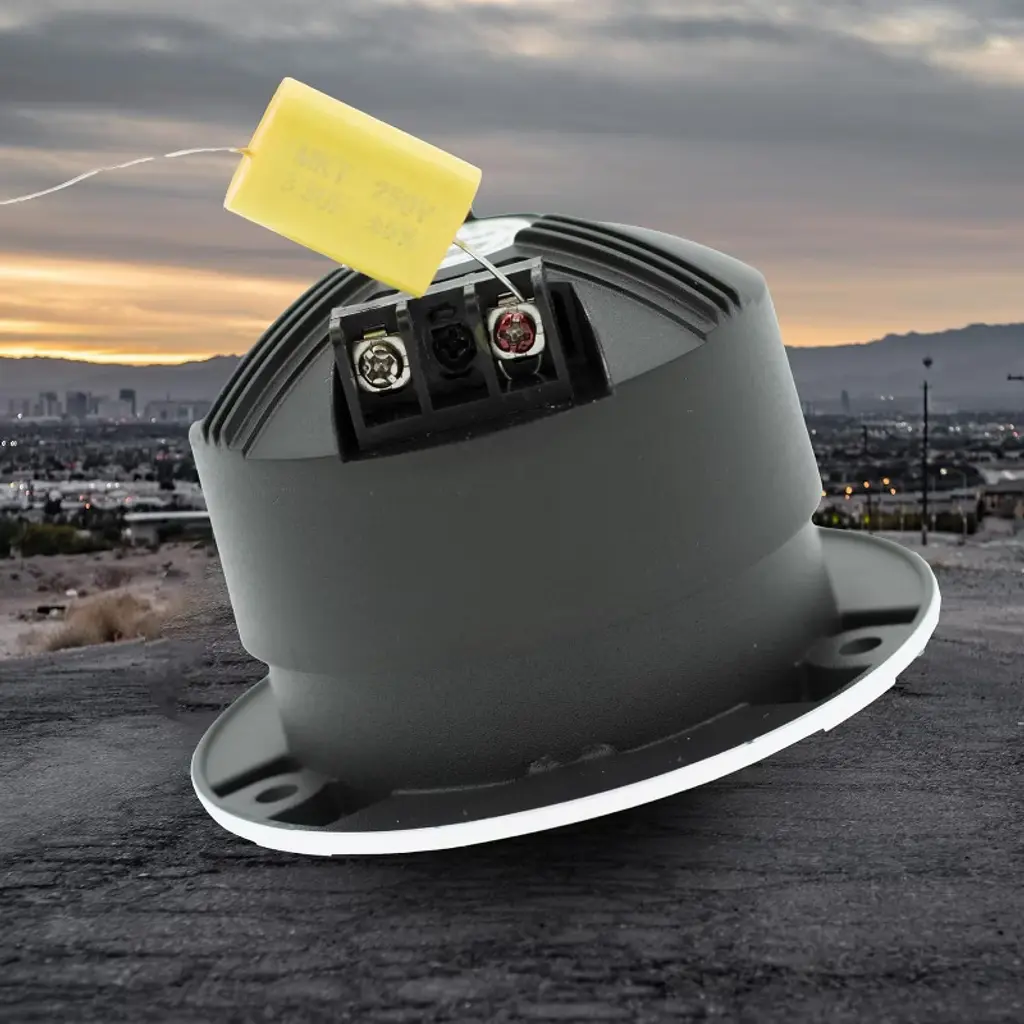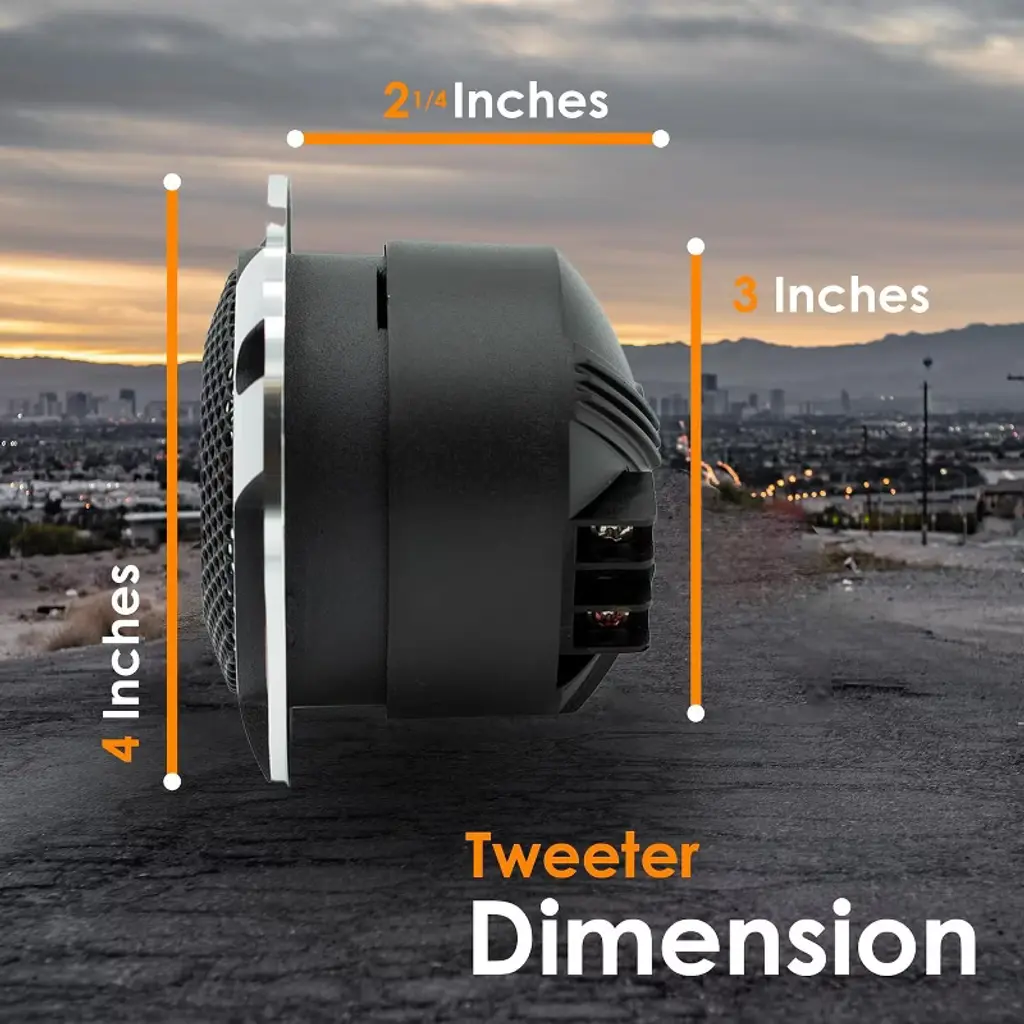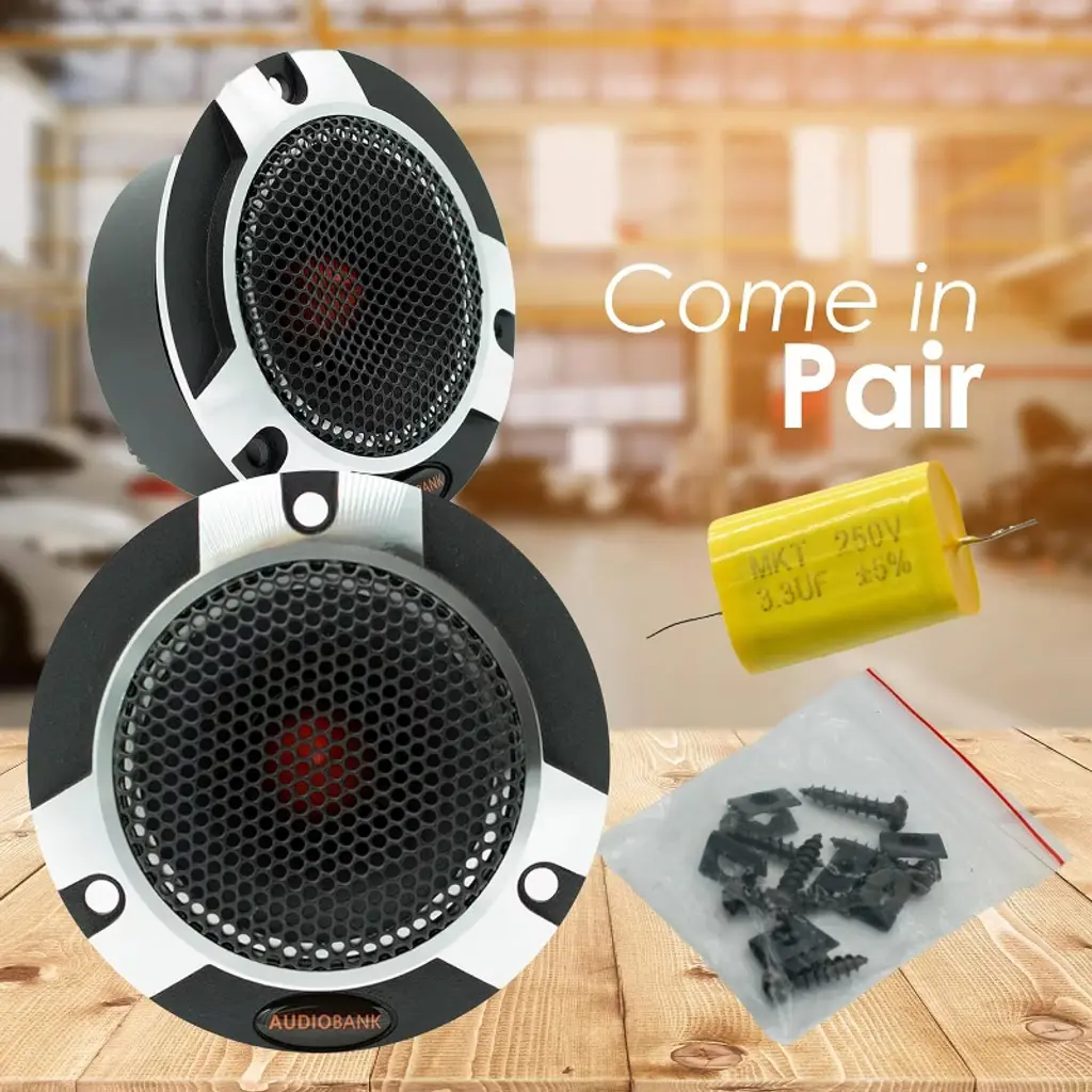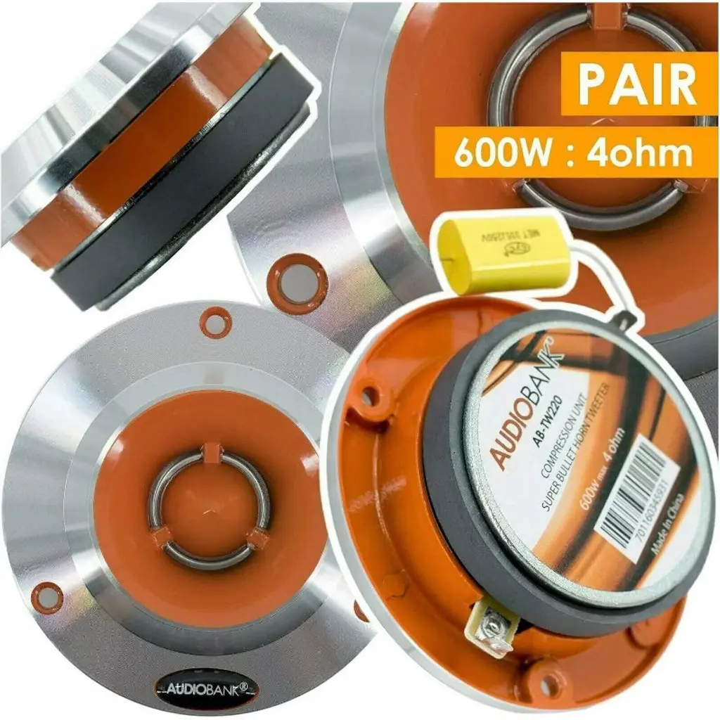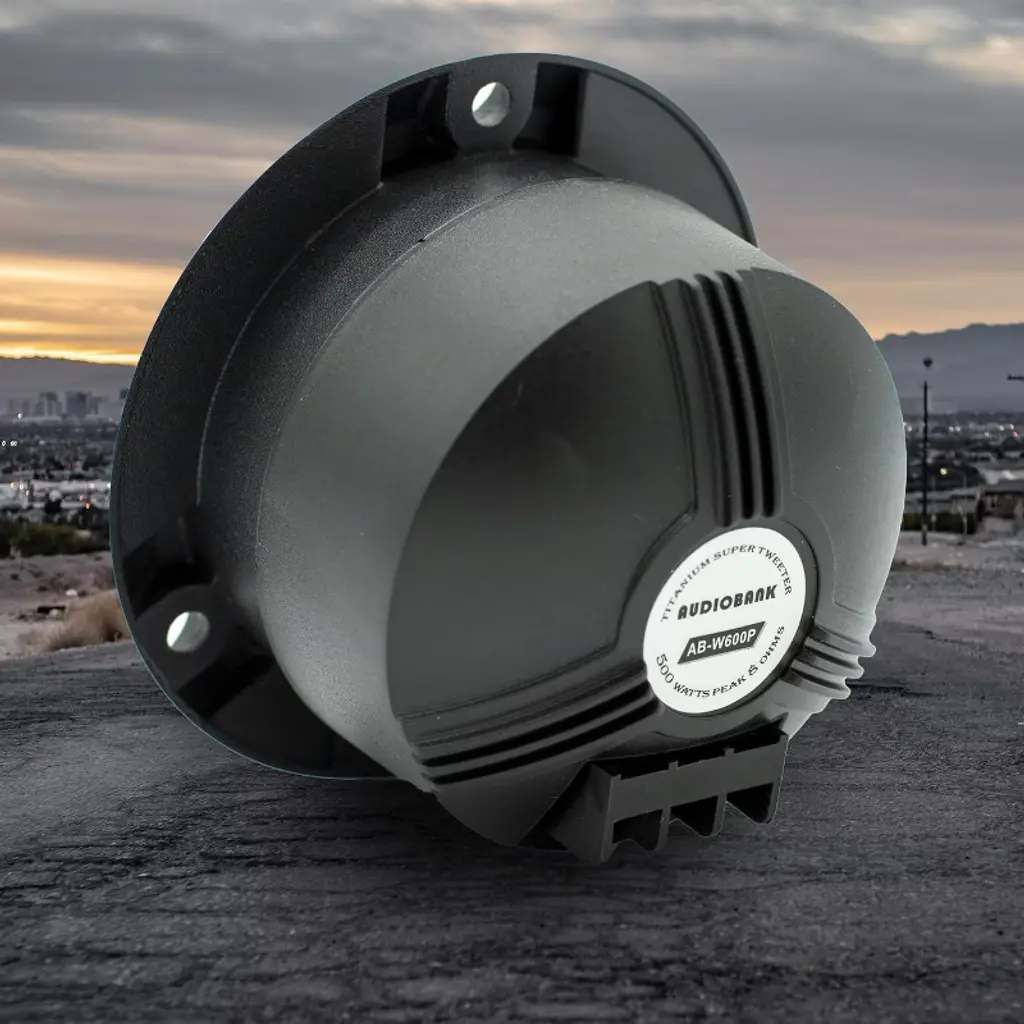 Revolutionize your driving soundtrack with the Audiobank AB-W600P 1" Titanium Car Super Bullet Tweeter. Elevate your car audio experience to new heights with this high-performance tweeter, designed to deliver crisp highs and powerful sound with every drive. Crafted with a 5.4 oz magnet, this tweeter boasts a maximum power handling of 500 watts, ensuring an immersive audio experience that fills your vehicle with rich, detailed sound. Whether you're cruising down the highway or stuck in traffic, enjoy crystal-clear audio reproduction that brings your favorite music to life. Compatible with both 4 and 8 ohm systems, the Audiobank AB-W600P offers versatility to suit a range of audio setups. Its exceptional sensitivity rating of 101dB/w/m ensures clear and dynamic sound reproduction, capturing every nuance and subtlety in your music. Featuring a wide frequency response range of 2k - 25kHz, this tweeter ensures accurate audio reproduction across the entire spectrum, from deep bass to sparkling highs. Whether you're a rock aficionado or a classical connoisseur, experience the full clarity and detail of your favorite music genres like never before. The Audiobank AB-W600P comes complete with a crossover capacitor, allowing you to fine-tune the audio output and seamlessly integrate it with your existing car audio system. Plus, with easy installation screws included, setting up your new tweeters is a breeze, making it suitable for both DIY enthusiasts and professional installers alike. Upgrade your car audio system today with the Audiobank AB-W600P 1" Titanium Car Super Bullet Tweeter and immerse yourself in a world of unparalleled sound quality and clarity on the road.