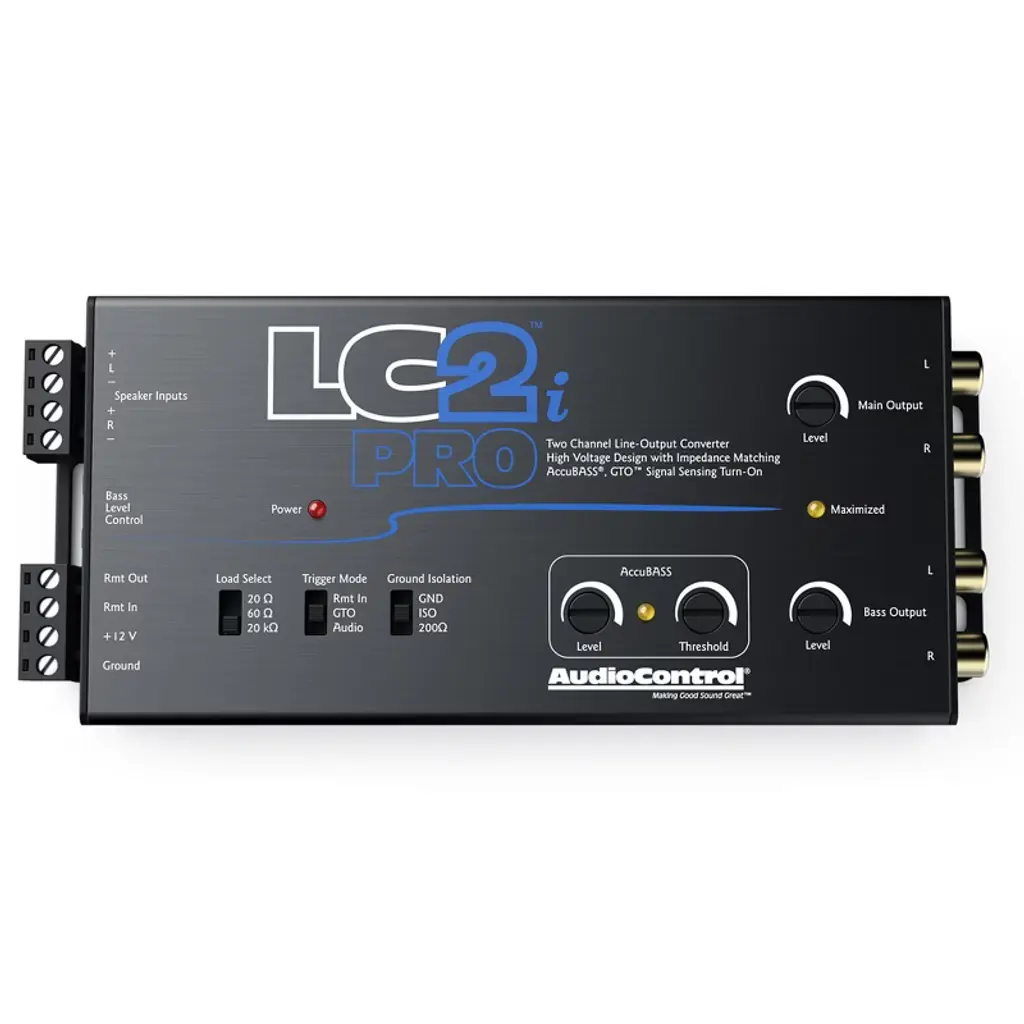 The LC2i PRO join ranks with AudioControl’s most popular active line output converter, the LC2i. Adding a sub? Planning a full system? Either way, get the best possible signal from your factory sound system to your amplifiers. Load selection switches mean OEM integration has never been easier and the LC2i PRO will work with the most finicky factory sound systems. Installer friendly turn on trigger modes allow for flexibility via GTO™ Signal Sense (DC offset), audio sense, or remote 12 volt inputs. Compensate for factory bass roll-off with AudioControl’s patented AccuBASS® and control your sub with the included ACR-1 level control. Features • Two channels of active speaker level inputs (up to 40V input handling) • Fixed and variable outputs with discrete level controls • AccuBASS® processing for correction of bass roll-off • Load Selection Switch • GTOTM Signal Sensing • Ground Isolation Switch • ACR-1 dash remote inluded • Compact design Specifications • Speaker Level Input: 1 (2 channels) • Maximum Speaker Level Input: 40 Vrms / 400 W (20kΩ setting) • Input Impedance (selectable): 20Ω, 60Ω, 20kΩ • Preamp Outputs: 2 (2 channels main, 2 channels bass) • Maximum Output Level: 9.5Vrms/13V peak • Output Gain: +/- 12 dB • Output Impedance: 150Ω • Total Harmonic Distortion: 0.01% • Signal to Noise: >110 dB • Frequency Response: 20 Hz – 50 kHz ±1 dB • Remote In / GTO™ Signal Sense / Audio Sense • 12VDC Remote Out (always active when unit is on) • Current Draw: 200 mA • Recommended Fuse Rating: 1 A • Dimensions: 6.9″ L x 3″ D x 1″ H (including speaker connectors) • Weight: 0.75 lbs. (0.34 kg)