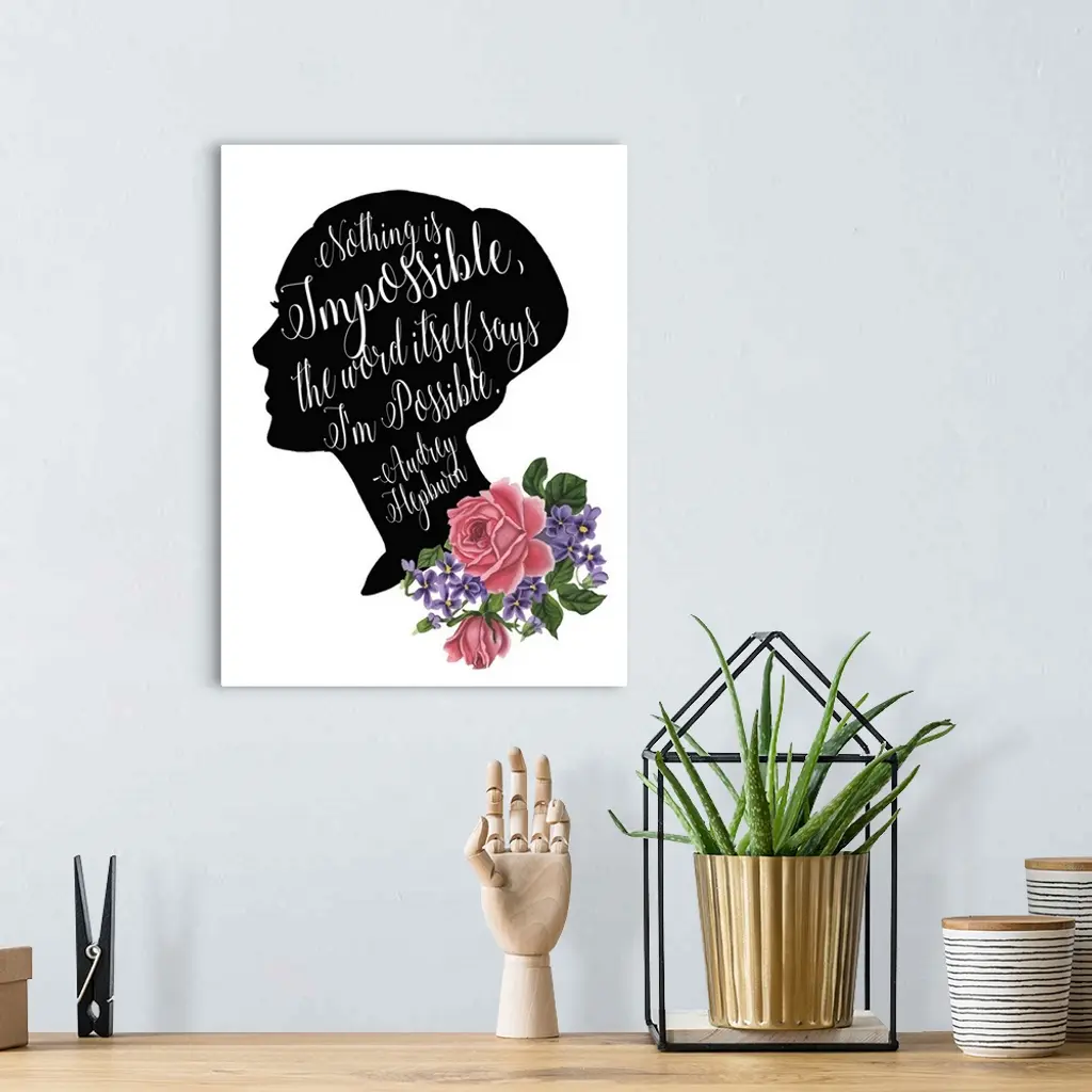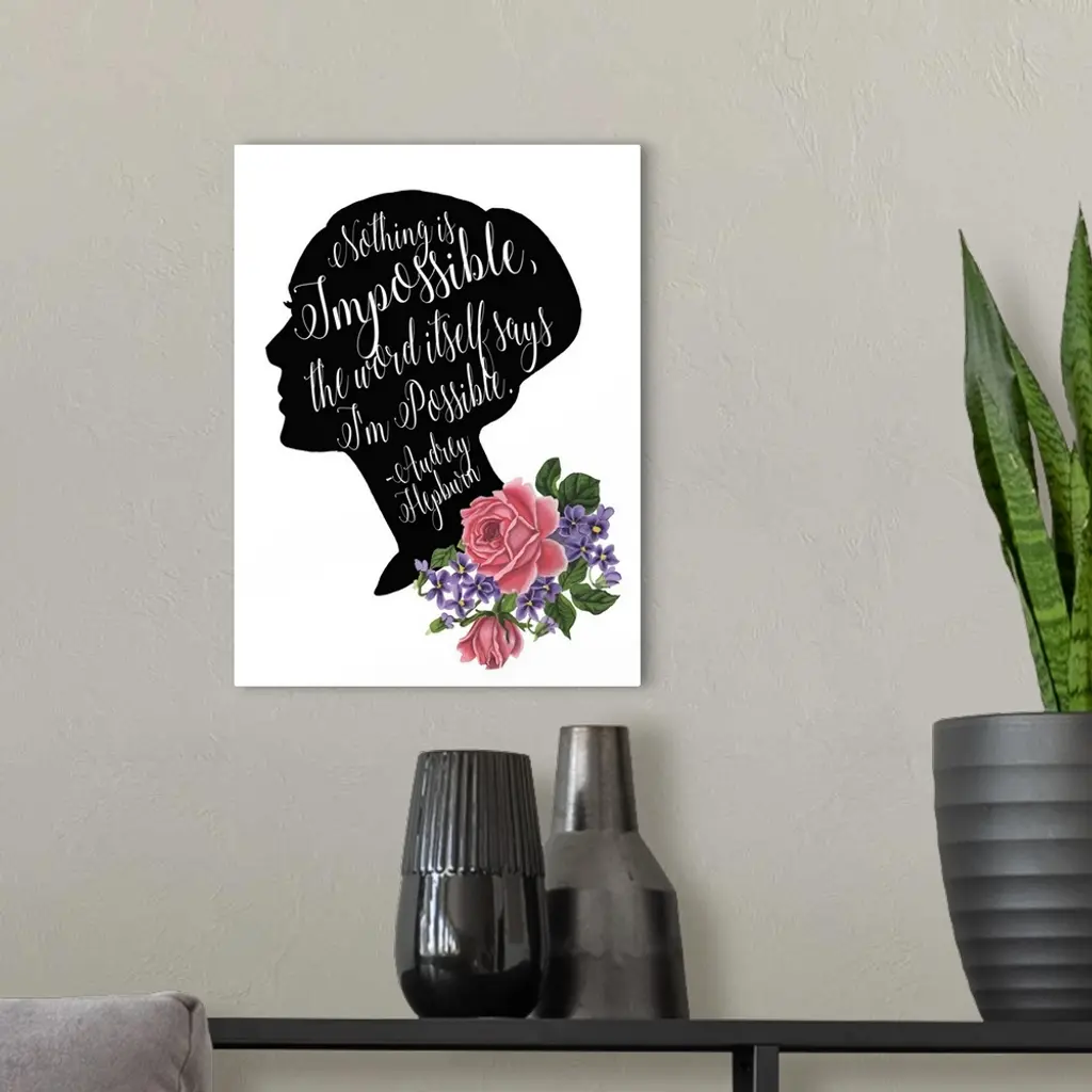 Inspirational sentiment by Audrey Hepburn handwritten in a profile silhouette.