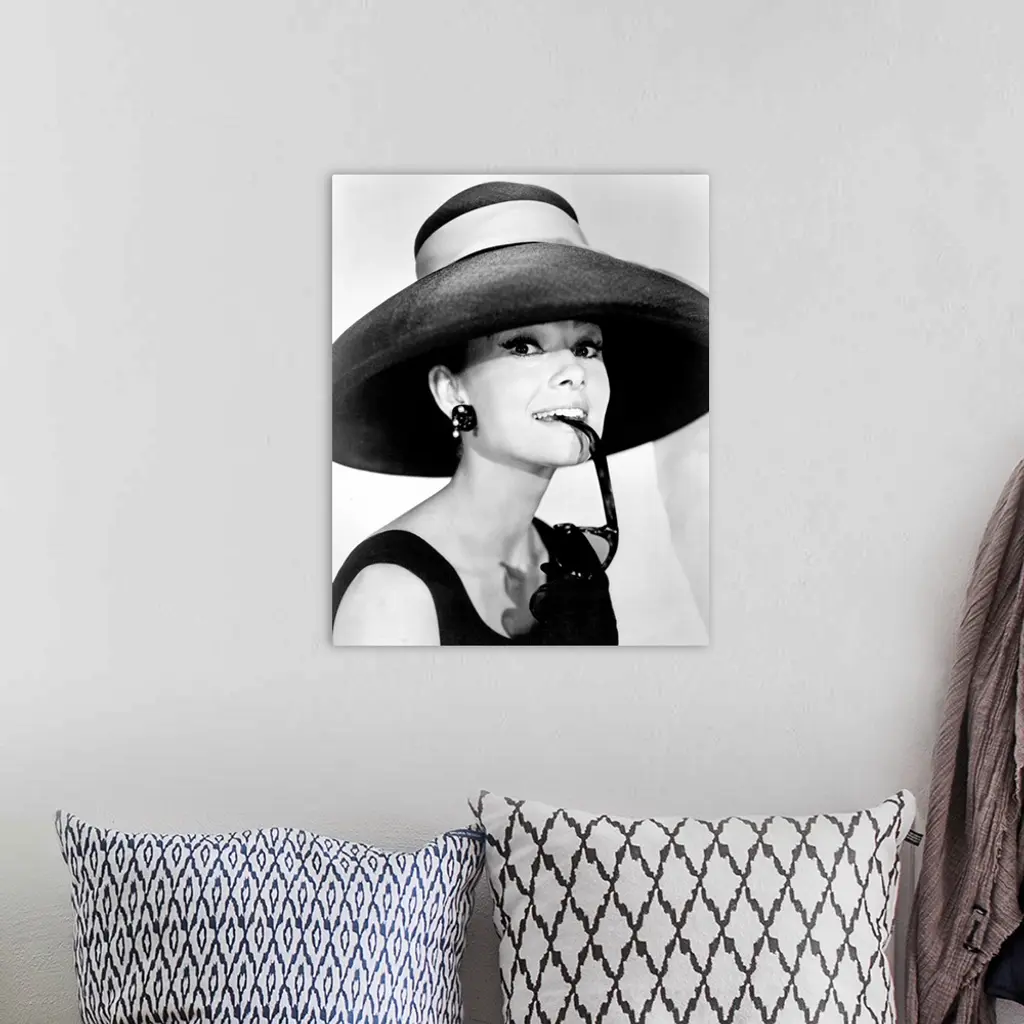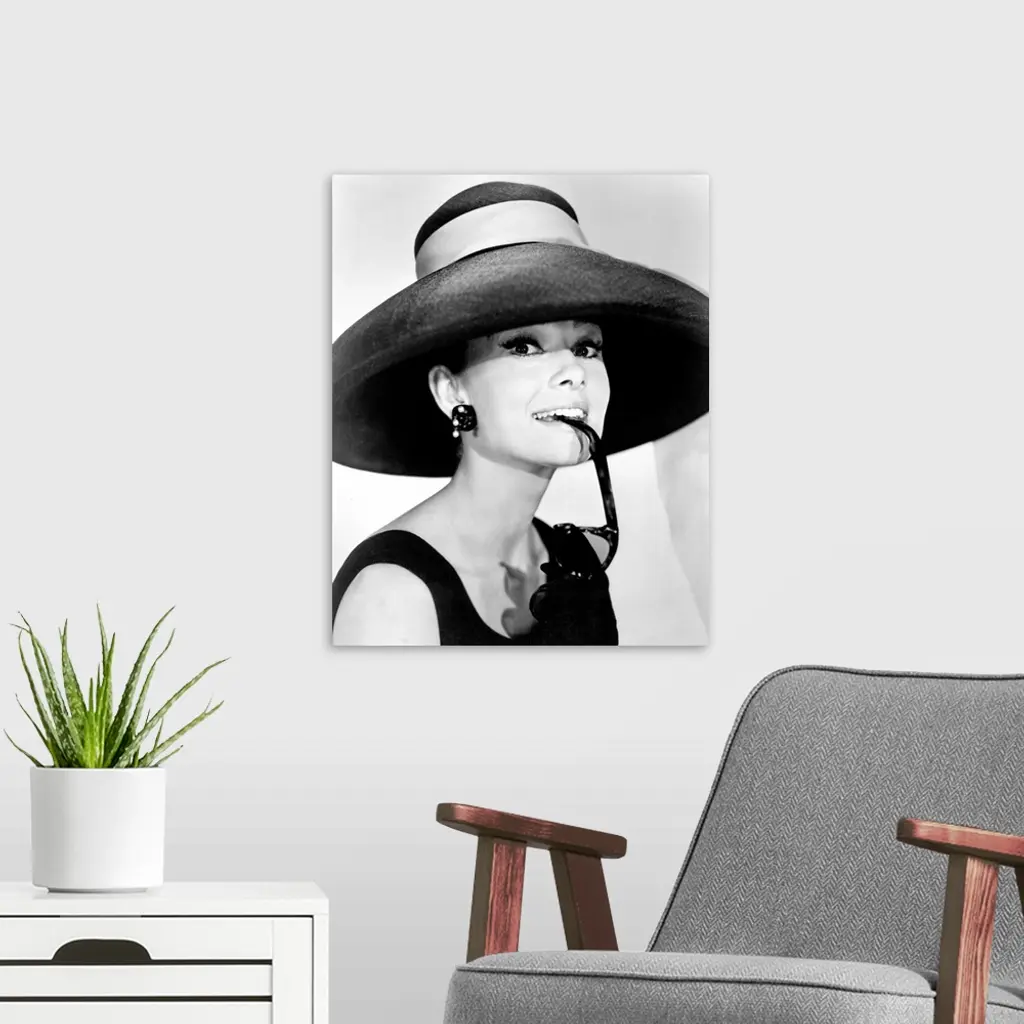 Large photograph of Audrey Hepburn in a giant sun hat holding sunglasses in her mouth as she glances at the camera in a black dress.
