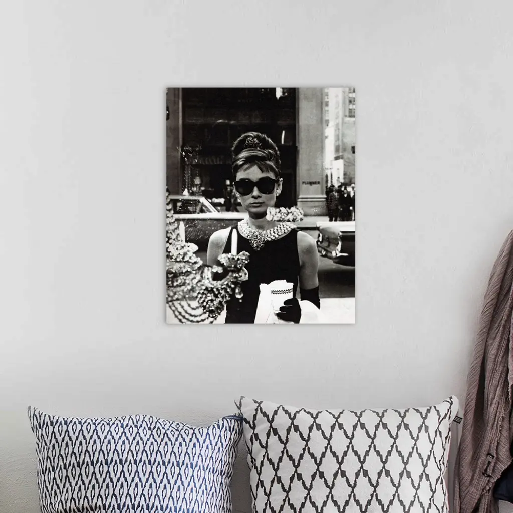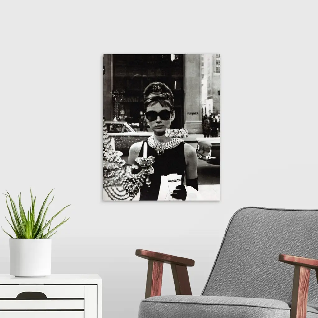 Movie still of the actress Audrey Hepburn wearing an elegant black dress and extravagant jewelry looking into the window of a shop.