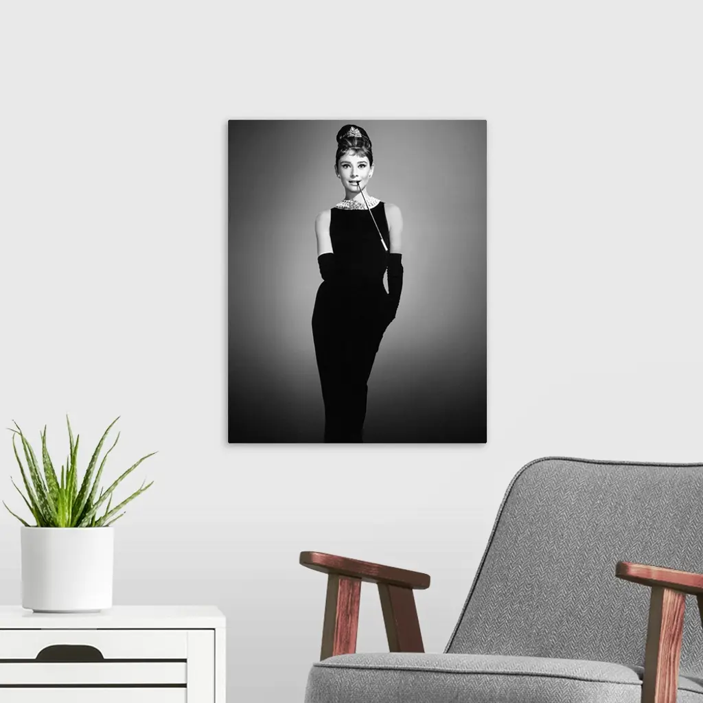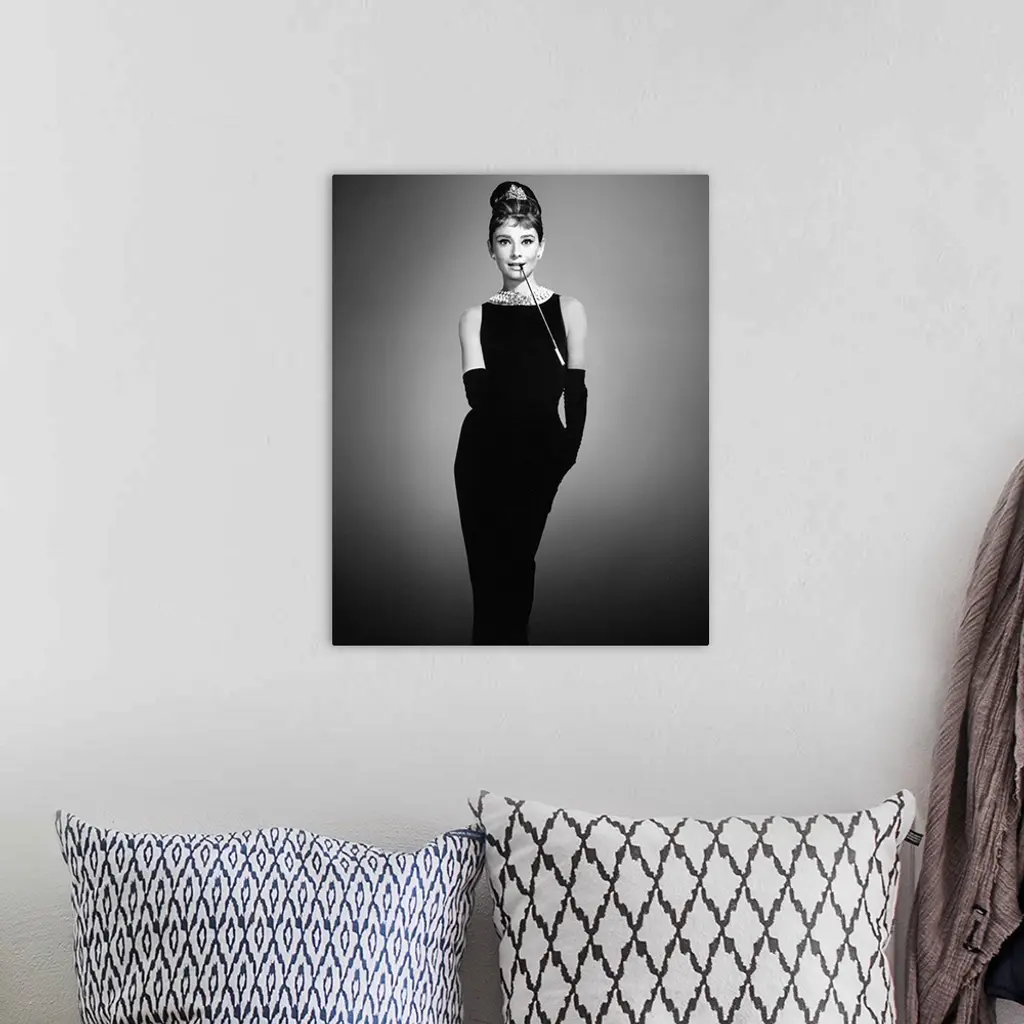 Audrey Hepburn in her classic "Breakfast at Tiffany's" outfit on a soft background.