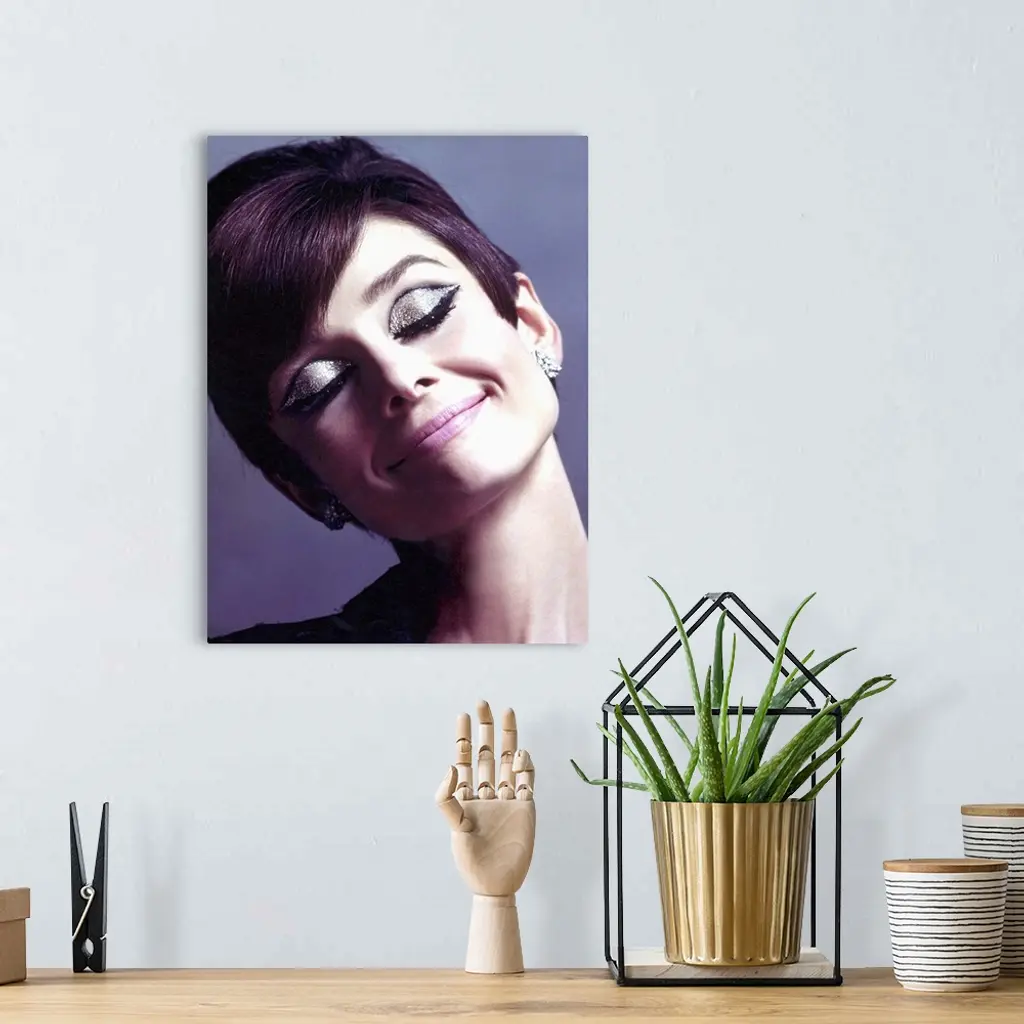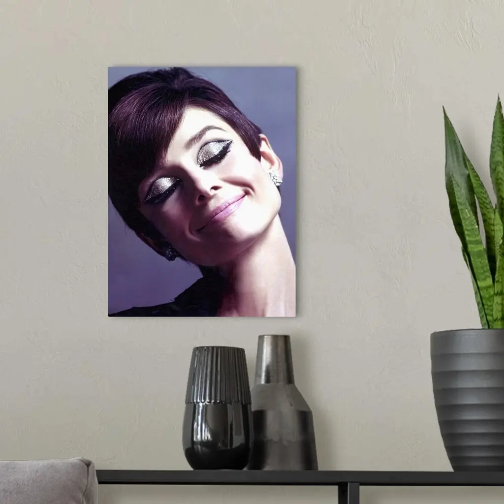 Canvas photo art of Audrey Hepburn with sparkling eye make up smiling.