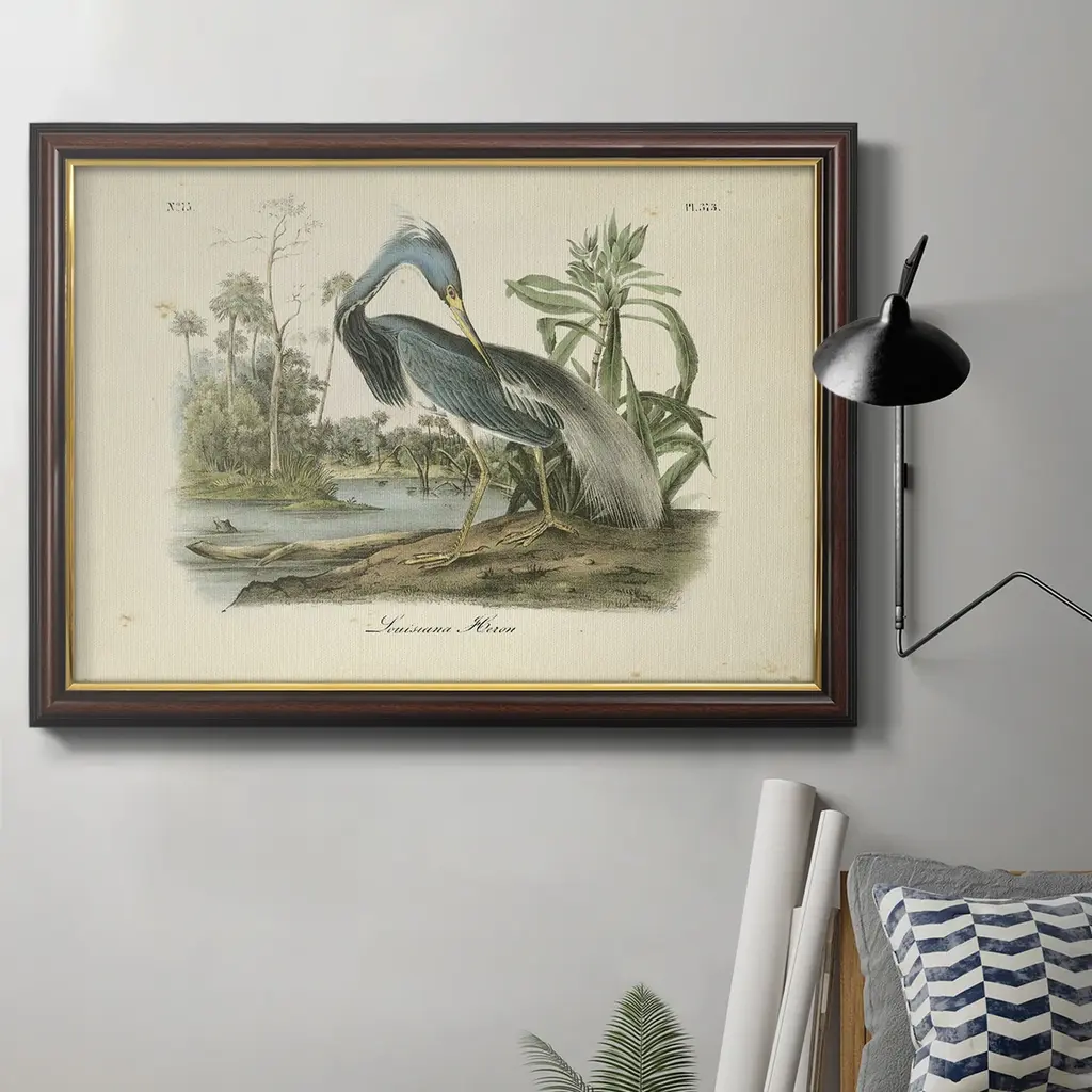 The Audubon Collection Group is a series of prints on watercolor paper, showcasing stunning depictions of majestic avian species. This piece is displayed under glass within a traditional black and gold gallery frame.