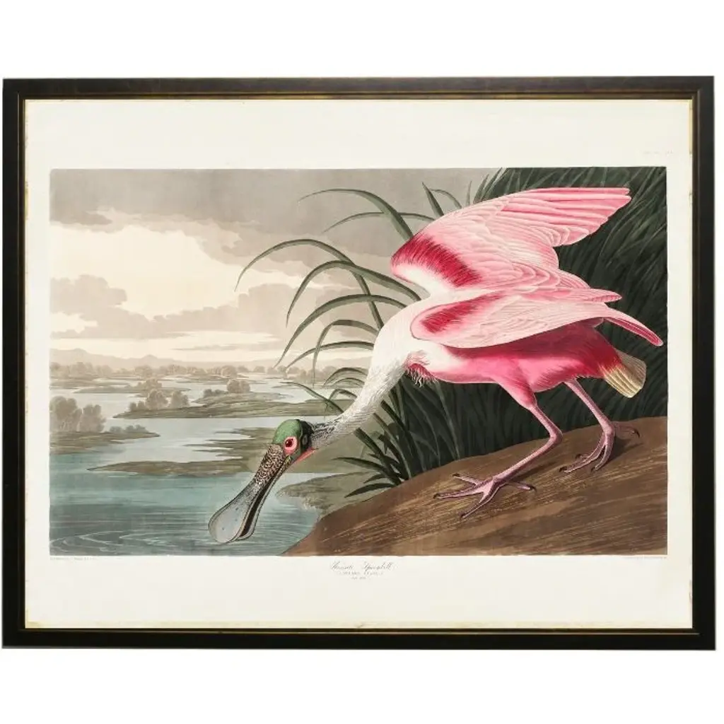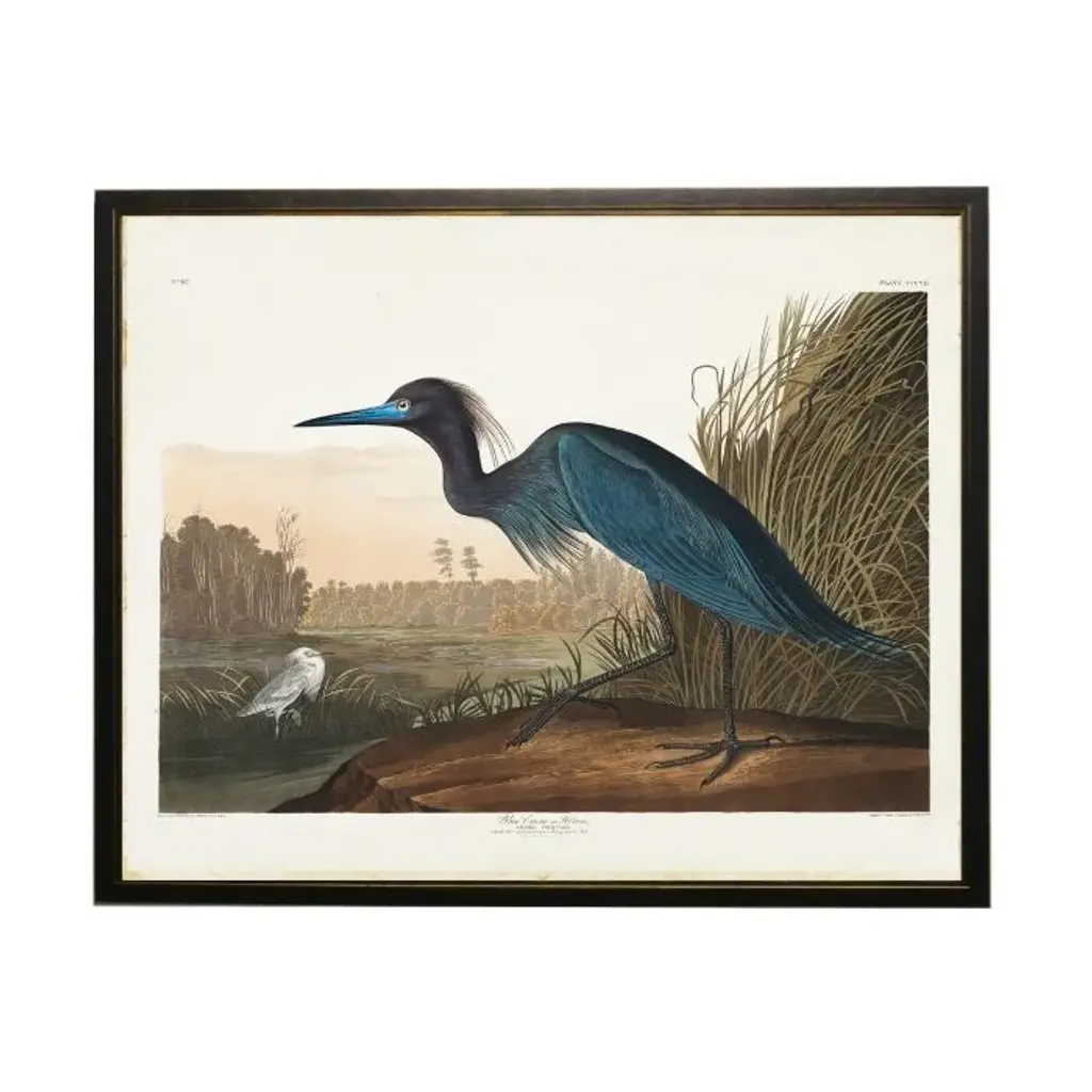 The Audubon Collection Group is a series of prints on watercolor paper, showcasing stunning depictions of majestic avian species. This piece is displayed under glass within a traditional black and gold gallery frame.