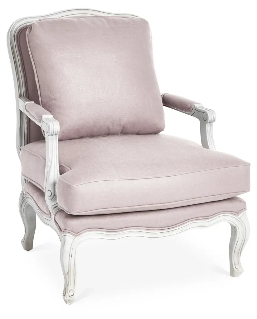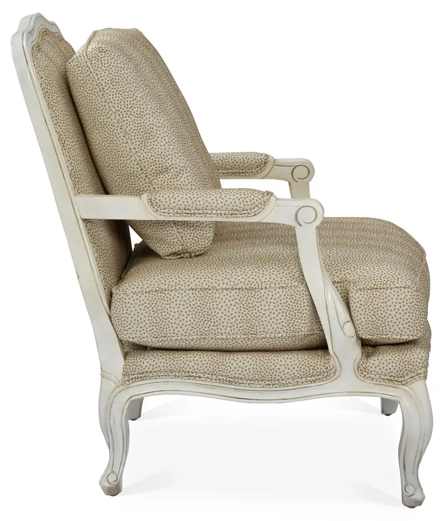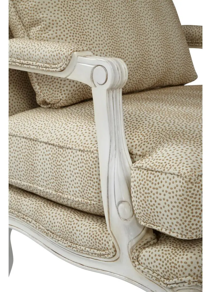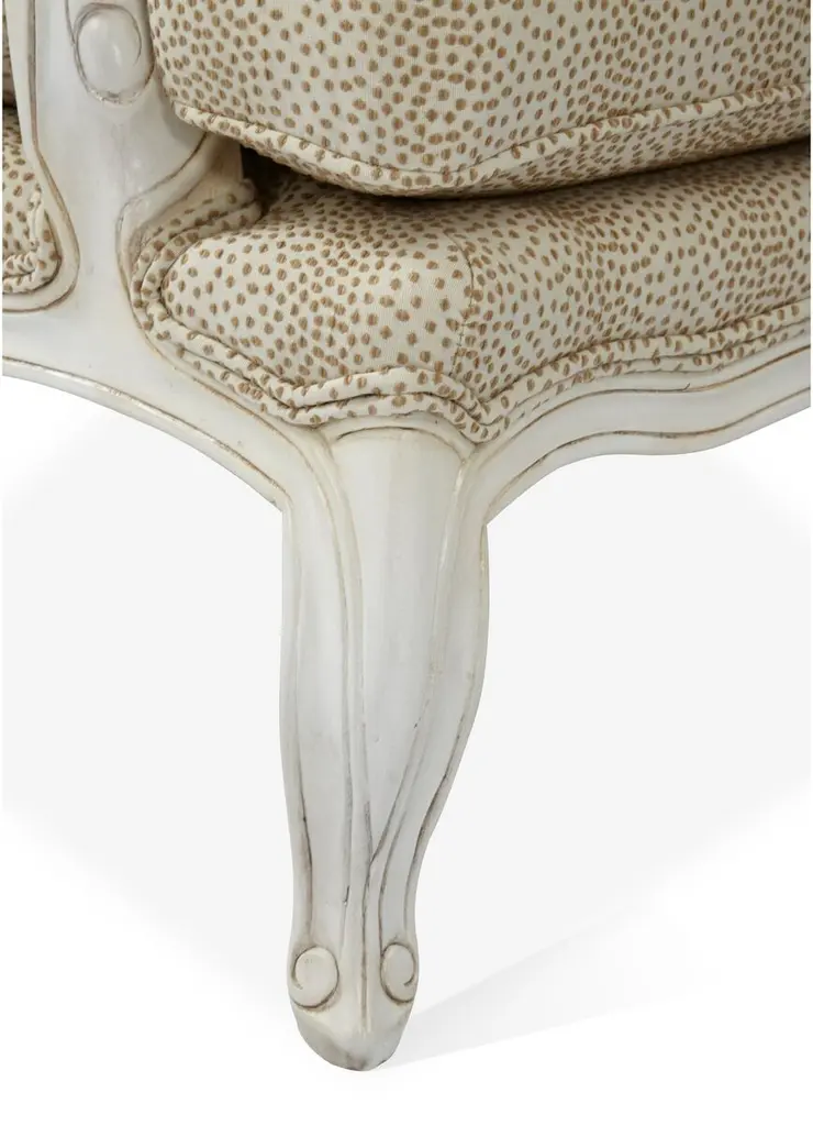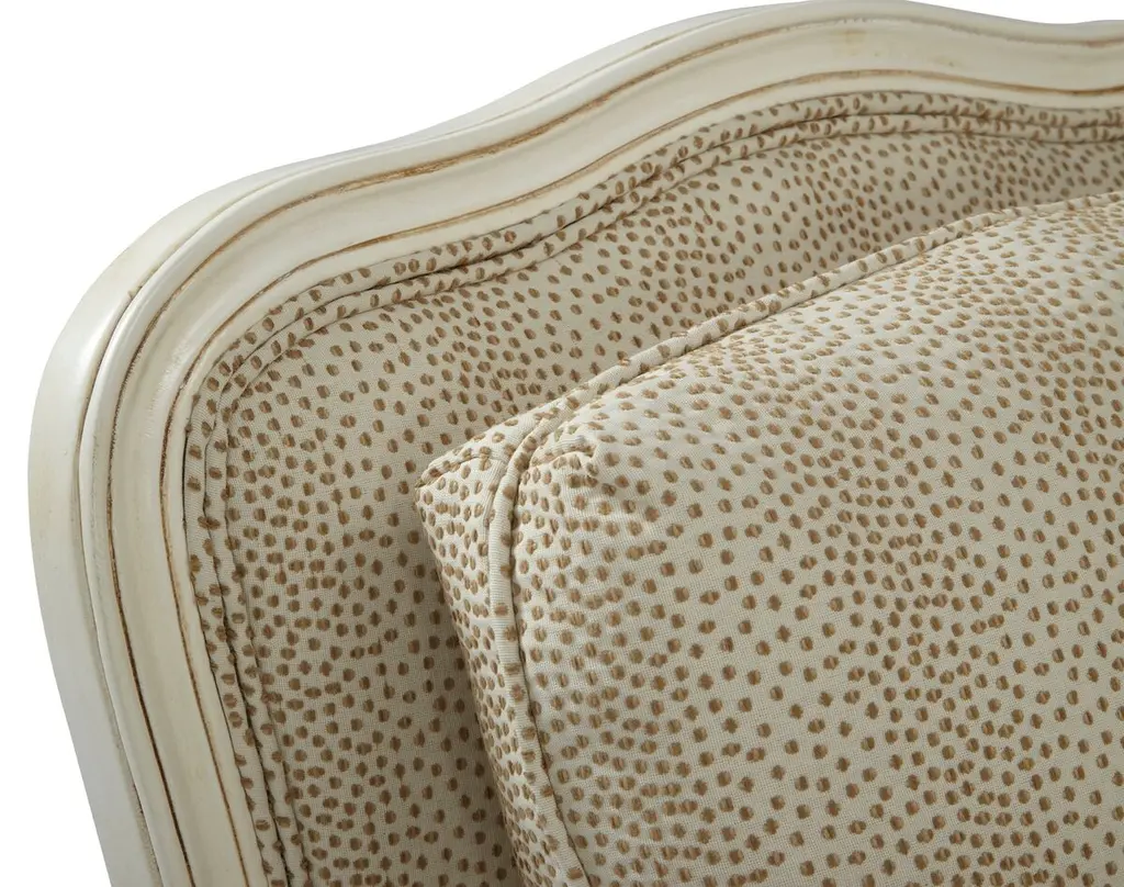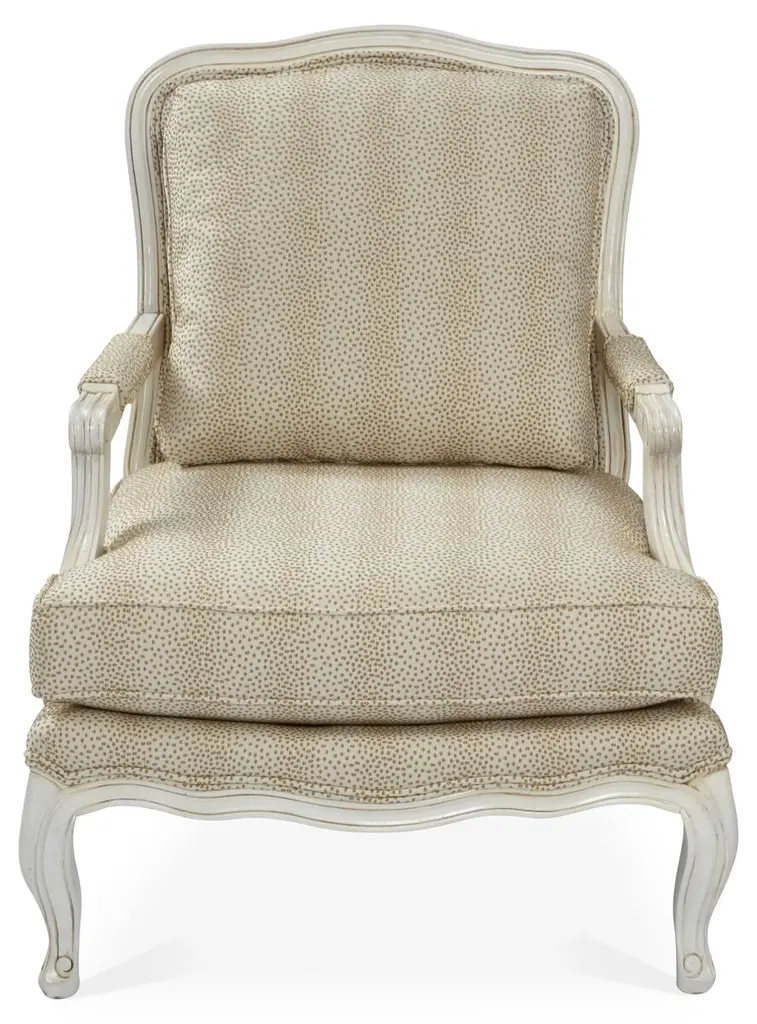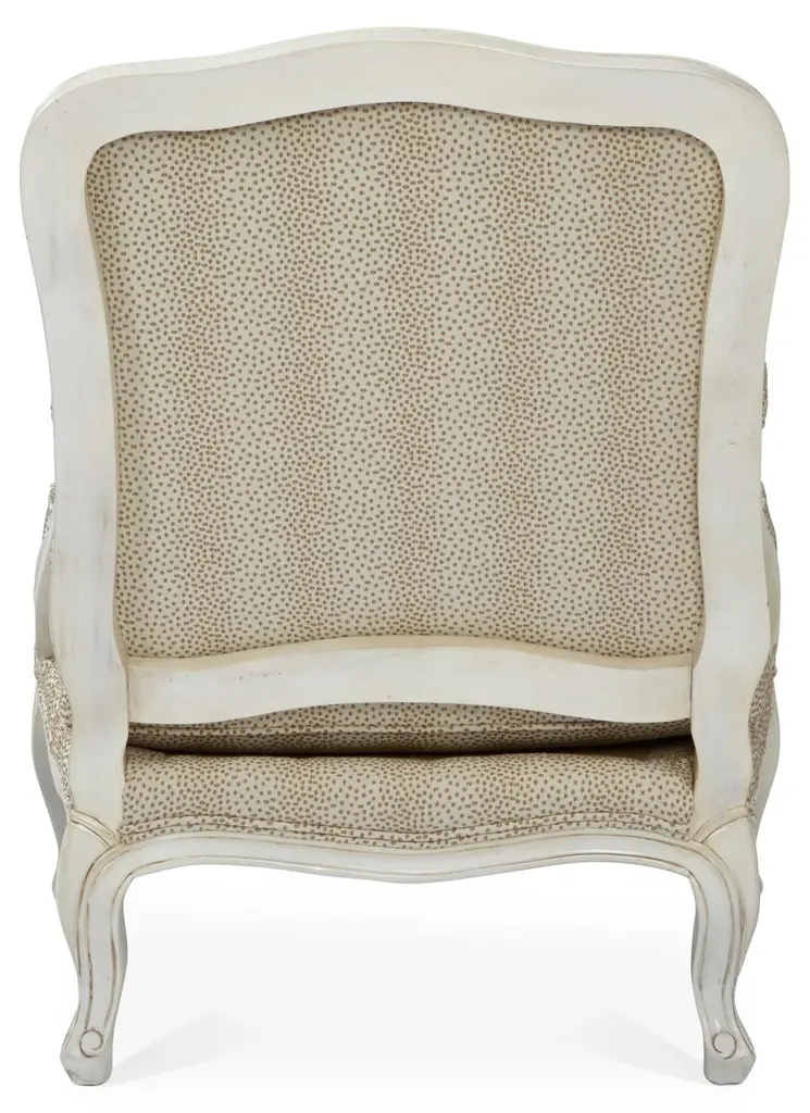Designed by us and available only at One Kings Lane: This classic bergère has lovely open arms and neutral-hued cotton-blend upholstery in a modern polka-dot motif. The seat and back are amply padded with Ultracel high-resiliency foam and premium polyester fibers and bolstered to a sturdy ivory-hued mahogany frame. A matching cushion and manchettes complete the timeless look. Made in the USA.