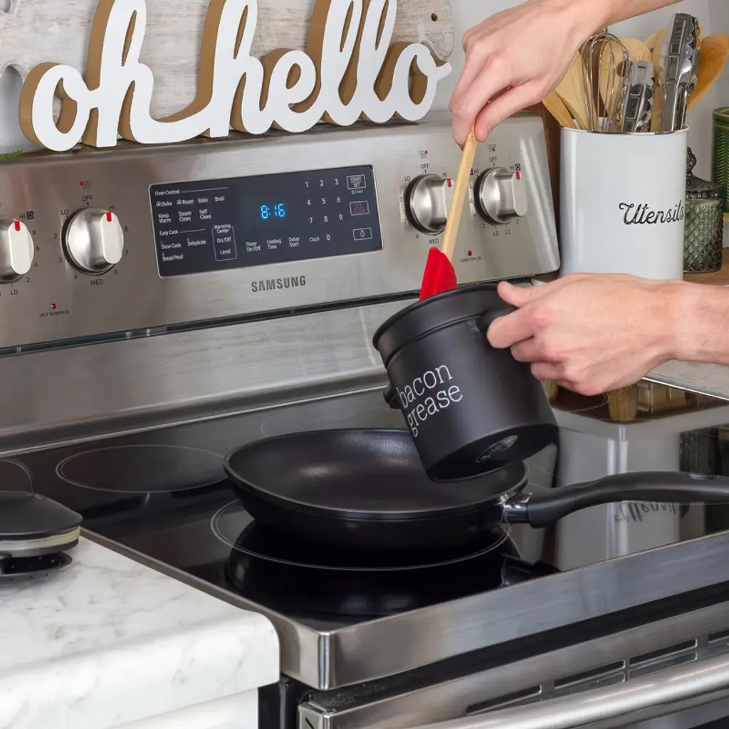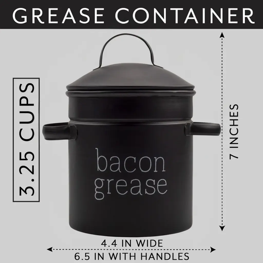 Our bacon grease and drippings keeper is both functional and charming. Easily save grease dripping with our vintage farmhouse decor style grease container. With a rustic distressed finish and print motif, this is a great reminder to folks to not put grease down the drain. Also, this item makes a great kitchen gift for the keto practitioners in your family--keep that bacon comin'! Save your grease for frying, gravy making or disposal. Our container includes a built-in strainer and a lid with a rubber seal for leakproof storage. The strainer insert has handles for easy removal. Lid includes a rubber seal. Size is 4.4 x 6.5 x 7 inches. Capacity is 3.25 cups. Hand wash.