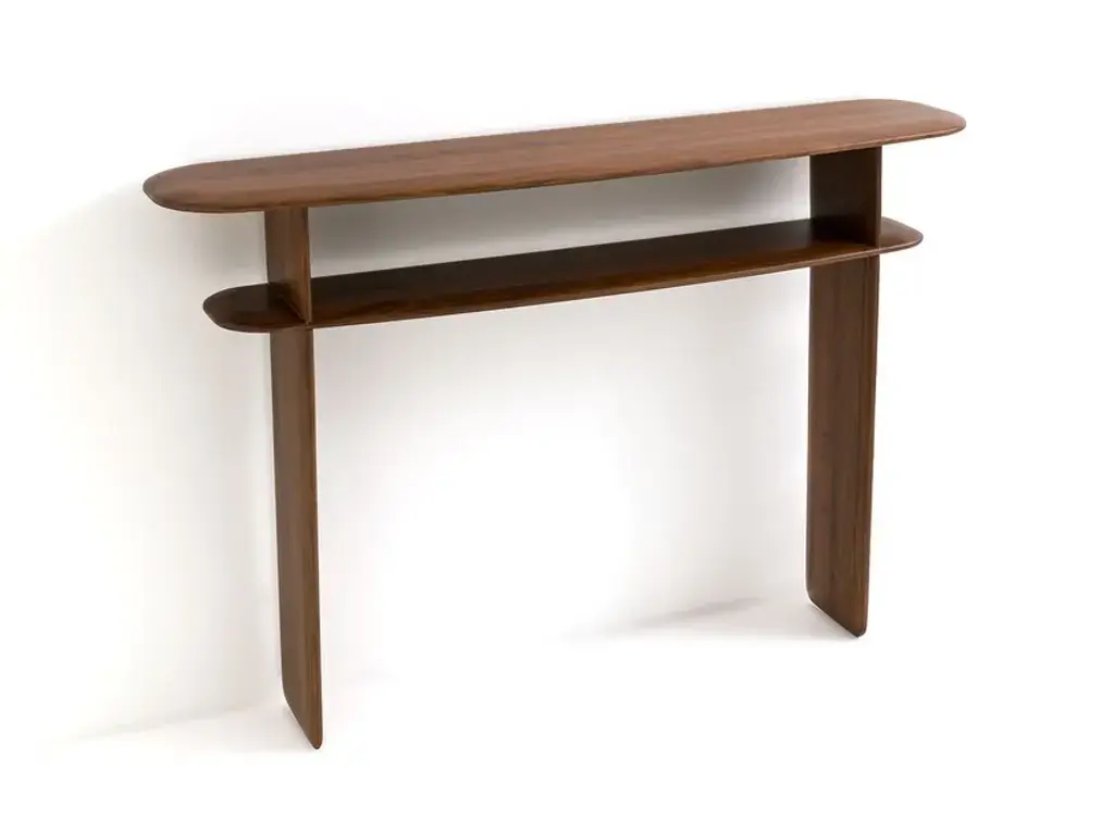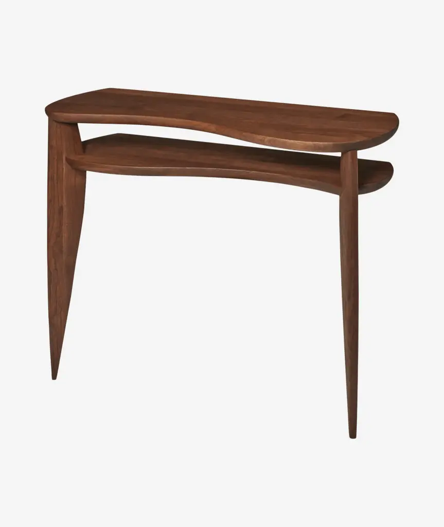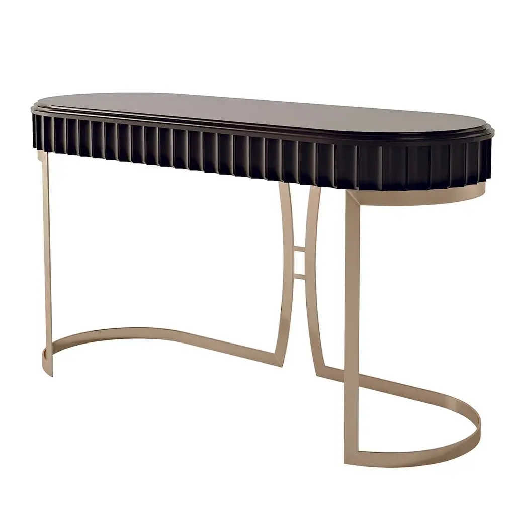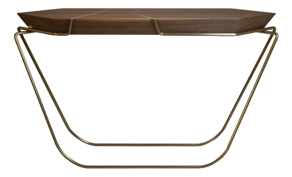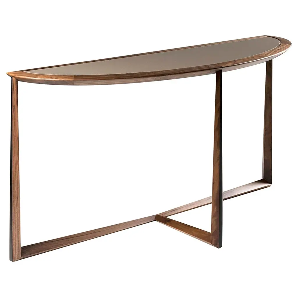 Evoking natural hues and textures, this console will be an elegant addition to an entryway, hallway or living room. Highly customizable in materials and finishes, this version features a demi-lune shaped top made of Walnut Canaletto ebony and a galvanized bronze metal structure. The latter is composed of three pairs of legs comprising two slim stems each, and a base that recalls the shape of the top. Please consult the Concierge for options of customization.