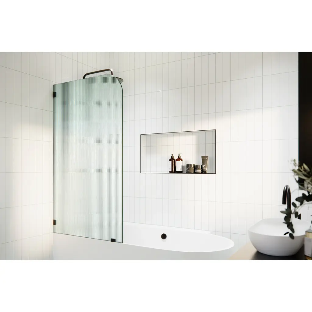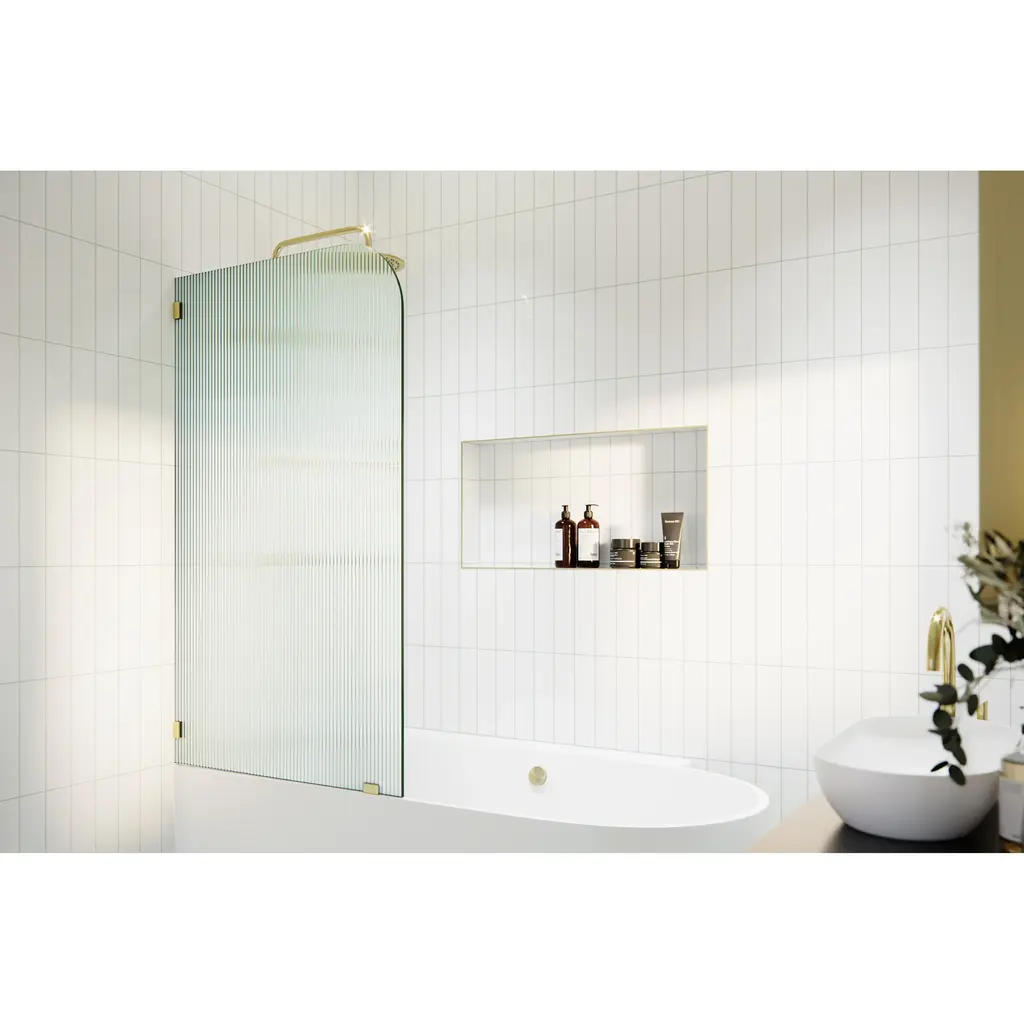 The Aurora, our elegant, fluted glass, fixed bathtub shower panel, diffuses the light in your bathroom while adding an element of privacy. Each frameless 3/8" tempered glass panel comes in a standard 58.25" height and is treated with EnduroShield coating, which aids in repelling water and soap residue. In addition, our superior quality solid brass hardware is available in a variety of color finishes to suit any bathroom. With our extensive range of fixed frameless glass panel sizes, the Aurora shower enclosure by Glass Warehouse features a classic, curved aesthetic that adds a timeless quality and a touch of old-school glamour to your bathroom. *Right-hand attachment to the wall*