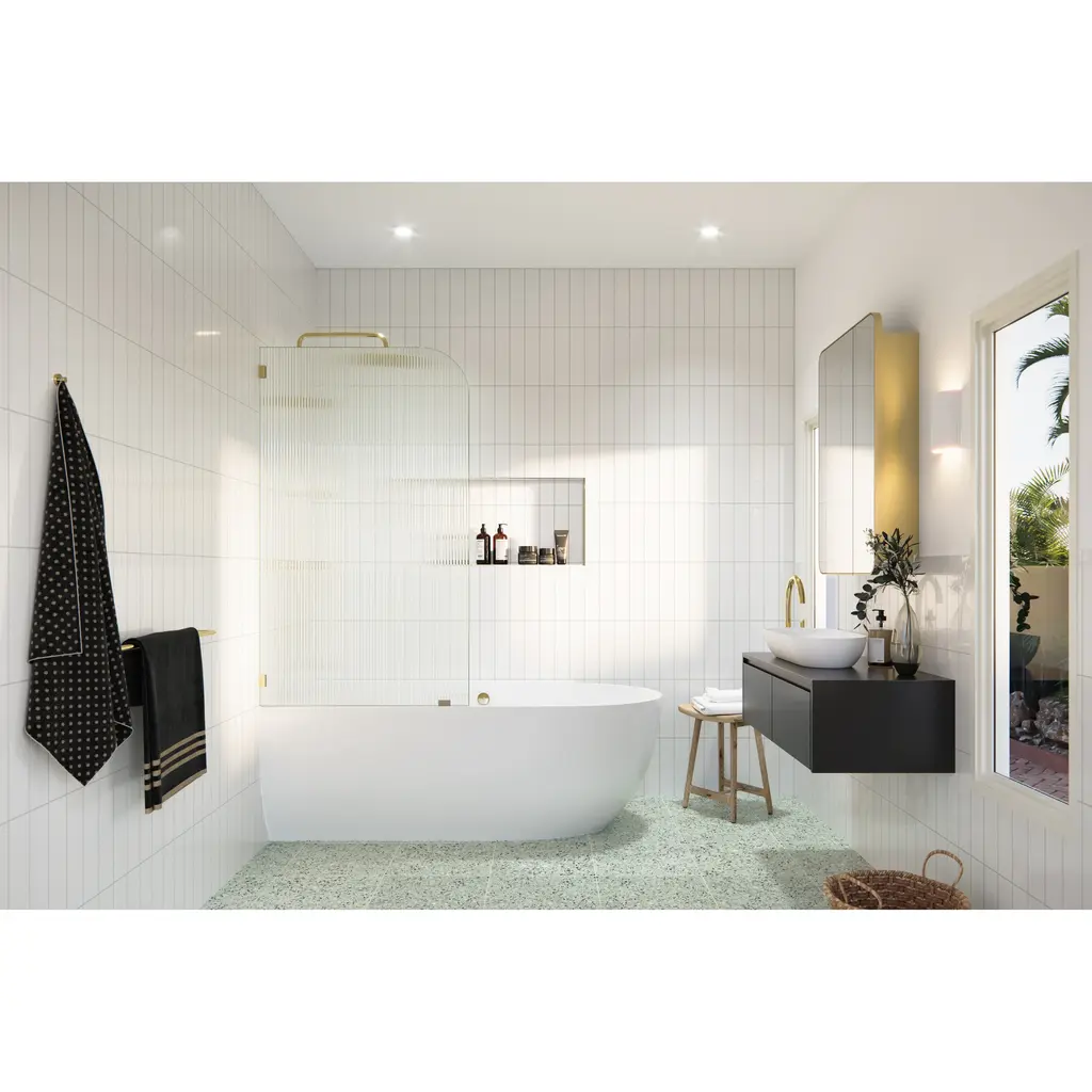 Elevate your bathroom's style and functionality with this frameless bath shower door. With its fluted frosted radius design and single fixed panel, it brings a modern touch to any bathroom decor. The brass fittings come in a variety of finishes and meet American and International Standard codes. The glass is high quality and coated with Enduroshield, making it easy to clean and maintain. Experience the durability and timeless elegance of Glass Warehouse's products with this shower door.Features: