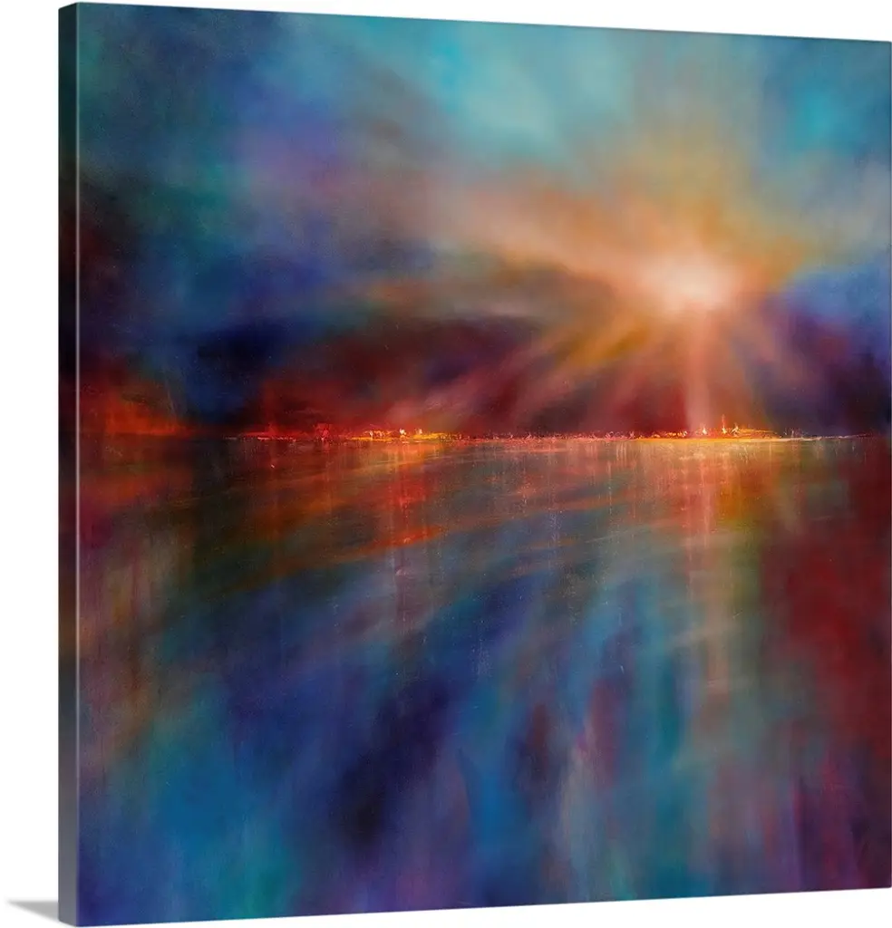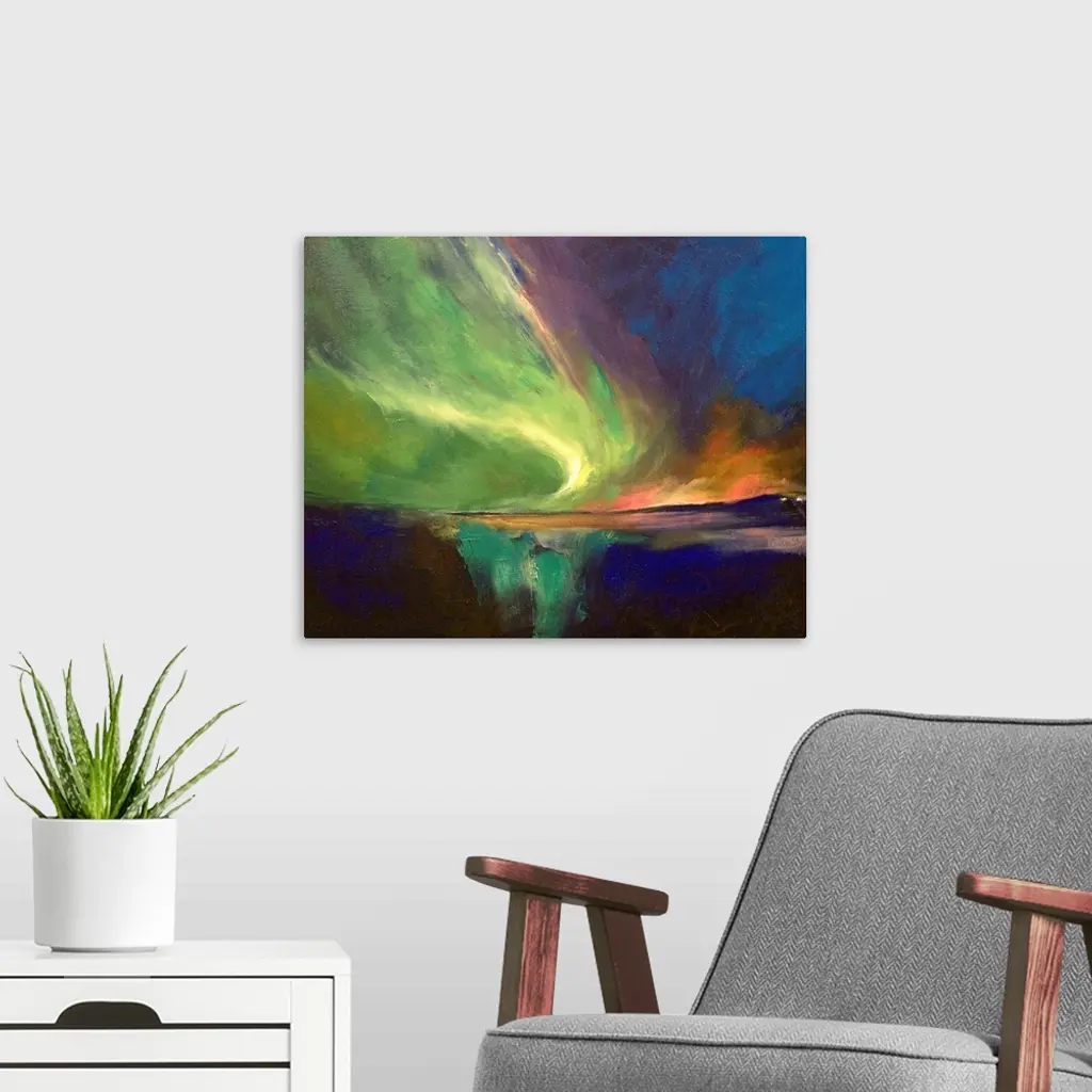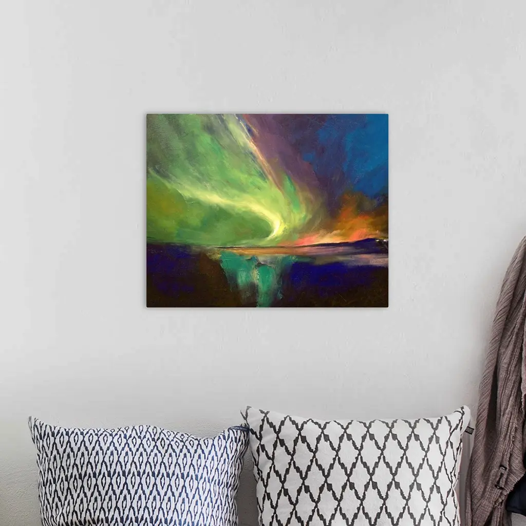 A landscape wall hanging of the Northern Lights sweeping across the night sky and reflecting in the water below.