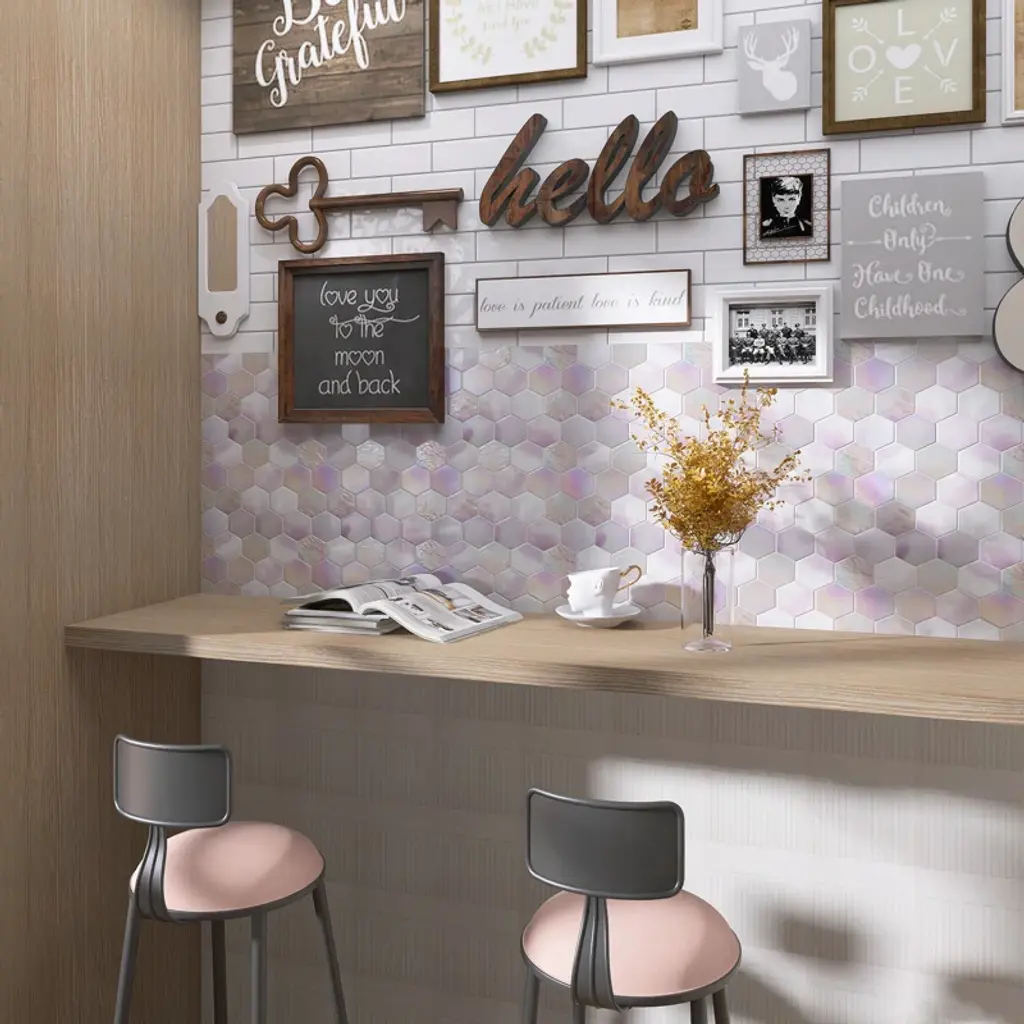 Introducing the Aurora Hexagon Glossy Glass Mosaic Tile, each sheet measuring 10.24 in. x 11.82 in., with a total coverage of 8.4 sq. ft. per case. This mosaic tile features a hexagonal pattern with a glossy finish, bringing a touch of sophistication and modernity to your interior design. The Aurora Glass Mosaic Tile allows for creative design possibilities, making it an ideal choice for adding a unique and elegant element to your living space. Enhance your walls, backsplashes, or any other area with this glass tile and enjoy the distinct beauty it brings to your home.